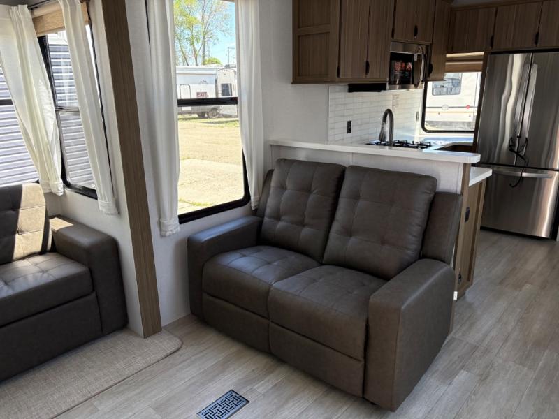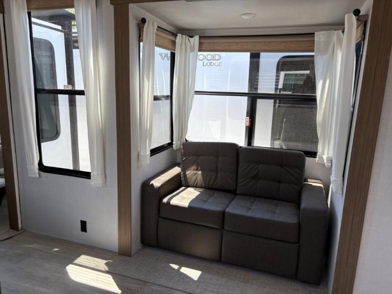 You will experience a home away from home with any one of these Forest River Wildwood Grand Lodge destination trailers! Their construction consists of a 12" forged I-beam frame, a cambered chassis, and plywood floor decking, as well as 5" bowed truss roof rafters, 3/8" roof decking, and color coded water lines to make life easier. The one-piece, seamless slides and 106" interior living room height makes for more walking around space. A Best in Class Value package includes upgraded designer furniture, a central vacuum with sweep attachment, and stainless steel kitchen appliances. Plus, it also features a heated and enclosed Accessi-Belly with removable panels and an exterior LED light strip under the awning. Come choose your favorite model today!