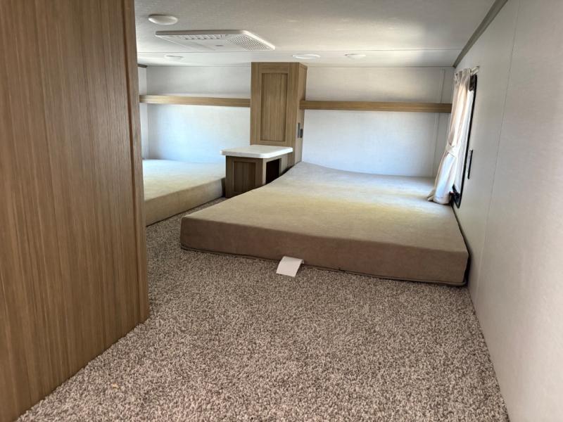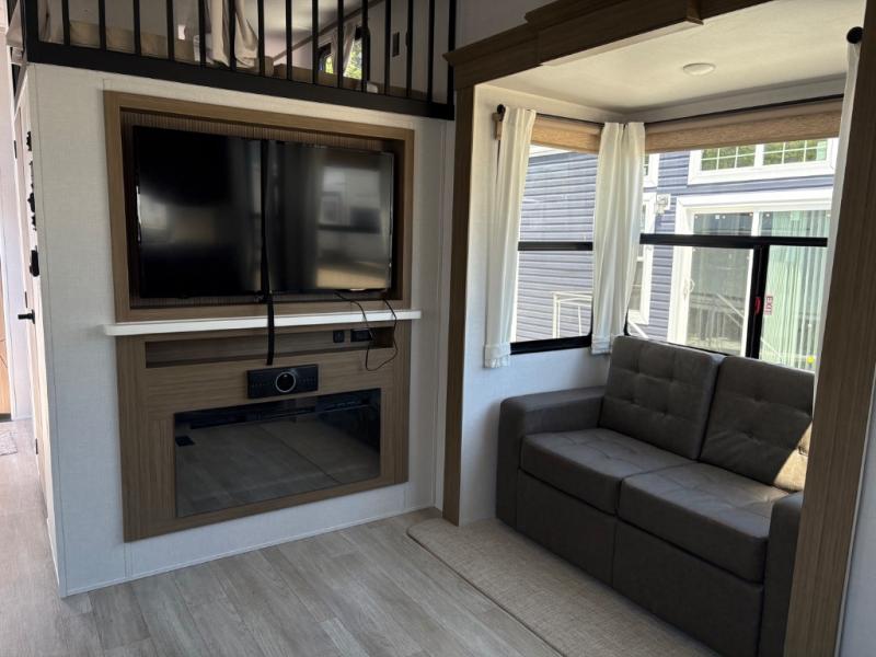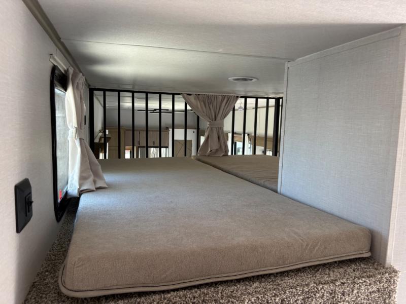 Let all of your cares go free with this Wildwood Grand Lodge destination trailer! Forget about trying to squish your family into one tiny unit because this trailer gives you space to spread out and enjoy yourself. In the central portion of this trailer, you will find a living area that has opposing sofa slides, an entertainment center, a fireplace, and even a ceiling fan. While the chef of the family is preparing dinner in the separate front kitchen, you can sit down at the free-standing table with chairs to chat with them. To keep your kids from running around on the main level while you are getting dinner ready, you can send them upstairs to the double loft where they can work on puzzles and games. They will find four bunk mats and storage, and you can sleep in your own king bed with versa-tilt in privacy in the rear bedroom with the option to add prep for a washer/dryer if you like.