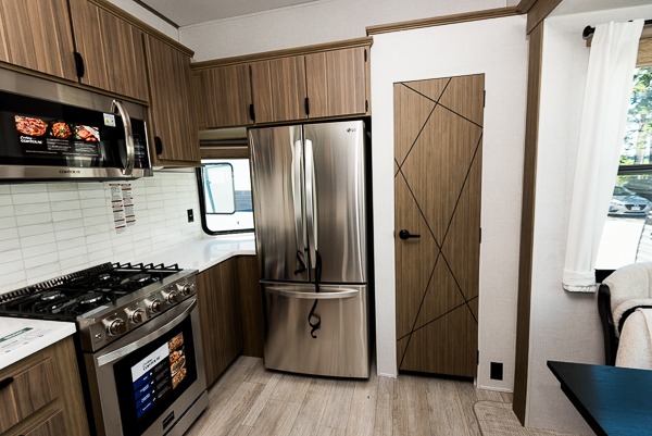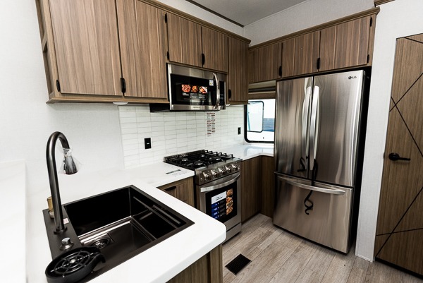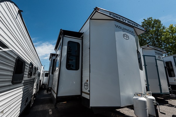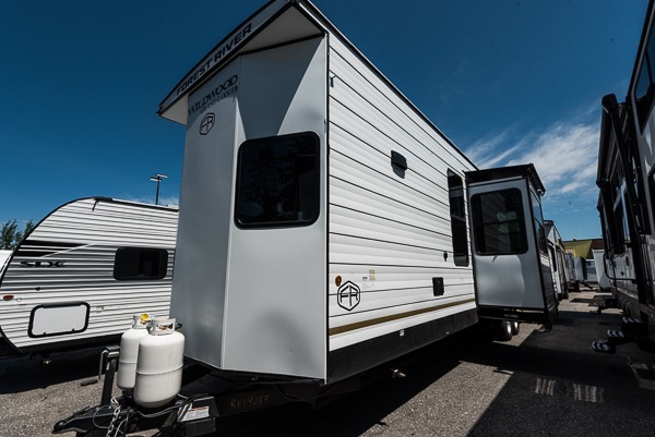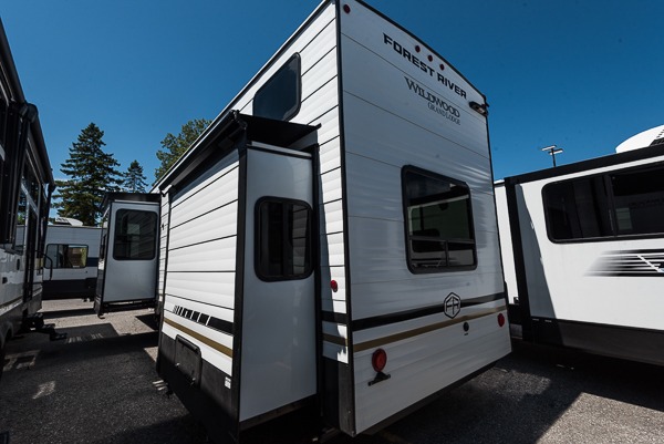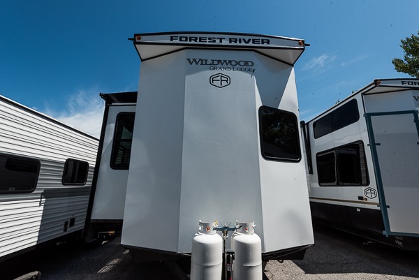 With any Wildwood Grand Lodge destination trailer by Forest River, you can enjoy extended stays wherever you go! There is 4K awning blade lighting outside, along with slide out awning toppers, plus a heated and enclosed Accessibelly for added protection. Inside, you'll love the stylish backsplash update, elegant curtain rods and curtains, TFL black walnut entertainment shelves, and stainless steel kitchen appliances. A Serta mattress in the bedroom(s) will provide comfort to each journey, and there is a tankless water heater for hot water when you need it.