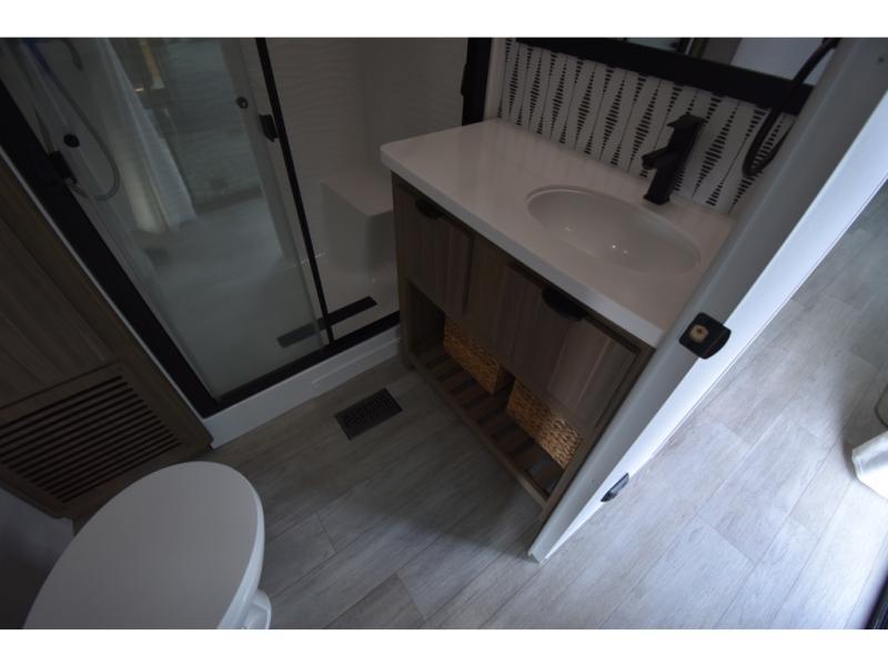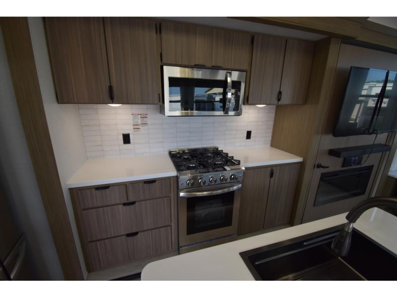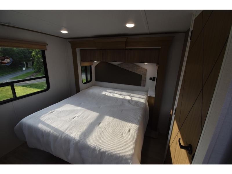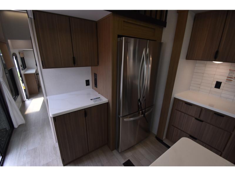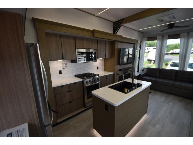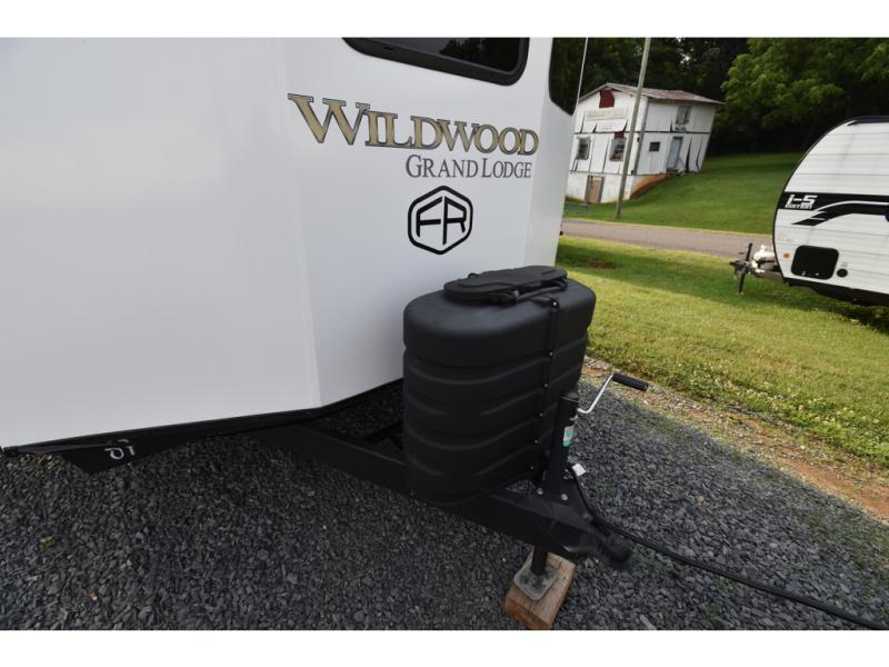 With any Wildwood Grand Lodge destination trailer by Forest River, you can enjoy extended stays wherever you go! There is 4K awning blade lighting outside, along with slide out awning toppers, plus a heated and enclosed Accessibelly for added protection. Inside, you'll love the stylish backsplash update, elegant curtain rods and curtains, TFL black walnut entertainment shelves, and stainless steel kitchen appliances. A Serta mattress in the bedroom(s) will provide comfort to each journey, and there is a tankless water heater for hot water when you need it.