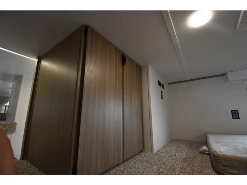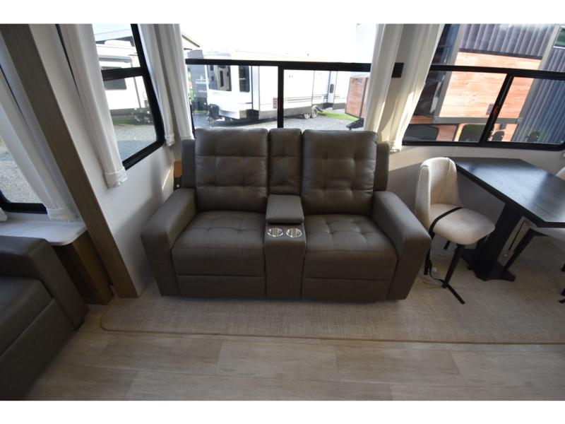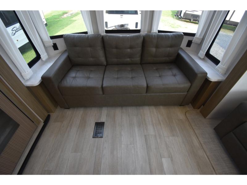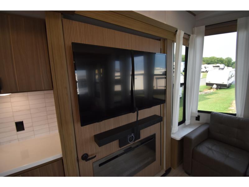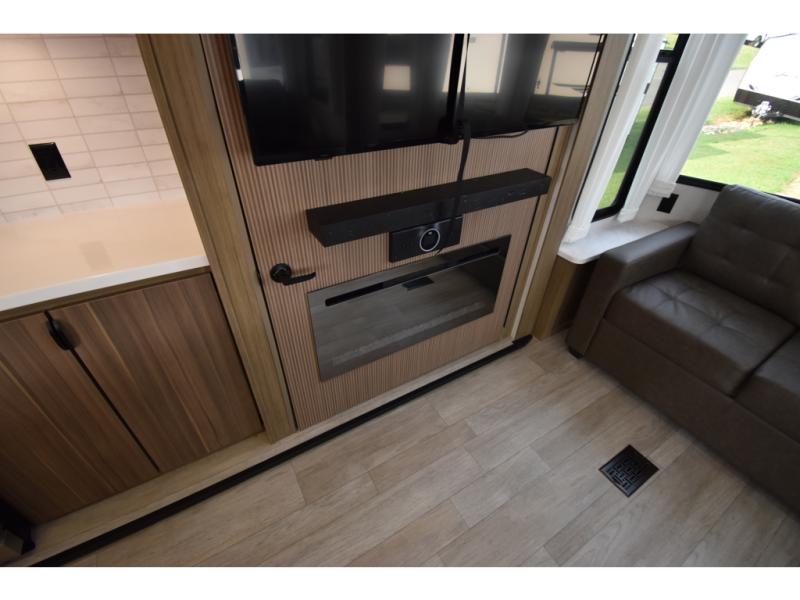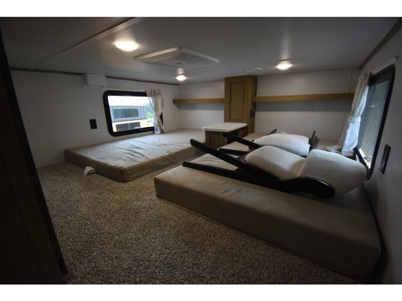 Keep your family happy by providing them with plenty of space and comforts in this Wildwood Grand Lodge destination trailer! The living area is such a gorgeous feature in this unit because of the panoramic front windows that allow you to feel as if you're right in the heart of your surroundings, and as you sit on the sofa next to the fireplace, you'll appreciate the ambiance it brings to this space. If you've decided to stay up late outside underneath the 21' awning, you can rest assured that you'll be able to get back inside quietly without waking anyone up because the second entry door leads directly into the rear private bedroom for your convenience so you can quickly fall asleep on your own king bed with versa-tilt. And the kids will love the double loft with three bunk mats and extra floor space to play.
