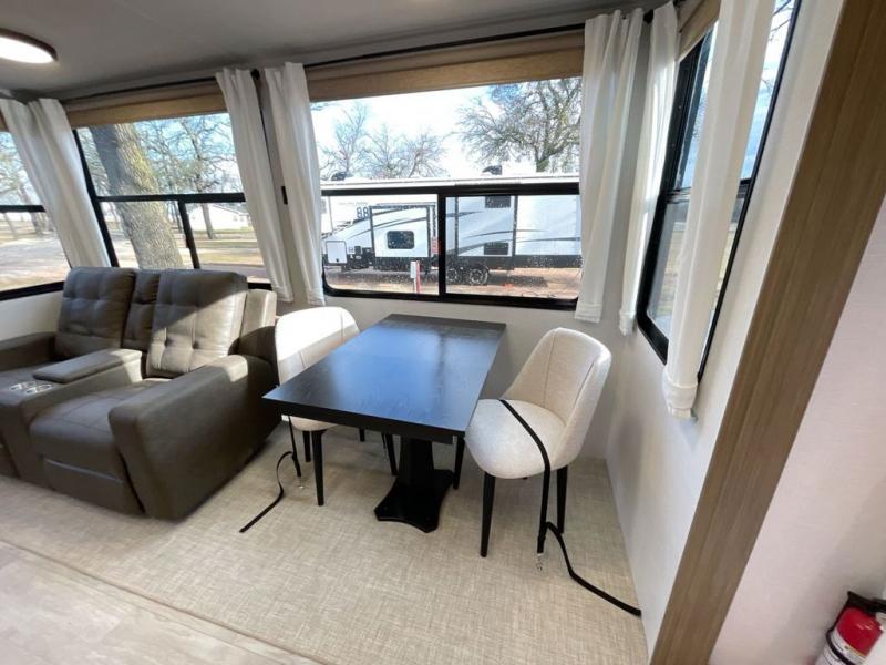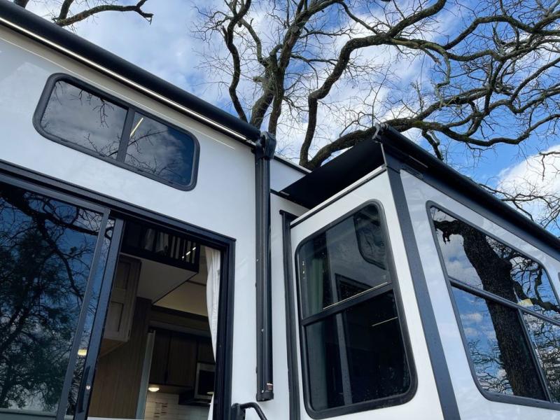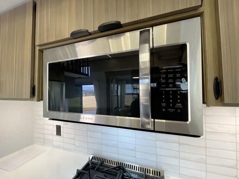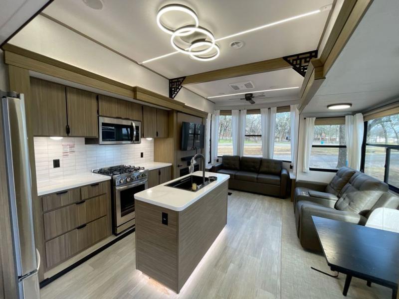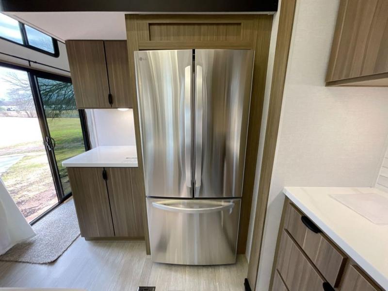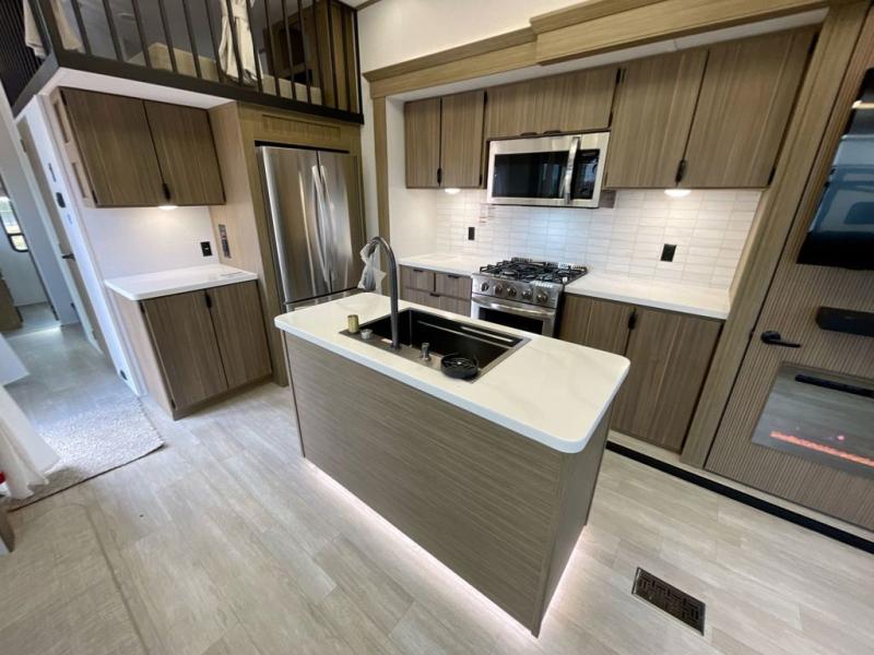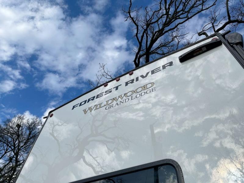 With any Wildwood Grand Lodge destination trailer by Forest River, you can enjoy extended stays wherever you go! There is 4K awning blade lighting outside, along with slide out awning toppers, plus a heated and enclosed Accessibelly for added protection. Inside, you'll love the stylish backsplash update, elegant curtain rods and curtains, TFL black walnut entertainment shelves, and stainless steel kitchen appliances. A Serta mattress in the bedroom(s) will provide comfort to each journey, and there is a tankless water heater for hot water when you need it.