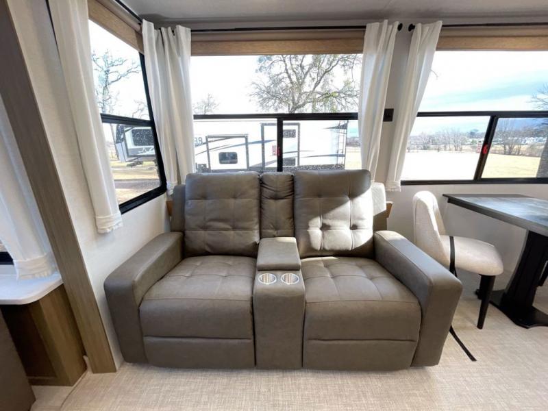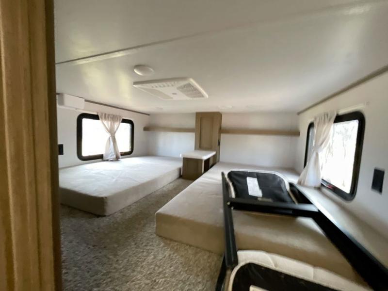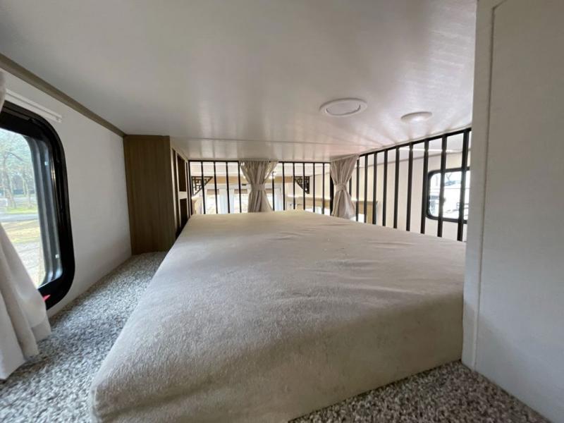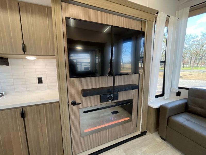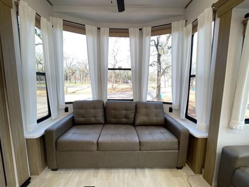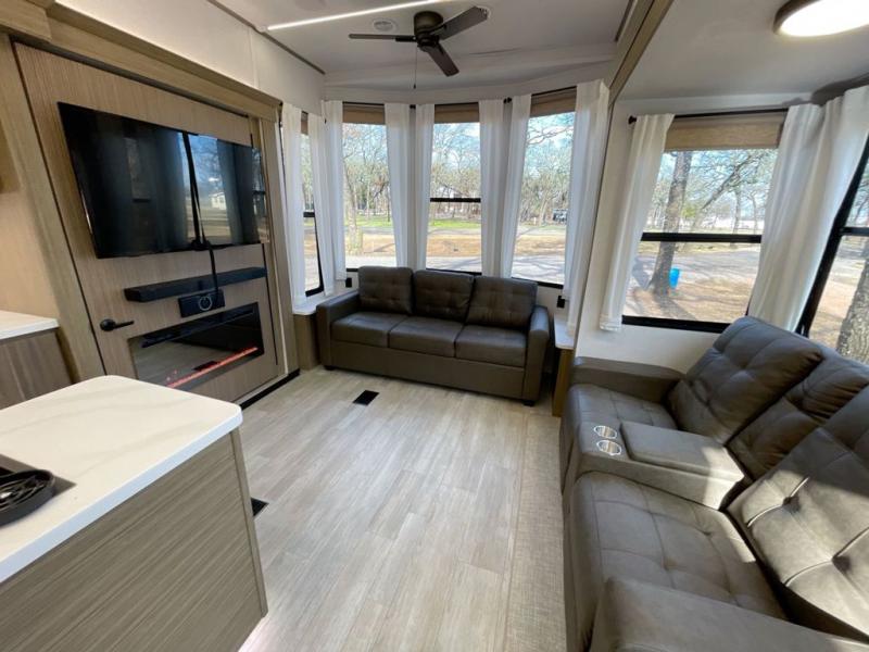 Keep your family happy by providing them with plenty of space and comforts in this Wildwood Grand Lodge destination trailer! The living area is such a gorgeous feature in this unit because of the panoramic front windows that allow you to feel as if you're right in the heart of your surroundings, and as you sit on the sofa next to the fireplace, you'll appreciate the ambiance it brings to this space. If you've decided to stay up late outside underneath the 21' awning, you can rest assured that you'll be able to get back inside quietly without waking anyone up because the second entry door leads directly into the rear private bedroom for your convenience so you can quickly fall asleep on your own king bed with versa-tilt. And the kids will love the double loft with three bunk mats and extra floor space to play.