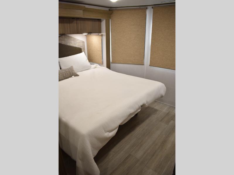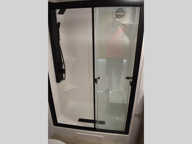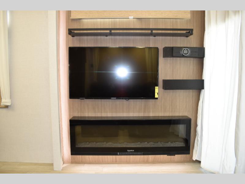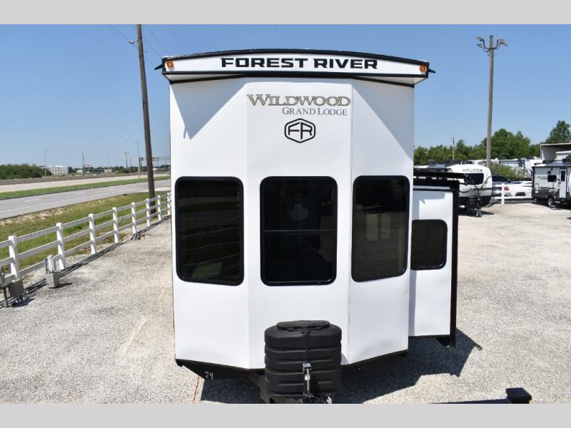 With any Wildwood Grand Lodge destination trailer by Forest River, you can enjoy extended stays wherever you go! There is 4K awning blade lighting outside, along with slide out awning toppers, plus a heated and enclosed Accessibelly for added protection. Inside, you'll love the stylish backsplash update, elegant curtain rods and curtains, TFL black walnut entertainment shelves, and stainless steel kitchen appliances. A Serta mattress in the bedroom(s) will provide comfort to each journey, and there is a tankless water heater for hot water when you need it.