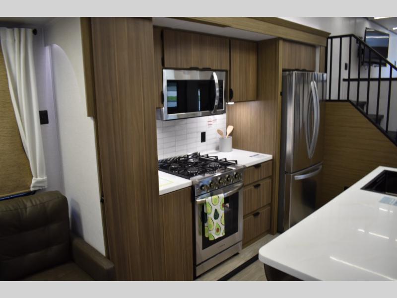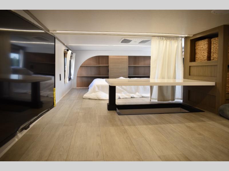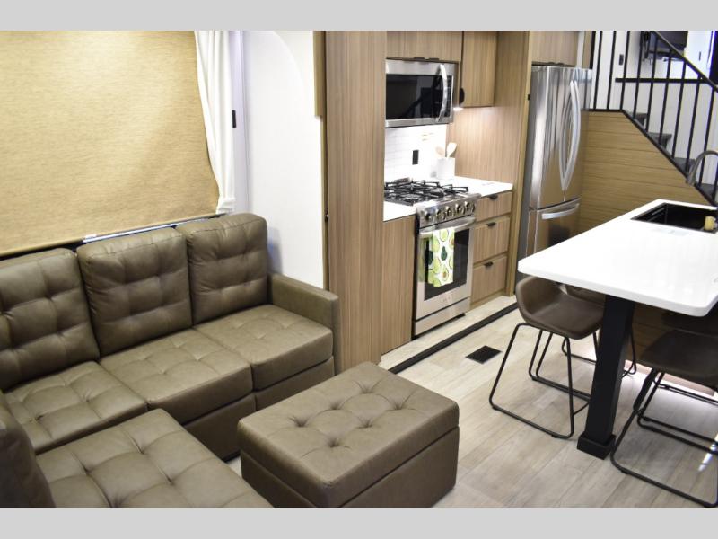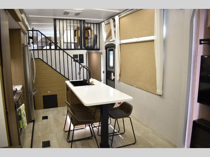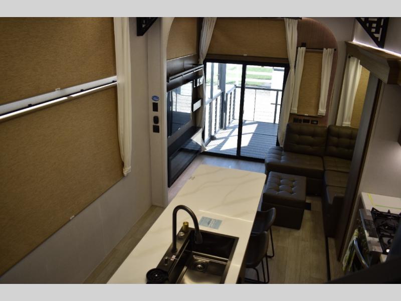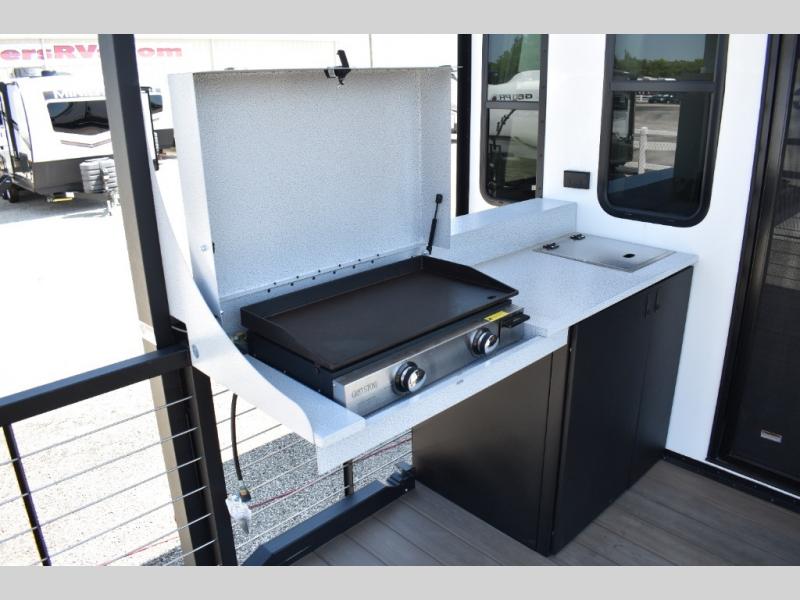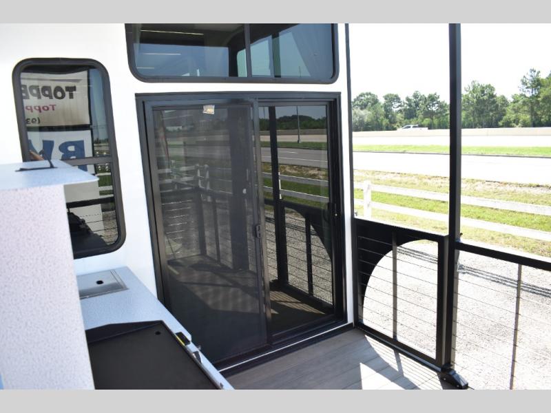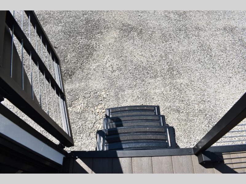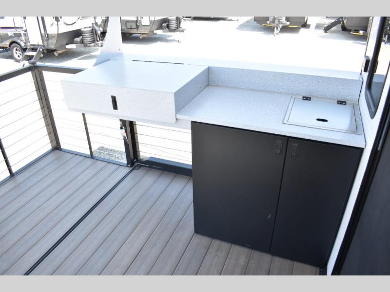 One look at this destination trailer and you'll be sold! The rear porch/veranda includes an outdoor kitchen with a cooktop and sink plus a ceiling fan so you can sit out back and visit with friends. The L-shaped sofa with an ottoman inside will provide cozy seating space, especially with the fireplace right across the room. Your crew can dine at the kitchen island with four chairs, and there is a large pantry where snacks can be kept for game night. When it's time to call it a night, the front private bedroom with a Versa-Tilt custom king bed is sure to bring comfort, and there is a dresser and wardrobe for your things. A third wardrobe includes washer and dryer prep if you choose to add those appliances. Any guests that aren't sleeping on the sofa can sleep in the loft with a queen bed, large front cabinet with shelves, and an additional cabinet for storage. You will also find a table with space below for your feet, so the kids can color, eat, and play games!