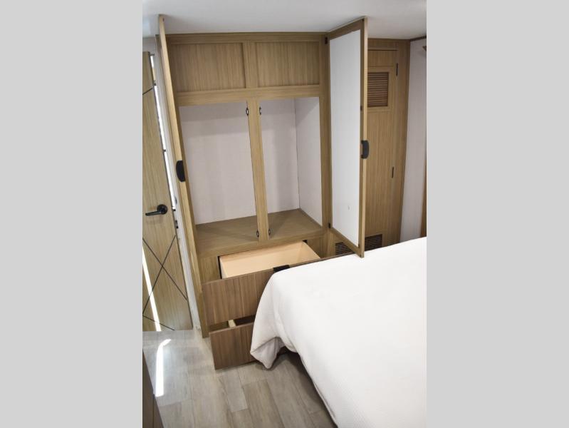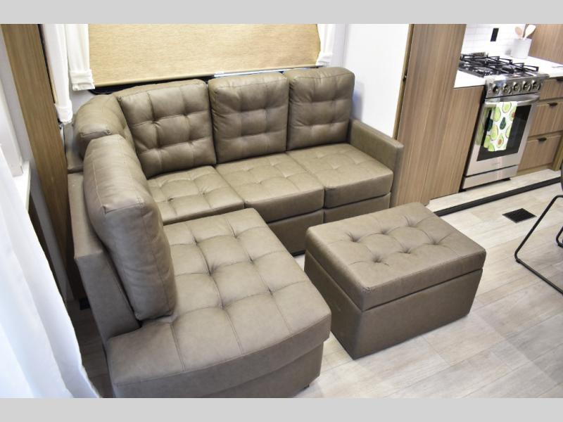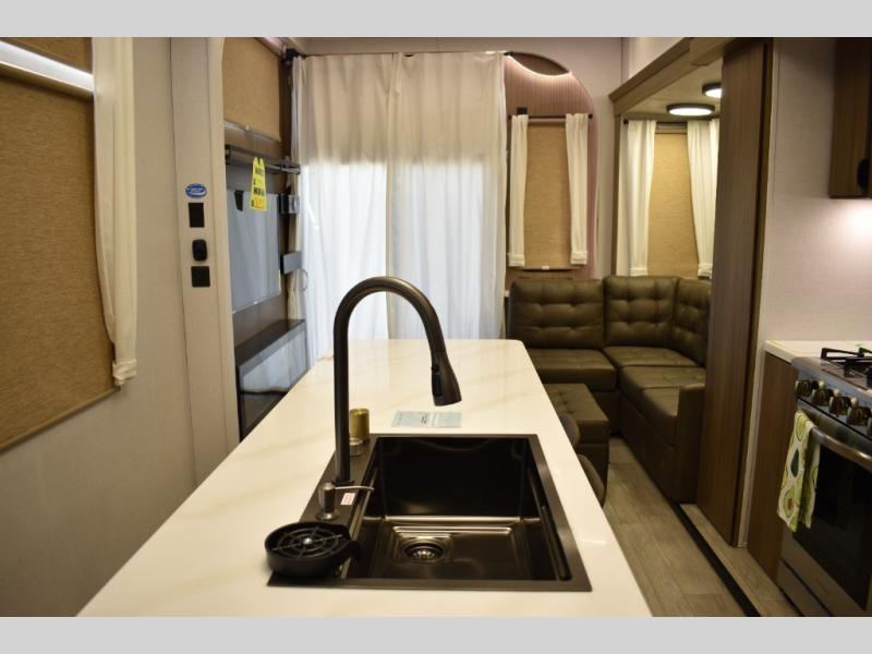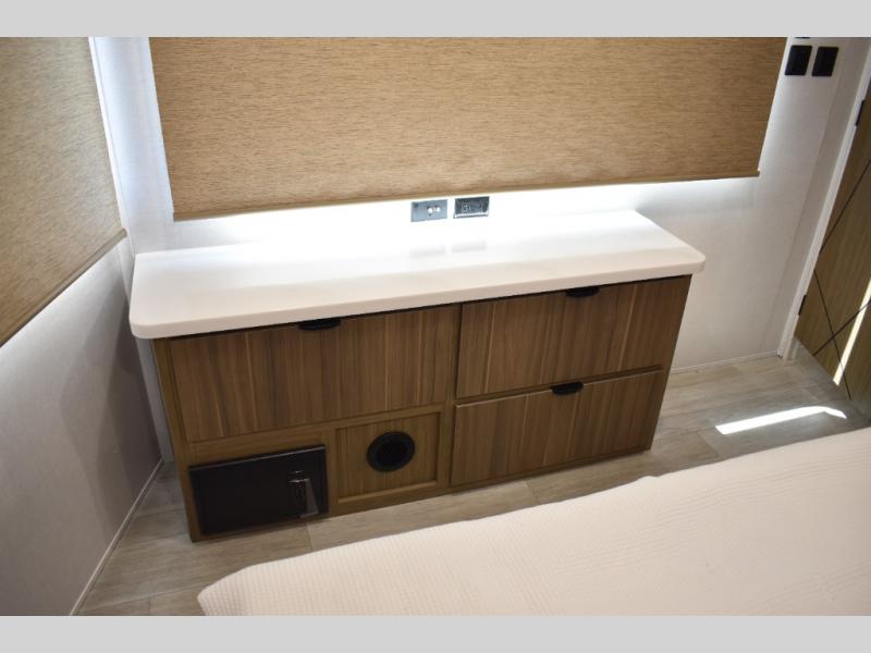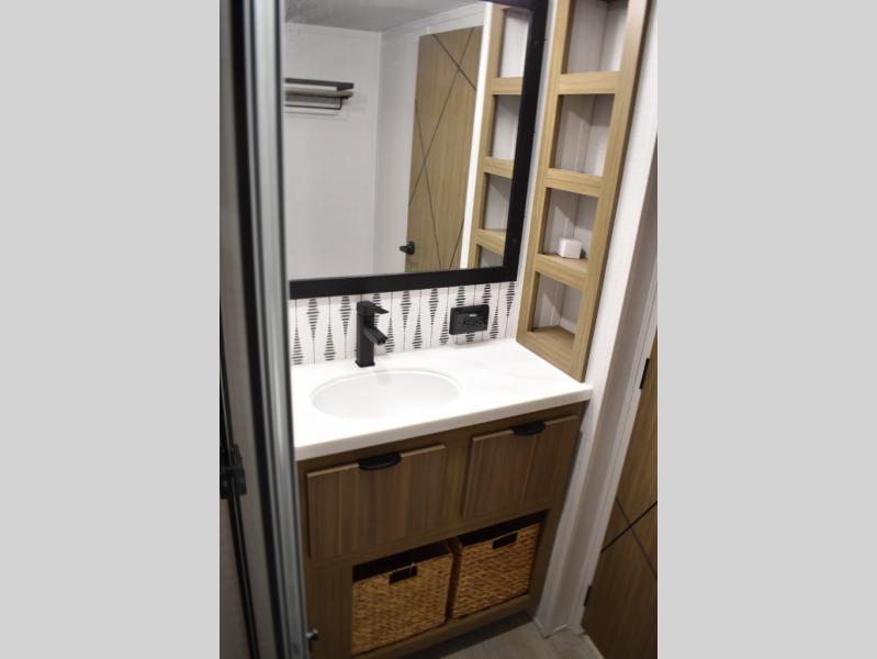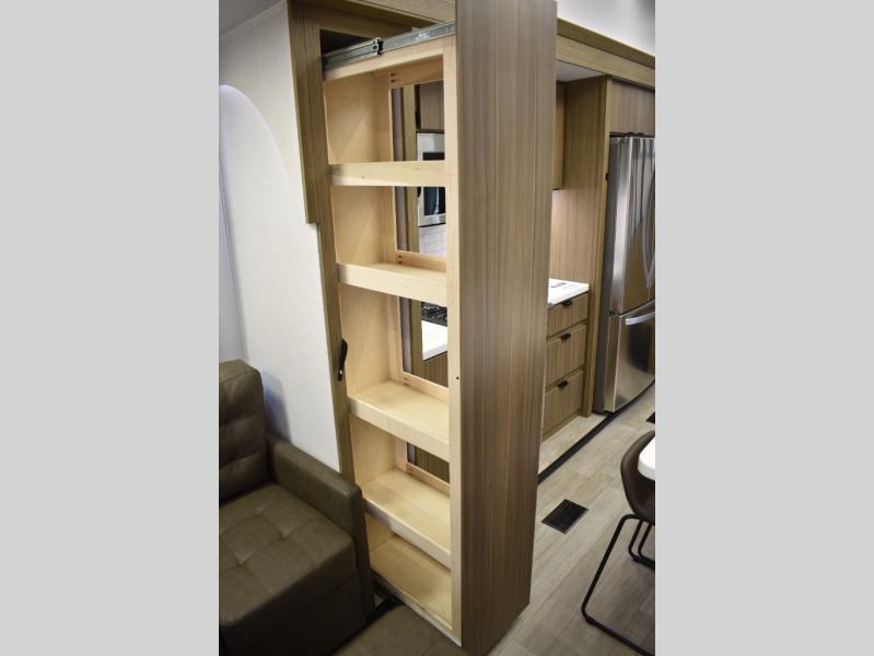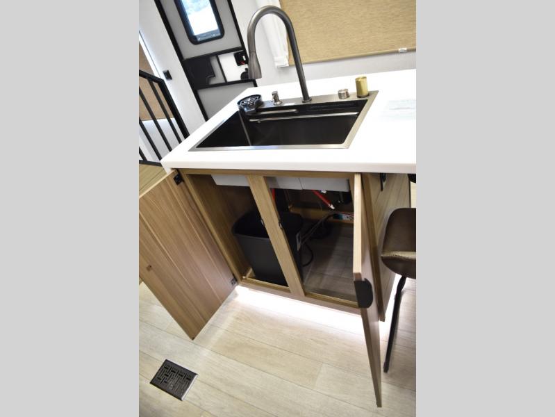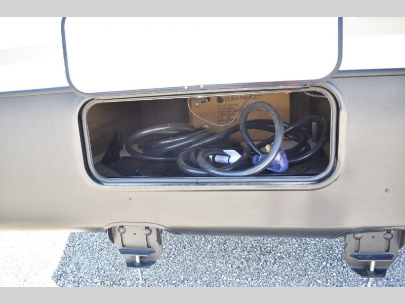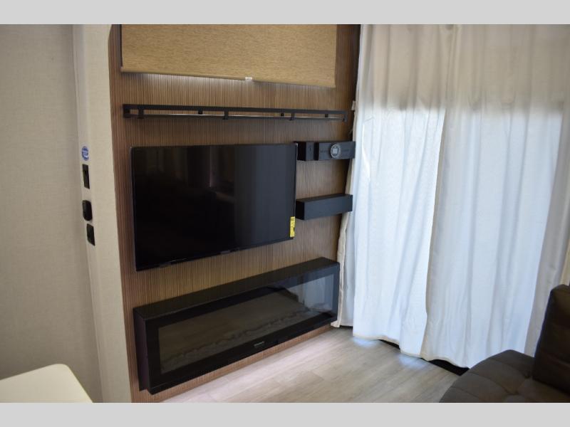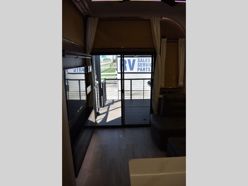 One look at this destination trailer and you'll be sold! The rear porch/veranda includes an outdoor kitchen with a cooktop and sink plus a ceiling fan so you can sit out back and visit with friends. The L-shaped sofa with an ottoman inside will provide cozy seating space, especially with the fireplace right across the room. Your crew can dine at the kitchen island with four chairs, and there is a large pantry where snacks can be kept for game night. When it's time to call it a night, the front private bedroom with a Versa-Tilt custom king bed is sure to bring comfort, and there is a dresser and wardrobe for your things. A third wardrobe includes washer and dryer prep if you choose to add those appliances. Any guests that aren't sleeping on the sofa can sleep in the loft with a queen bed, large front cabinet with shelves, and an additional cabinet for storage. You will also find a table with space below for your feet, so the kids can color, eat, and play games!
