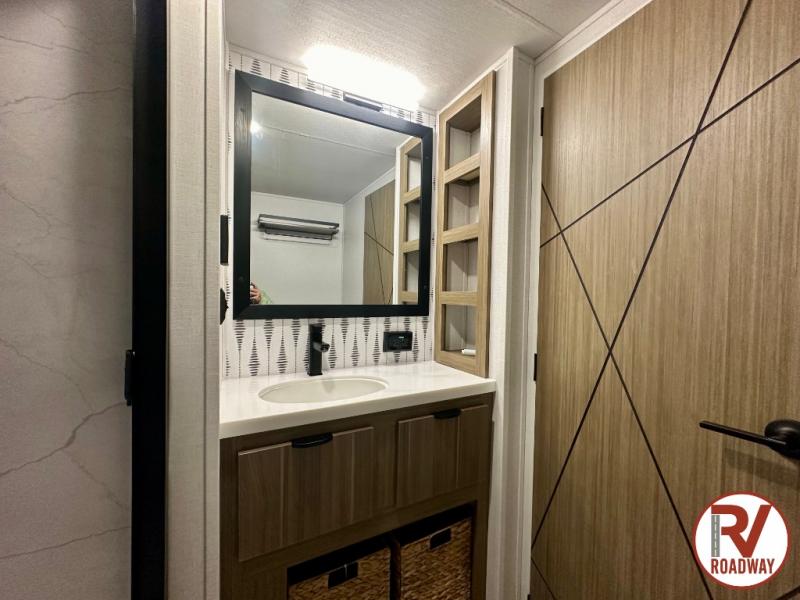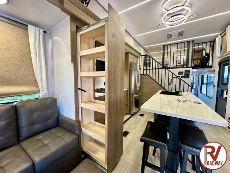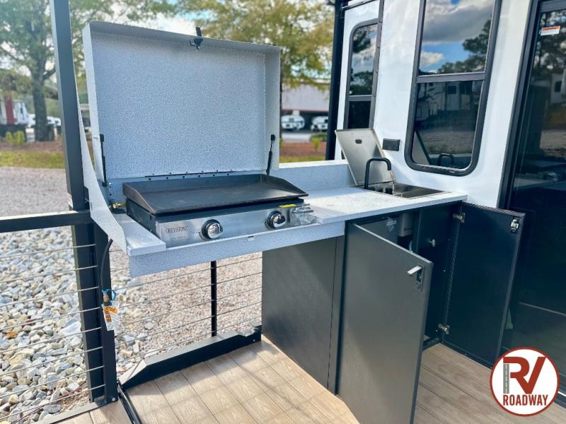 One look at this destination trailer and you'll be sold! The rear porch/veranda includes an outdoor kitchen with a cooktop and sink plus a ceiling fan so you can sit out back and visit with friends. The L-shaped sofa with an ottoman inside will provide cozy seating space, especially with the fireplace right across the room. Your crew can dine at the kitchen island with four chairs, and there is a large pantry where snacks can be kept for game night. When it's time to call it a night, the front private bedroom with a Versa-Tilt custom king bed is sure to bring comfort, and there is a dresser and wardrobe for your things. A third wardrobe includes washer and dryer prep if you choose to add those appliances. Any guests that aren't sleeping on the sofa can sleep in the loft with a queen bed, large front cabinet with shelves, and an additional cabinet for storage. You will also find a table with space below for your feet, so the kids can color, eat, and play games!