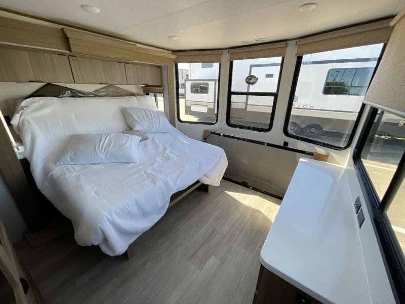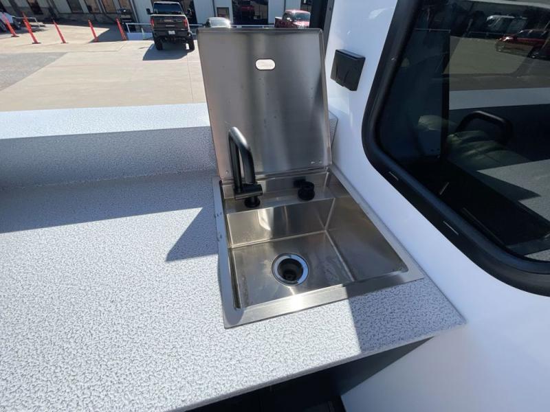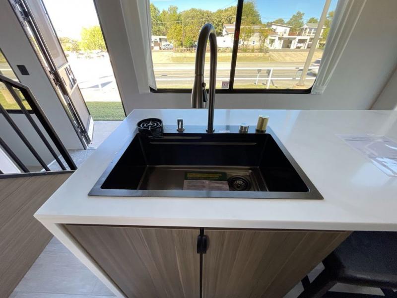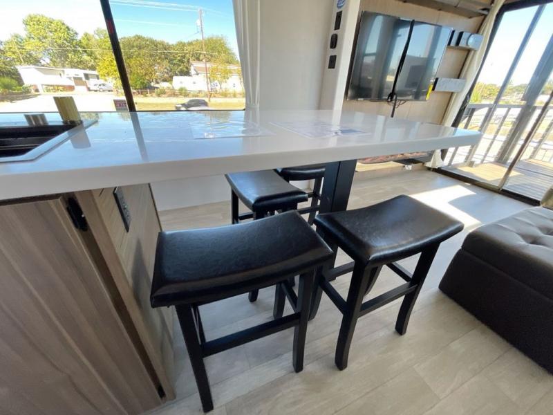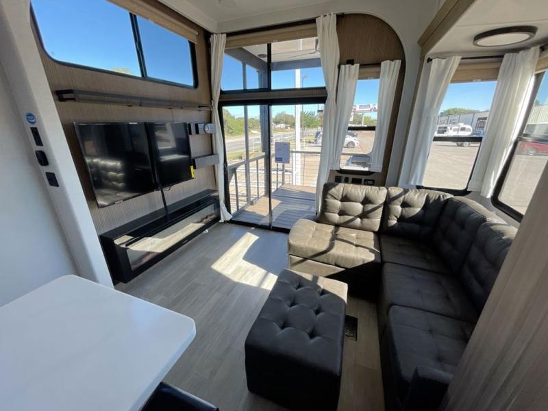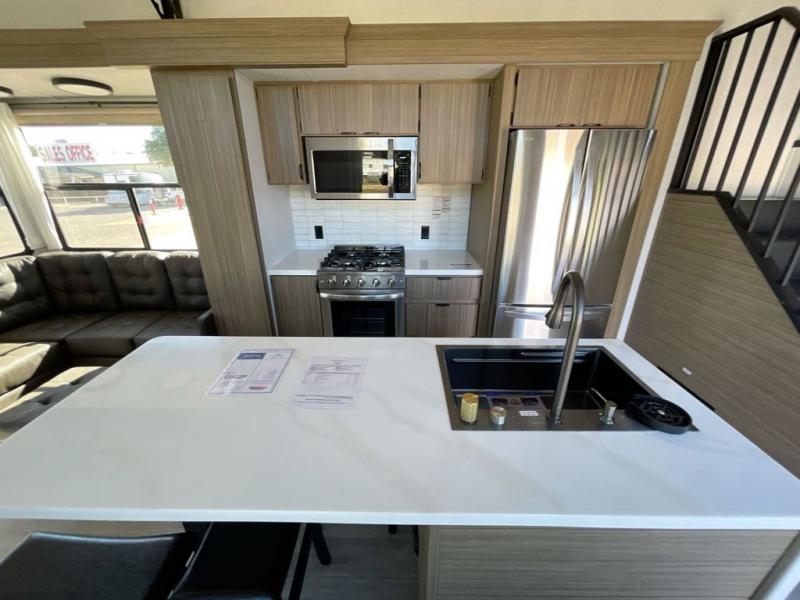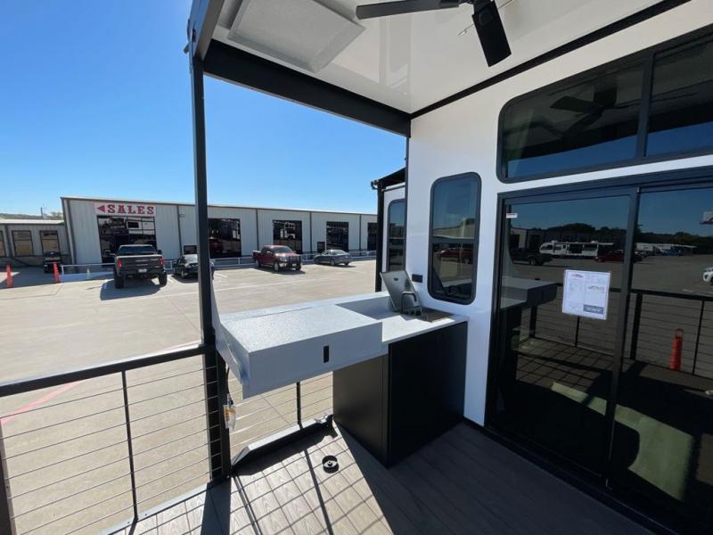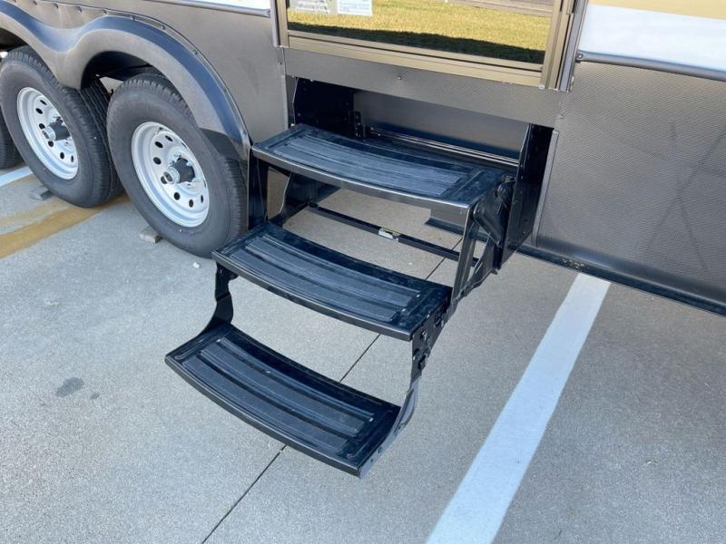 One look at this destination trailer and you'll be sold! The rear porch/veranda includes an outdoor kitchen with a cooktop and sink plus a ceiling fan so you can sit out back and visit with friends. The L-shaped sofa with an ottoman inside will provide cozy seating space, especially with the fireplace right across the room. Your crew can dine at the kitchen island with four chairs, and there is a large pantry where snacks can be kept for game night. When it's time to call it a night, the front private bedroom with a Versa-Tilt custom king bed is sure to bring comfort, and there is a dresser and wardrobe for your things. A third wardrobe includes washer and dryer prep if you choose to add those appliances. Any guests that aren't sleeping on the sofa can sleep in the loft with a queen bed, large front cabinet with shelves, and an additional cabinet for storage. You will also find a table with space below for your feet, so the kids can color, eat, and play games!