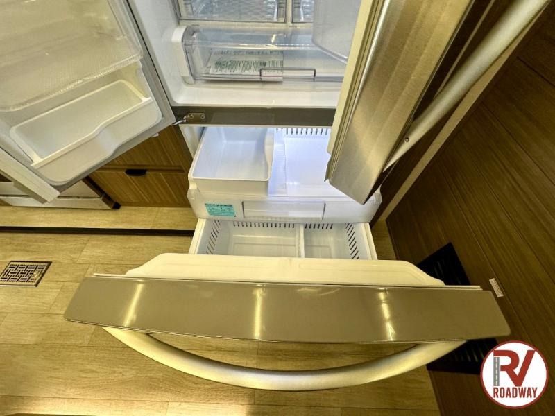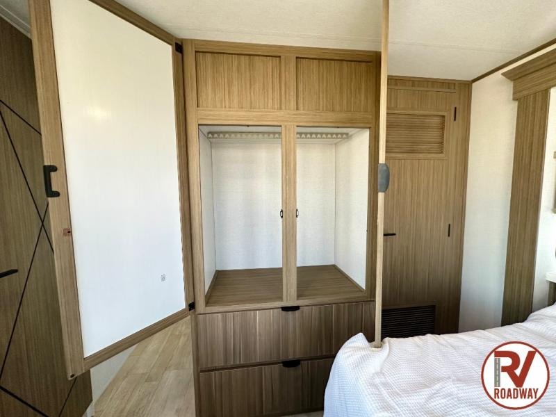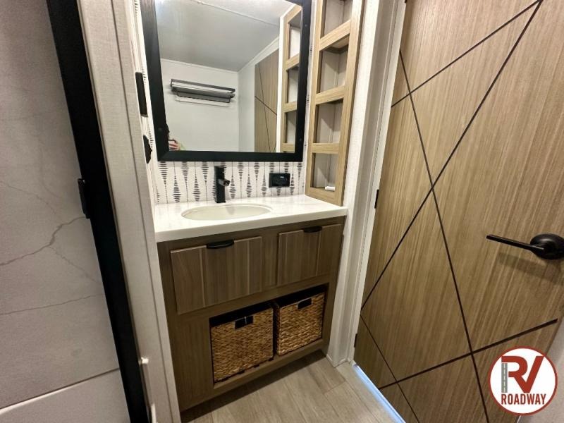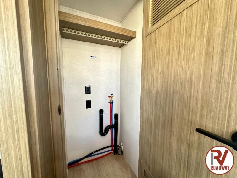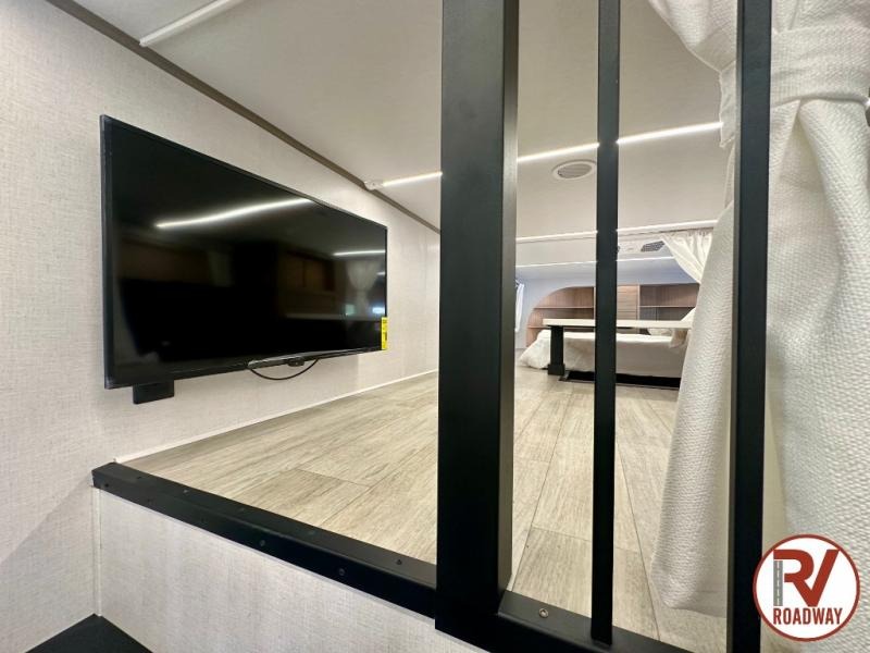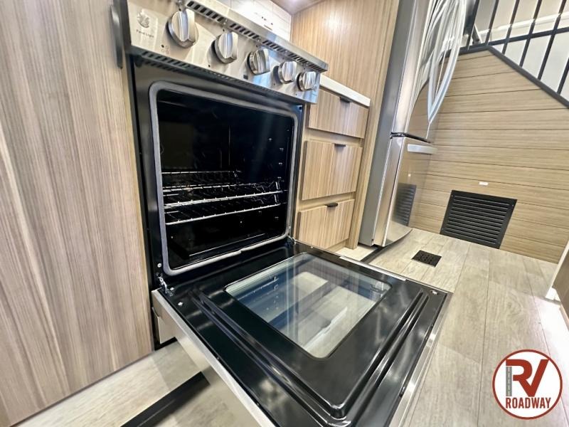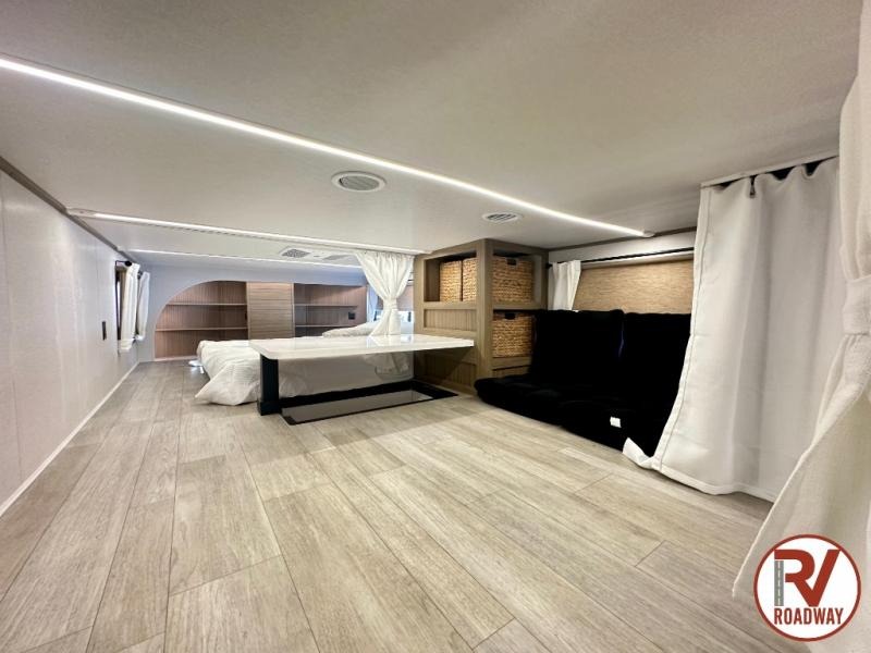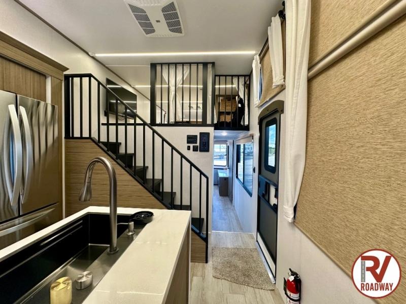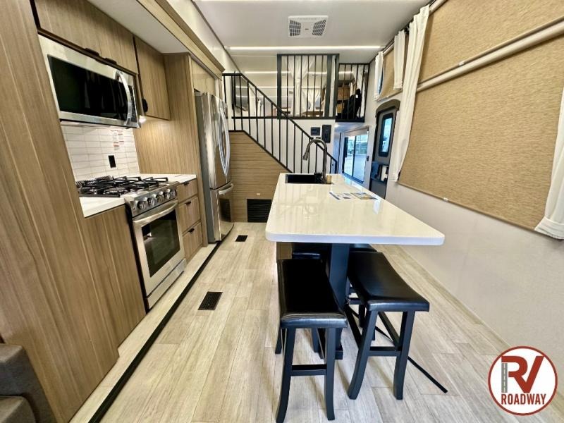 One look at this destination trailer and you'll be sold! The rear porch/veranda includes an outdoor kitchen with a cooktop and sink plus a ceiling fan so you can sit out back and visit with friends. The L-shaped sofa with an ottoman inside will provide cozy seating space, especially with the fireplace right across the room. Your crew can dine at the kitchen island with four chairs, and there is a large pantry where snacks can be kept for game night. When it's time to call it a night, the front private bedroom with a Versa-Tilt custom king bed is sure to bring comfort, and there is a dresser and wardrobe for your things. A third wardrobe includes washer and dryer prep if you choose to add those appliances. Any guests that aren't sleeping on the sofa can sleep in the loft with a queen bed, large front cabinet with shelves, and an additional cabinet for storage. You will also find a table with space below for your feet, so the kids can color, eat, and play games!