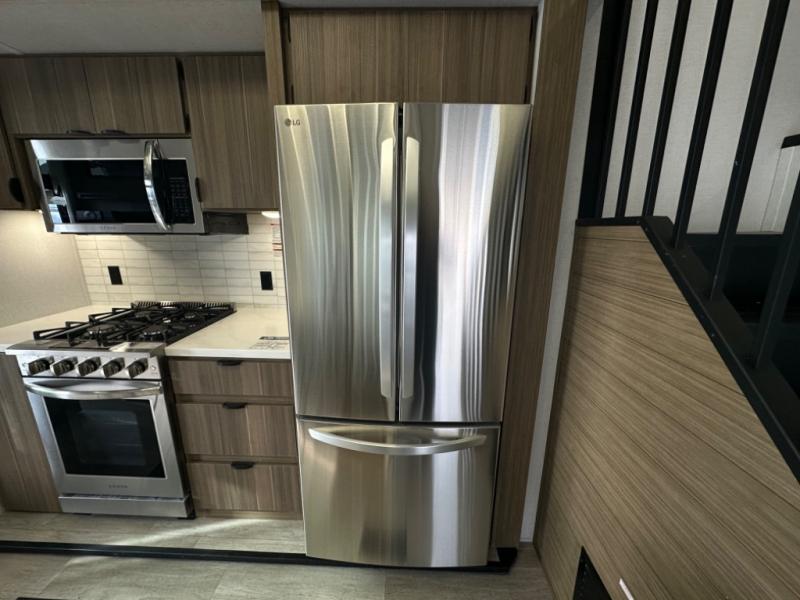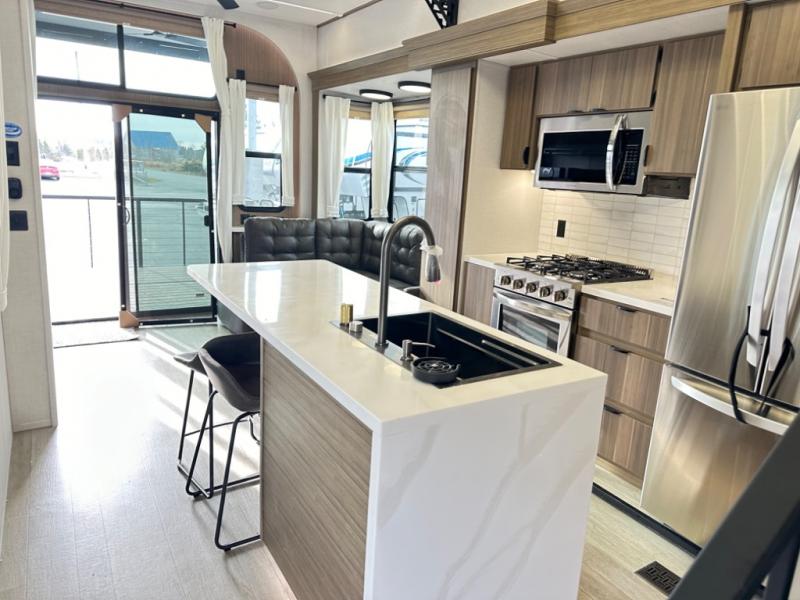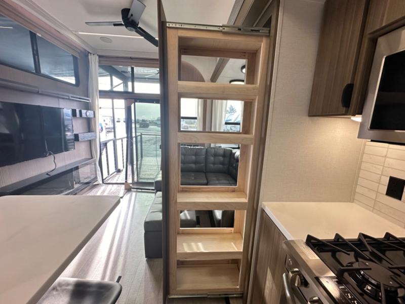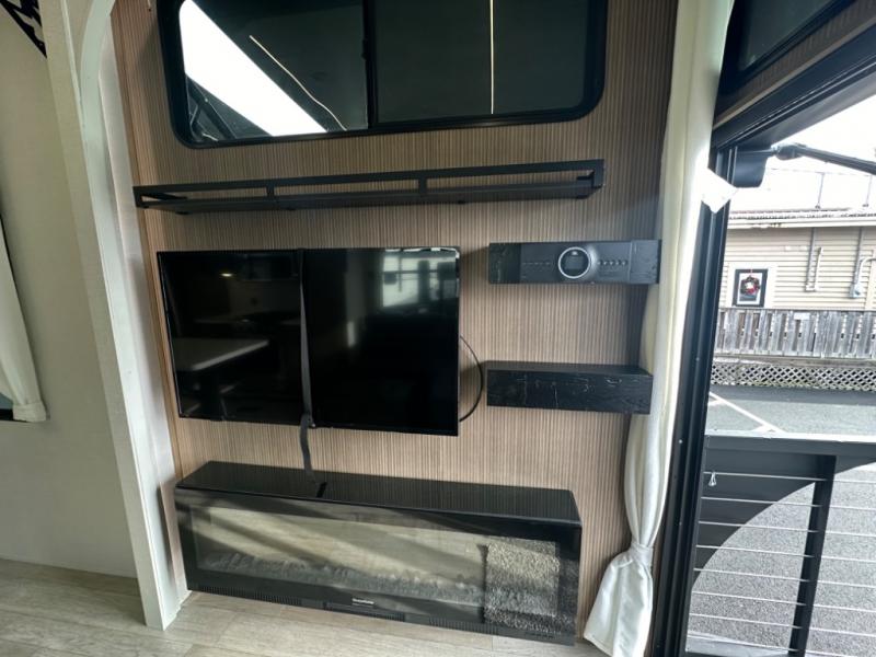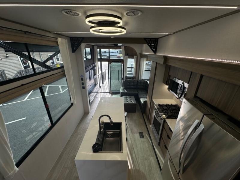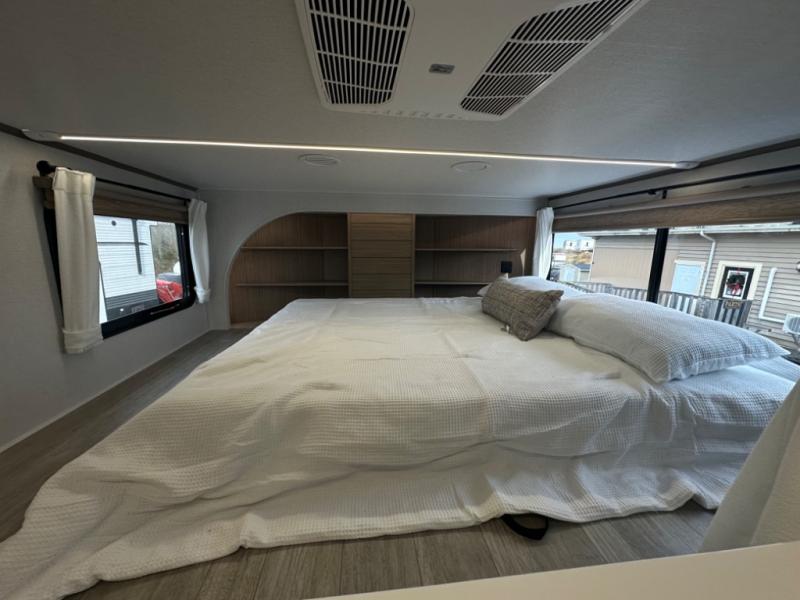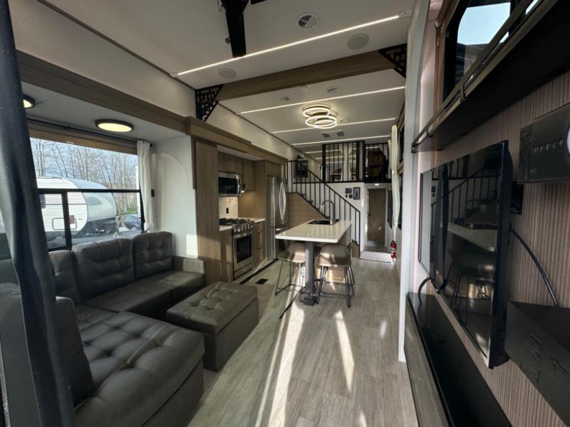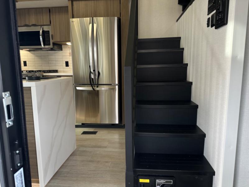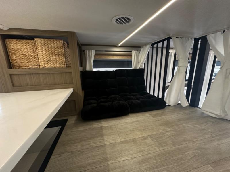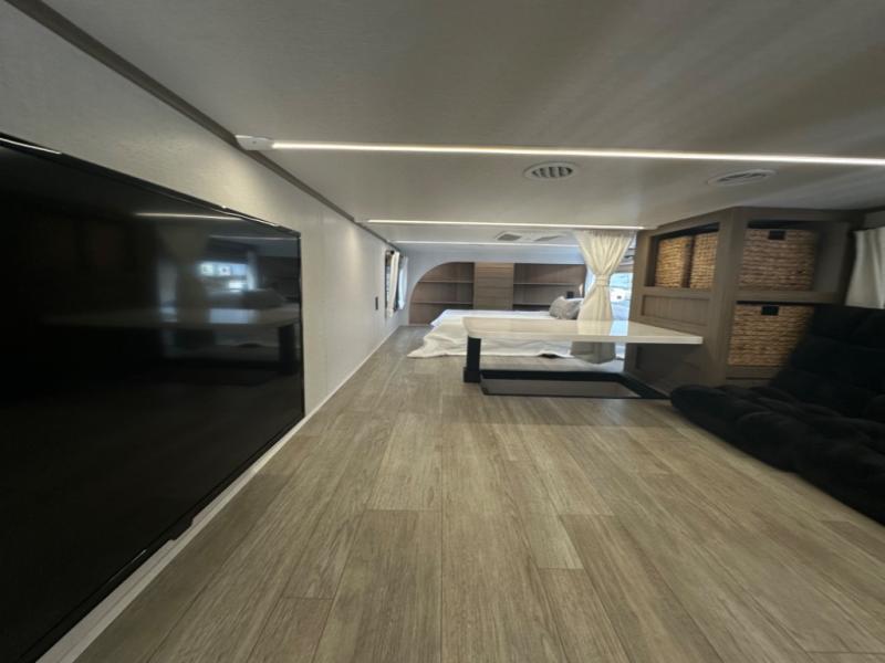 One look at this destination trailer and you'll be sold! The rear porch/veranda includes an outdoor kitchen with a cooktop and sink plus a ceiling fan so you can sit out back and visit with friends. The L-shaped sofa with an ottoman inside will provide cozy seating space, especially with the fireplace right across the room. Your crew can dine at the kitchen island with four chairs, and there is a large pantry where snacks can be kept for game night. When it's time to call it a night, the front private bedroom with a Versa-Tilt custom king bed is sure to bring comfort, and there is a dresser and wardrobe for your things. A third wardrobe includes washer and dryer prep if you choose to add those appliances. Any guests that aren't sleeping on the sofa can sleep in the loft with a queen bed, large front cabinet with shelves, and an additional cabinet for storage. You will also find a table with space below for your feet, so the kids can color, eat, and play games!