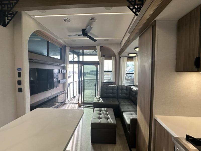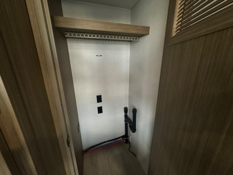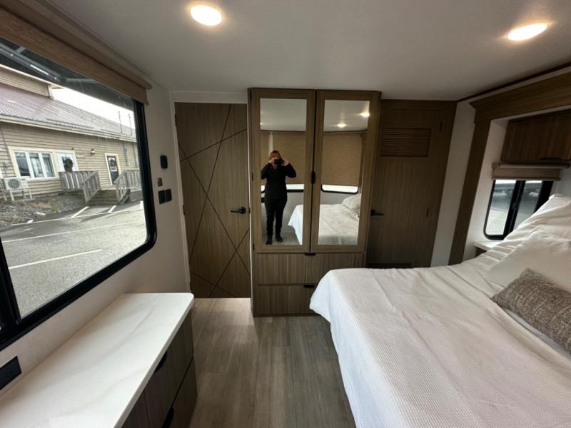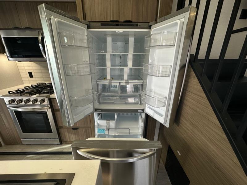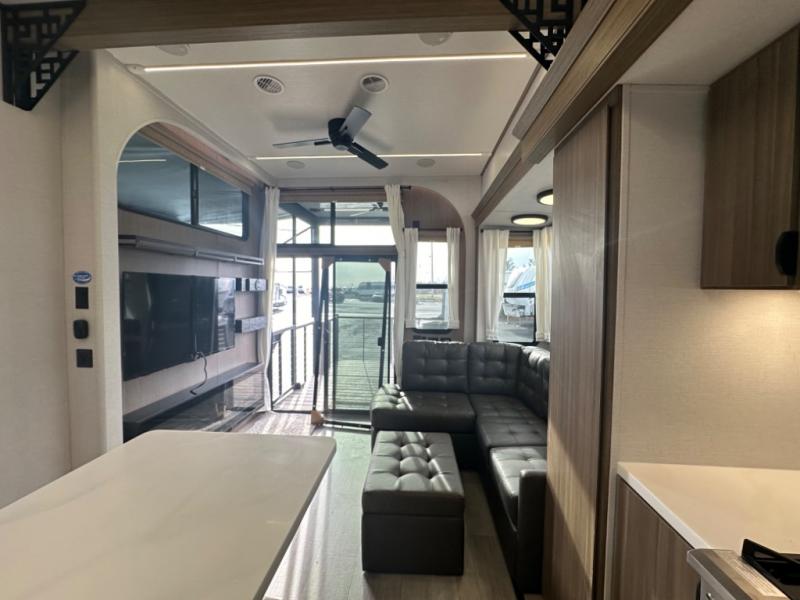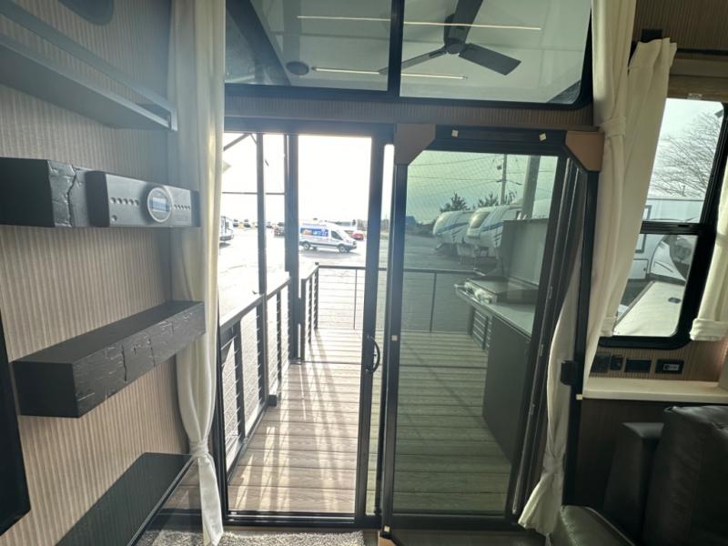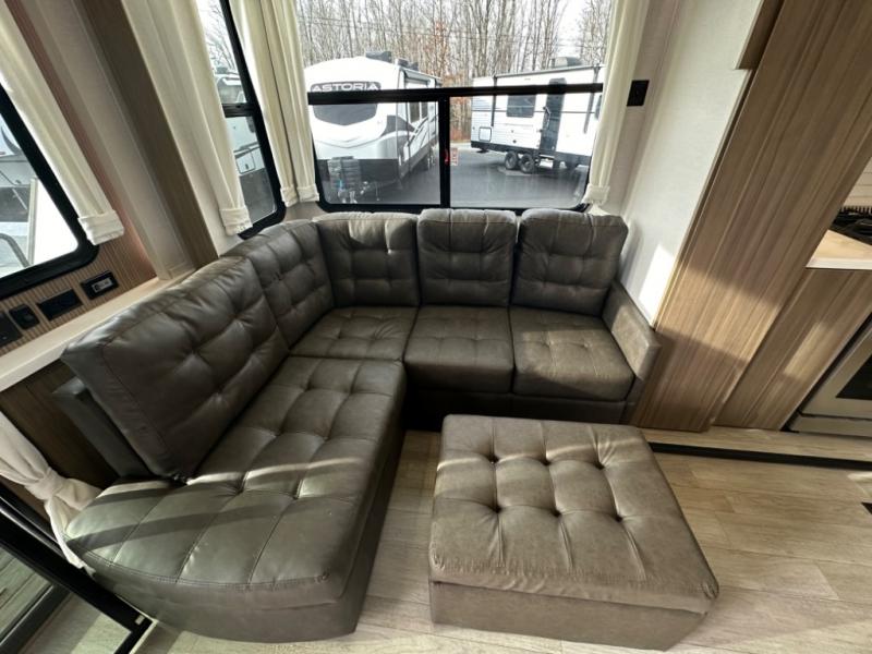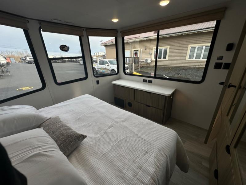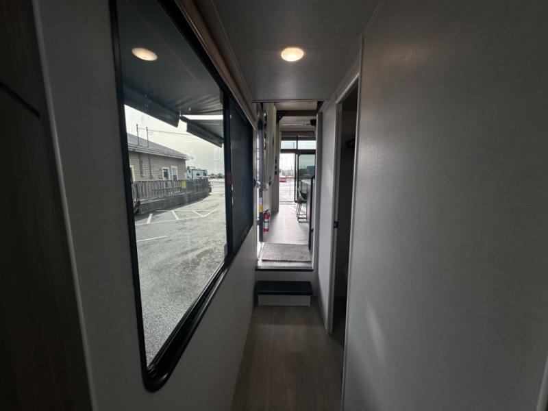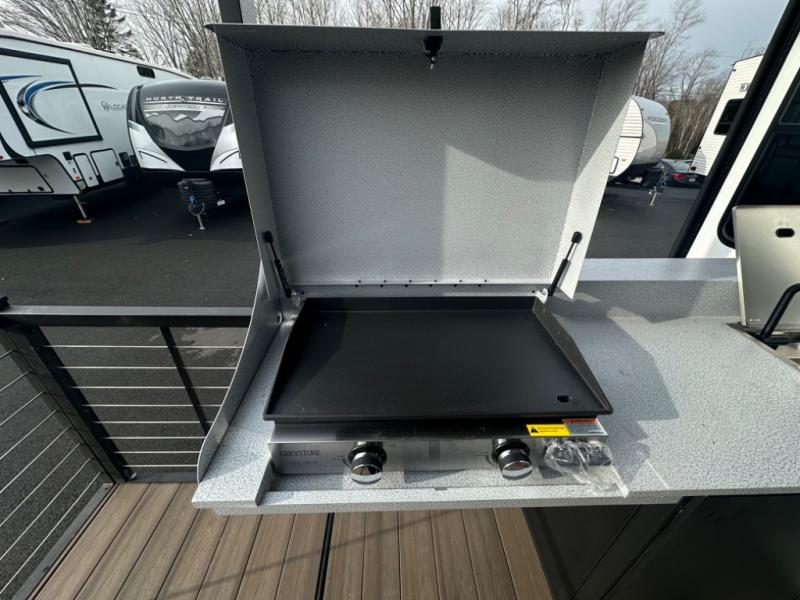One look at this destination trailer and you'll be sold! The rear porch/veranda includes an outdoor kitchen with a cooktop and sink plus a ceiling fan so you can sit out back and visit with friends. The L-shaped sofa with an ottoman inside will provide cozy seating space, especially with the fireplace right across the room. Your crew can dine at the kitchen island with four chairs, and there is a large pantry where snacks can be kept for game night. When it's time to call it a night, the front private bedroom with a Versa-Tilt custom king bed is sure to bring comfort, and there is a dresser and wardrobe for your things. A third wardrobe includes washer and dryer prep if you choose to add those appliances. Any guests that aren't sleeping on the sofa can sleep in the loft with a queen bed, large front cabinet with shelves, and an additional cabinet for storage. You will also find a table with space below for your feet, so the kids can color, eat, and play games!