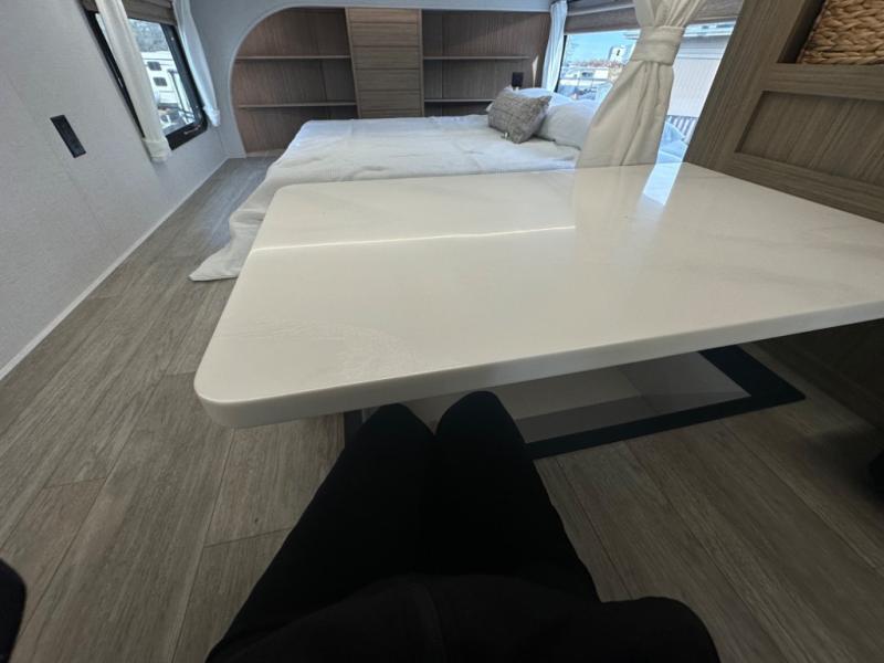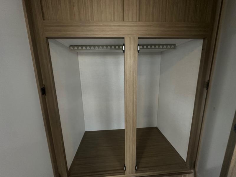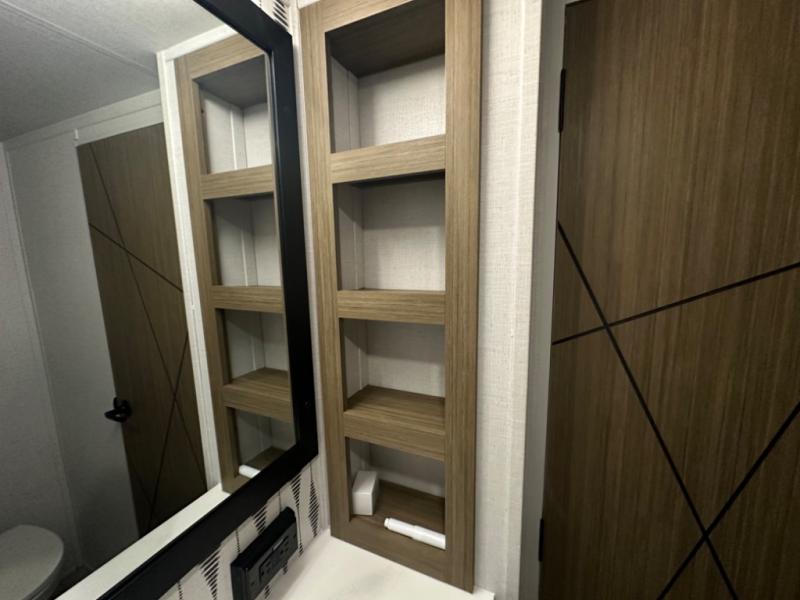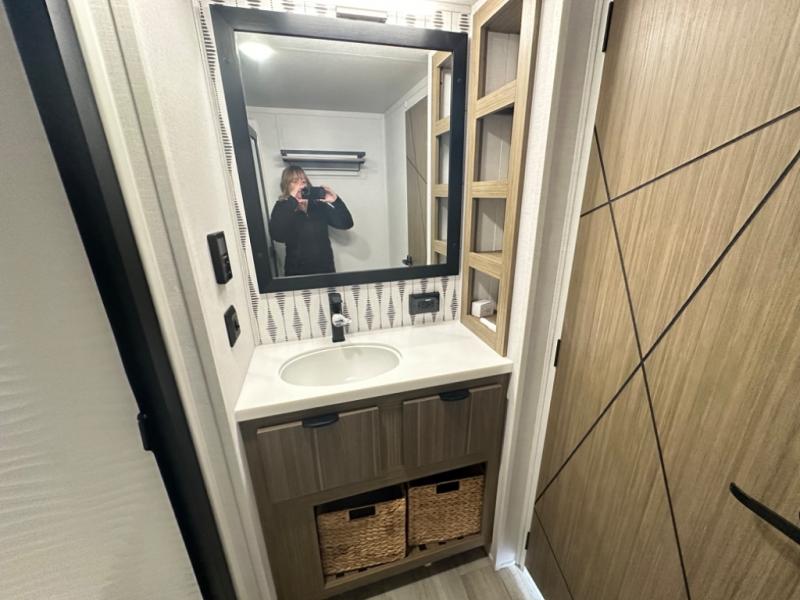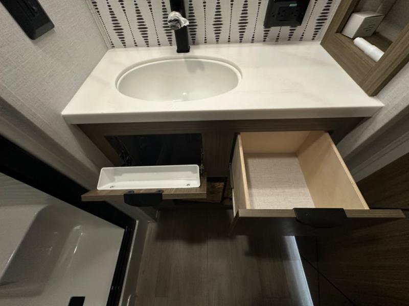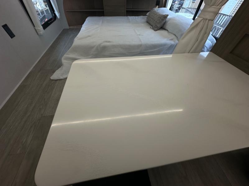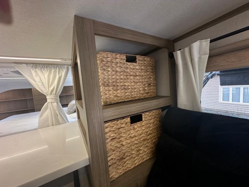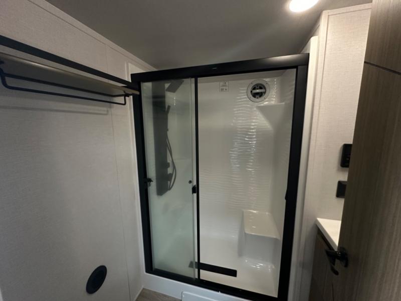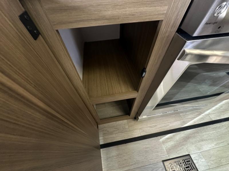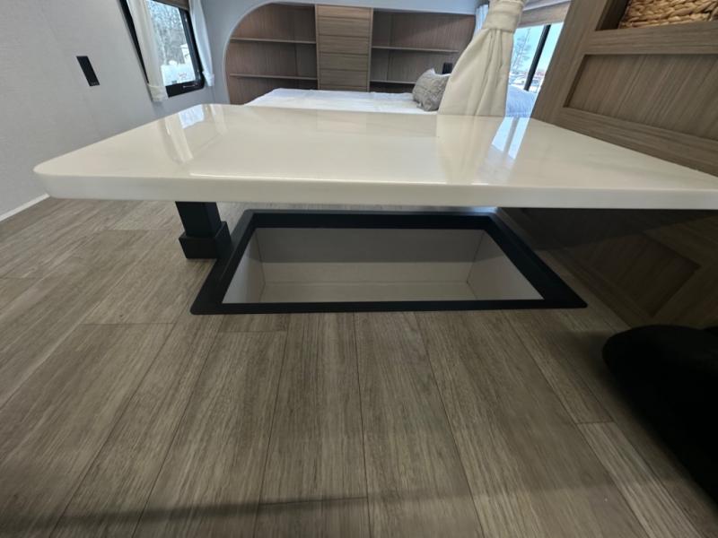 One look at this destination trailer and you'll be sold! The rear porch/veranda includes an outdoor kitchen with a cooktop and sink plus a ceiling fan so you can sit out back and visit with friends. The L-shaped sofa with an ottoman inside will provide cozy seating space, especially with the fireplace right across the room. Your crew can dine at the kitchen island with four chairs, and there is a large pantry where snacks can be kept for game night. When it's time to call it a night, the front private bedroom with a Versa-Tilt custom king bed is sure to bring comfort, and there is a dresser and wardrobe for your things. A third wardrobe includes washer and dryer prep if you choose to add those appliances. Any guests that aren't sleeping on the sofa can sleep in the loft with a queen bed, large front cabinet with shelves, and an additional cabinet for storage. You will also find a table with space below for your feet, so the kids can color, eat, and play games!