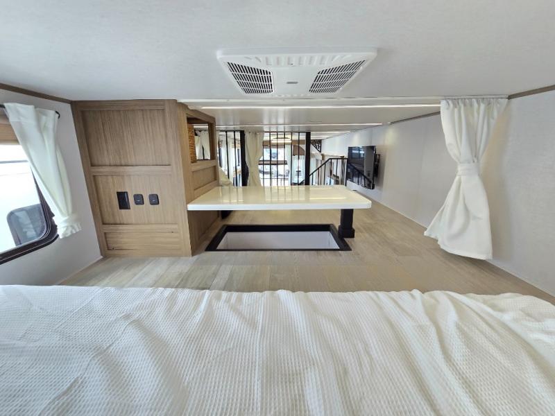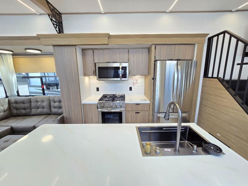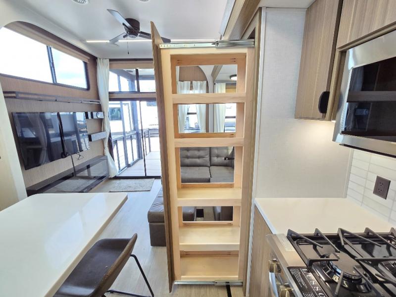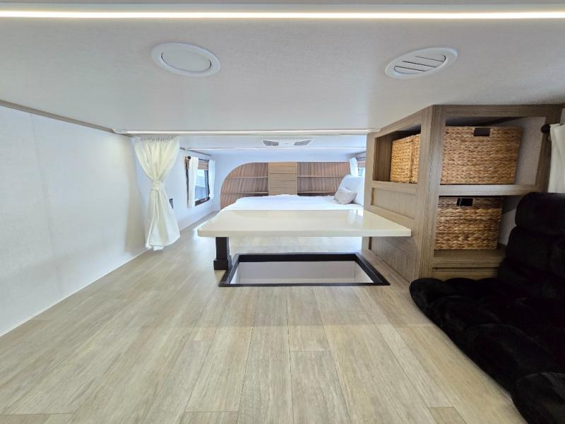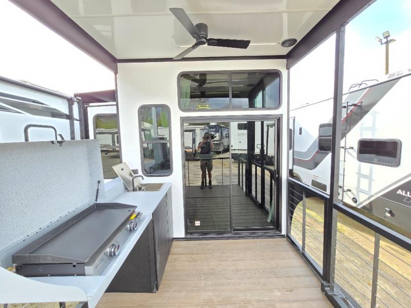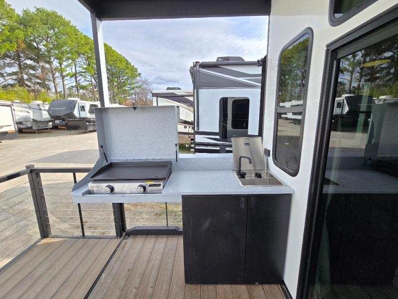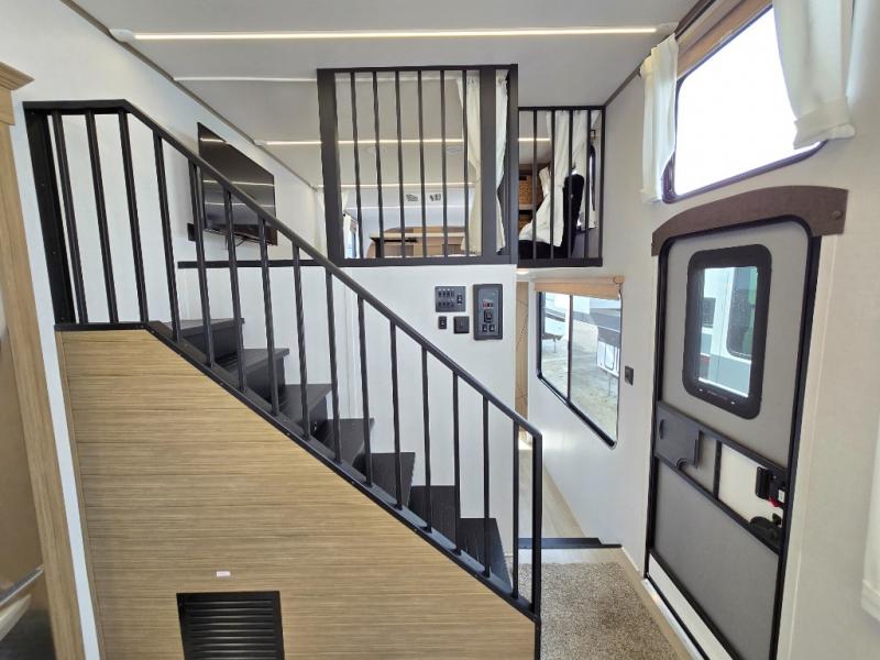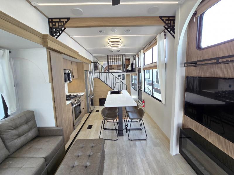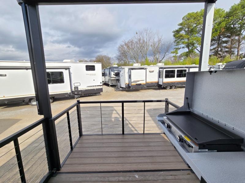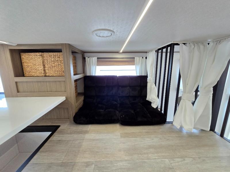 One look at this destination trailer and you'll be sold! The rear porch/veranda includes an outdoor kitchen with a cooktop and sink plus a ceiling fan so you can sit out back and visit with friends. The L-shaped sofa with an ottoman inside will provide cozy seating space, especially with the fireplace right across the room. Your crew can dine at the kitchen island with four chairs, and there is a large pantry where snacks can be kept for game night. When it's time to call it a night, the front private bedroom with a Versa-Tilt custom king bed is sure to bring comfort, and there is a dresser and wardrobe for your things. A third wardrobe includes washer and dryer prep if you choose to add those appliances. Any guests that aren't sleeping on the sofa can sleep in the loft with a queen bed, large front cabinet with shelves, and an additional cabinet for storage. You will also find a table with space below for your feet, so the kids can color, eat, and play games!