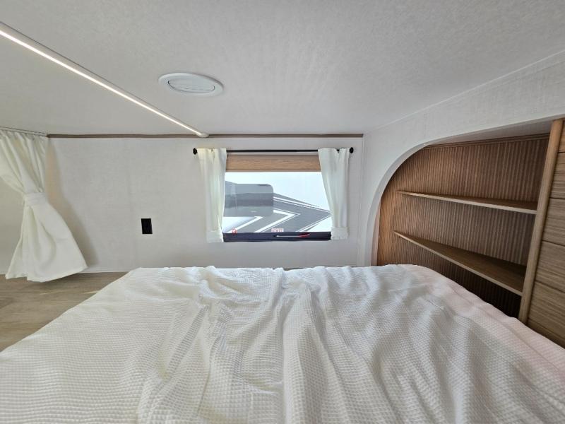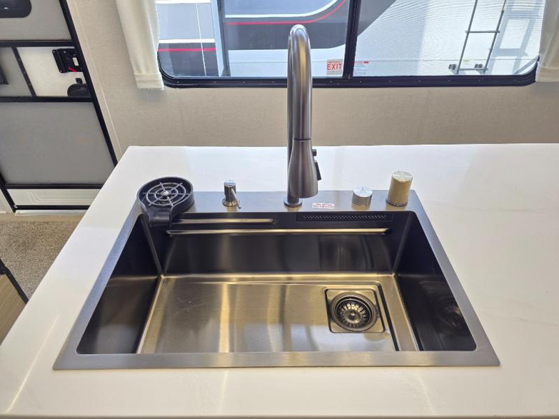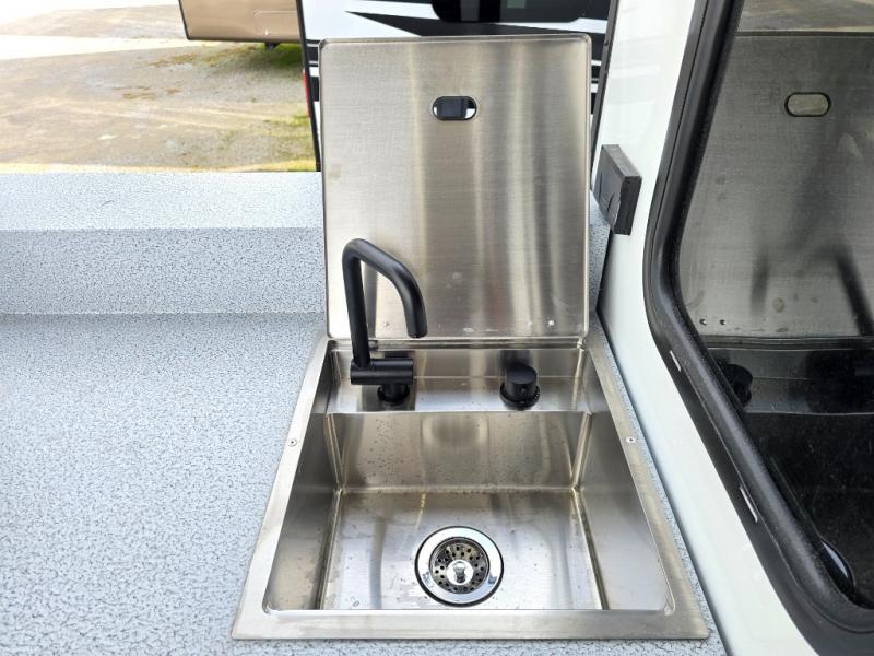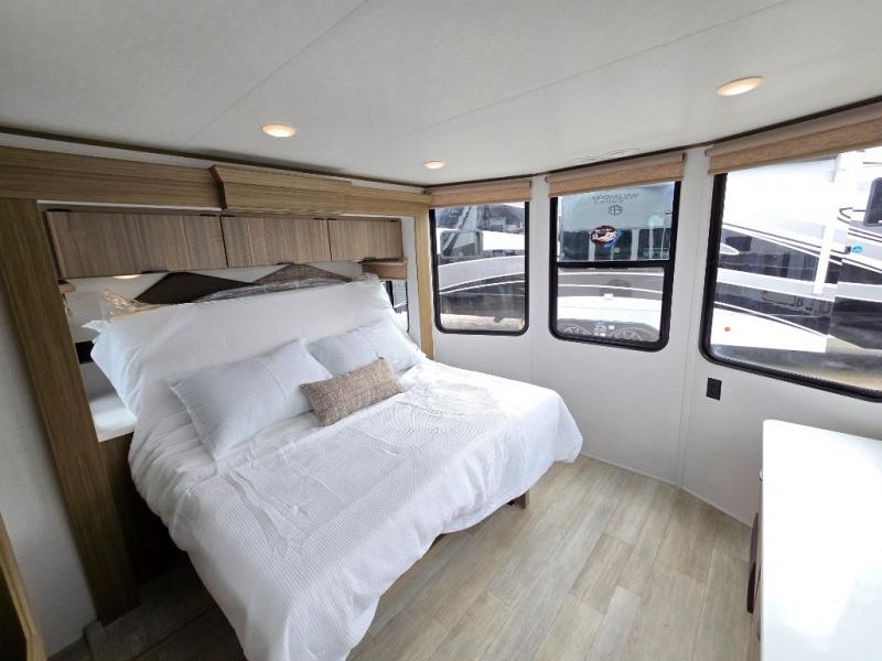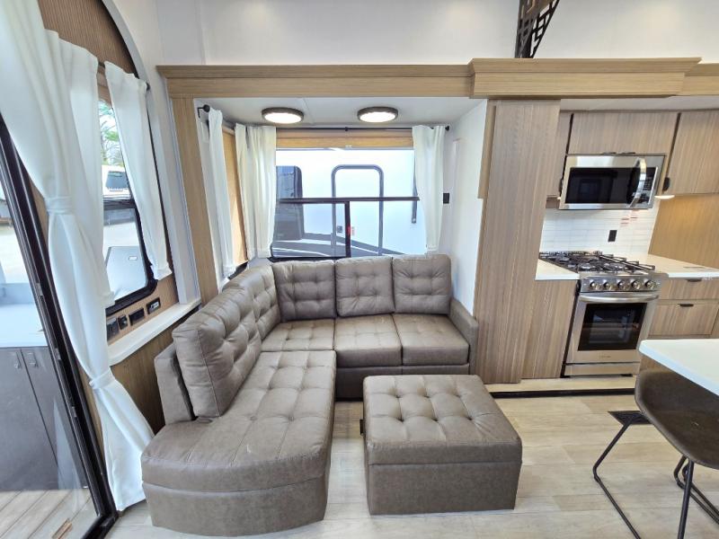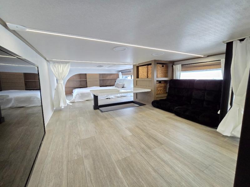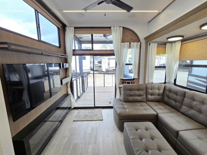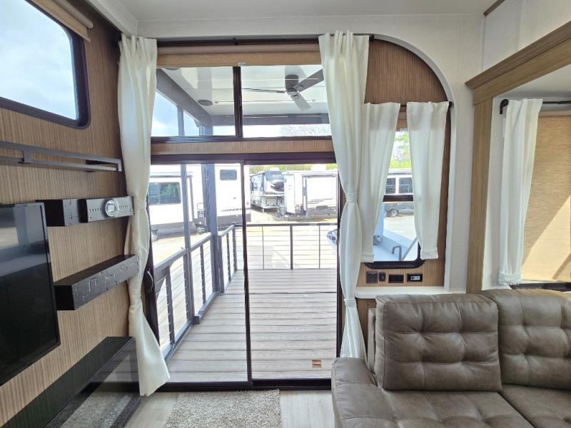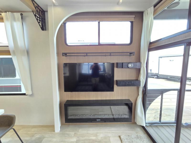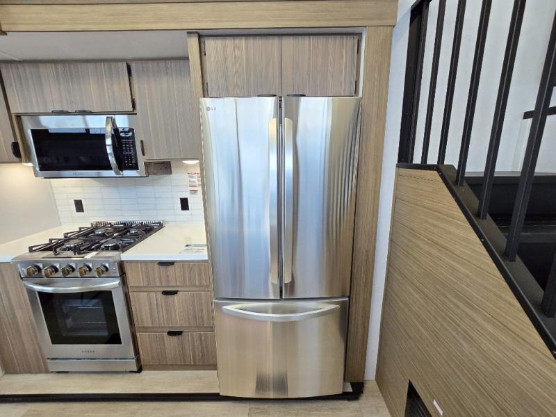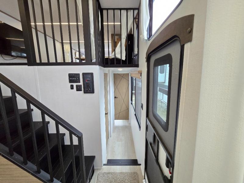 One look at this destination trailer and you'll be sold! The rear porch/veranda includes an outdoor kitchen with a cooktop and sink plus a ceiling fan so you can sit out back and visit with friends. The L-shaped sofa with an ottoman inside will provide cozy seating space, especially with the fireplace right across the room. Your crew can dine at the kitchen island with four chairs, and there is a large pantry where snacks can be kept for game night. When it's time to call it a night, the front private bedroom with a Versa-Tilt custom king bed is sure to bring comfort, and there is a dresser and wardrobe for your things. A third wardrobe includes washer and dryer prep if you choose to add those appliances. Any guests that aren't sleeping on the sofa can sleep in the loft with a queen bed, large front cabinet with shelves, and an additional cabinet for storage. You will also find a table with space below for your feet, so the kids can color, eat, and play games!
