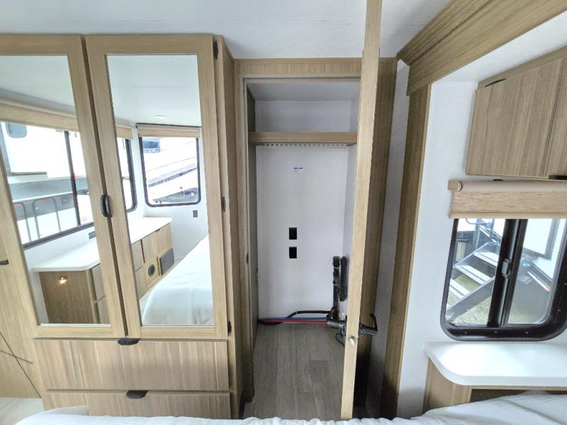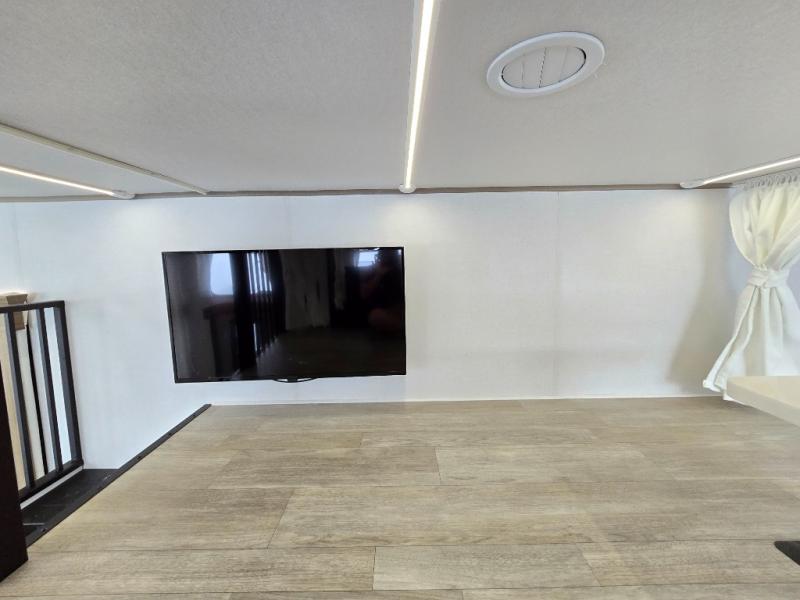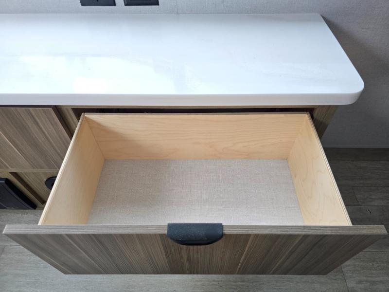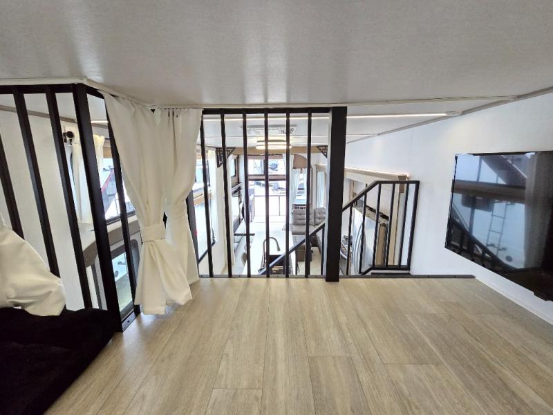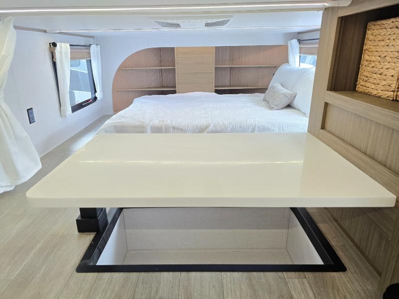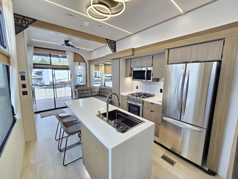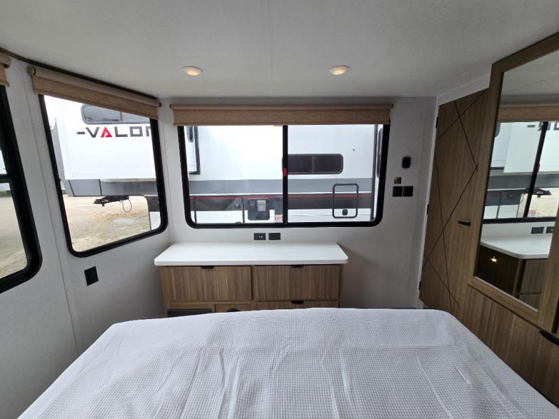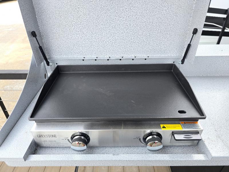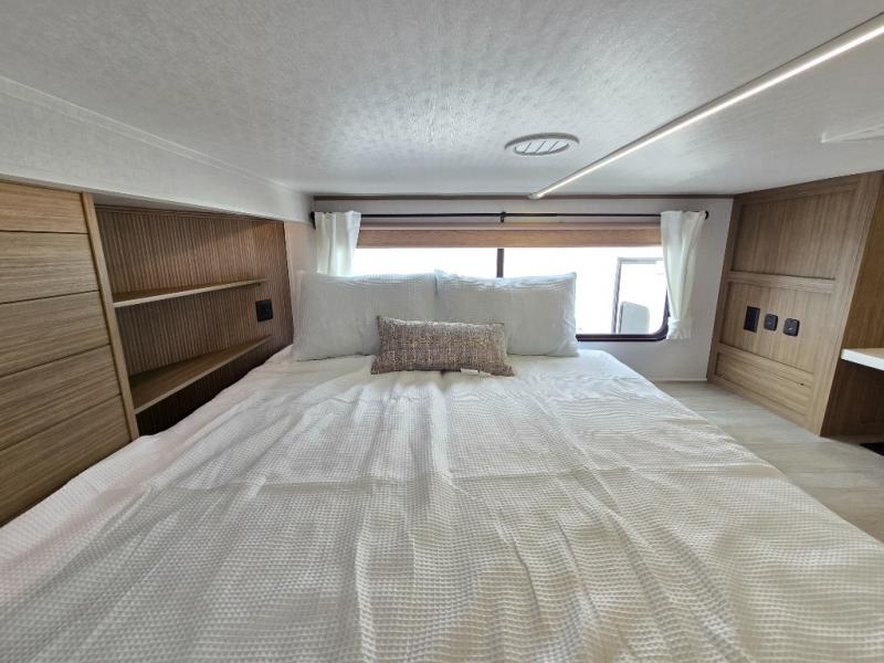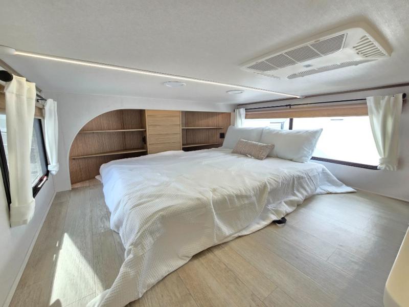 One look at this destination trailer and you'll be sold! The rear porch/veranda includes an outdoor kitchen with a cooktop and sink plus a ceiling fan so you can sit out back and visit with friends. The L-shaped sofa with an ottoman inside will provide cozy seating space, especially with the fireplace right across the room. Your crew can dine at the kitchen island with four chairs, and there is a large pantry where snacks can be kept for game night. When it's time to call it a night, the front private bedroom with a Versa-Tilt custom king bed is sure to bring comfort, and there is a dresser and wardrobe for your things. A third wardrobe includes washer and dryer prep if you choose to add those appliances. Any guests that aren't sleeping on the sofa can sleep in the loft with a queen bed, large front cabinet with shelves, and an additional cabinet for storage. You will also find a table with space below for your feet, so the kids can color, eat, and play games!