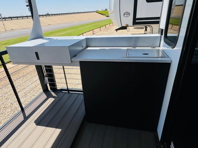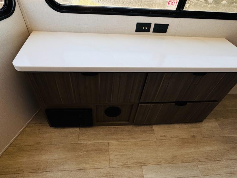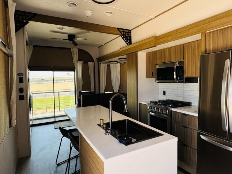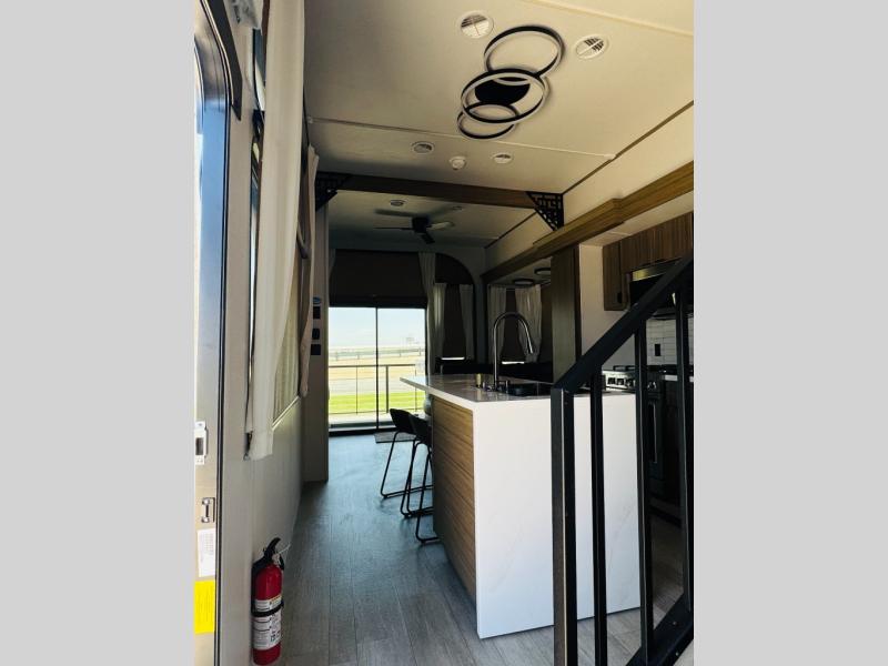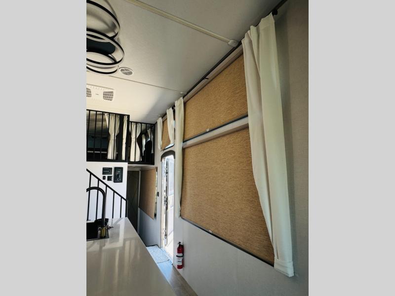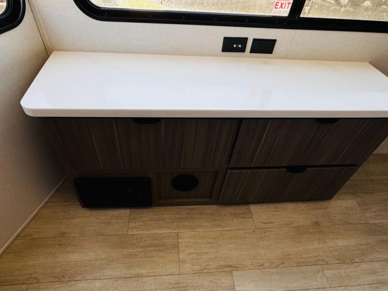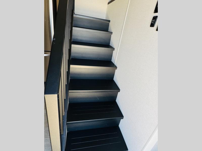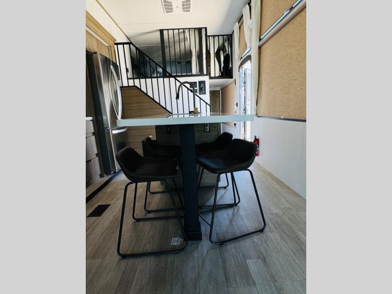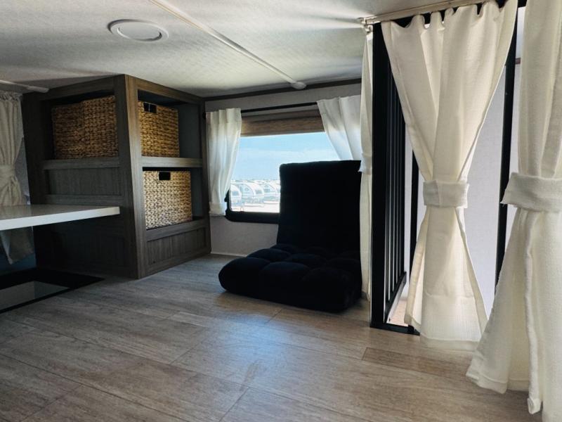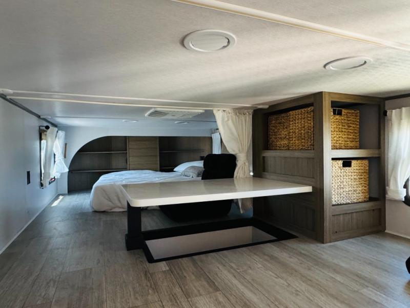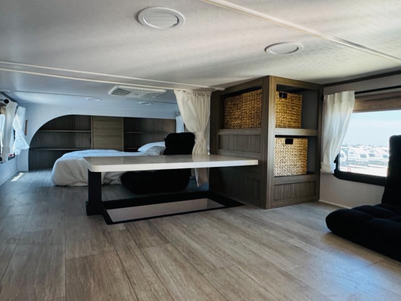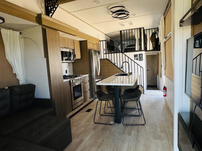 One look at this destination trailer and you'll be sold! The rear porch/veranda includes an outdoor kitchen with a cooktop and sink plus a ceiling fan so you can sit out back and visit with friends. The L-shaped sofa with an ottoman inside will provide cozy seating space, especially with the fireplace right across the room. Your crew can dine at the kitchen island with four chairs, and there is a large pantry where snacks can be kept for game night. When it's time to call it a night, the front private bedroom with a Versa-Tilt custom king bed is sure to bring comfort, and there is a dresser and wardrobe for your things. A third wardrobe includes washer and dryer prep if you choose to add those appliances. Any guests that aren't sleeping on the sofa can sleep in the loft with a queen bed, large front cabinet with shelves, and an additional cabinet for storage. You will also find a table with space below for your feet, so the kids can color, eat, and play games!