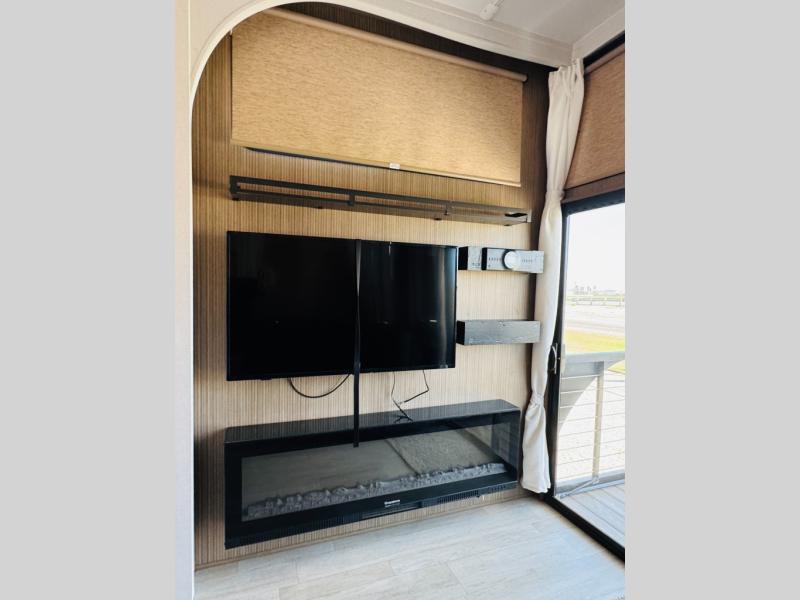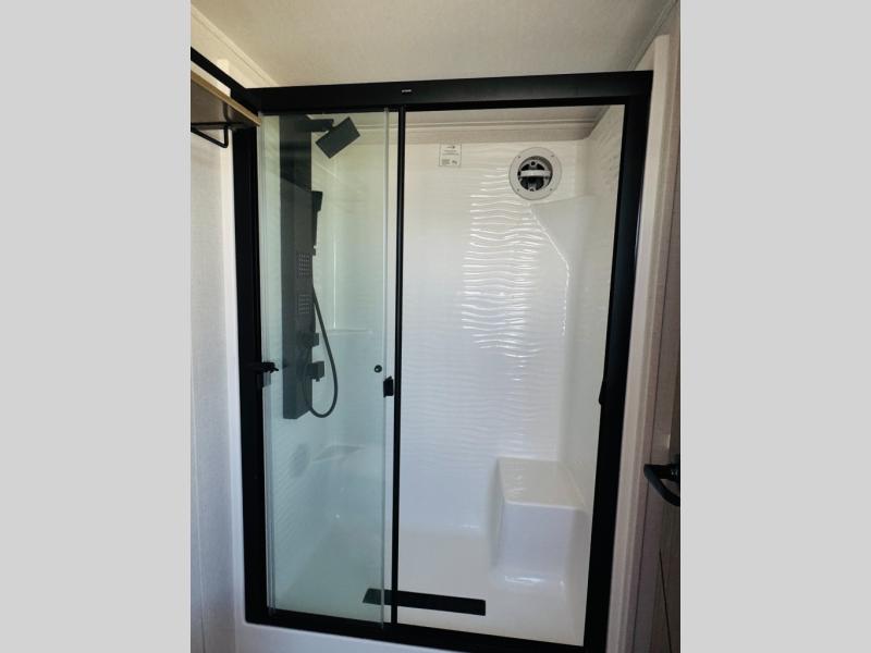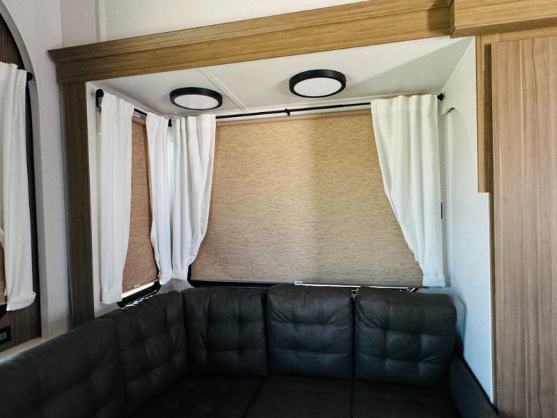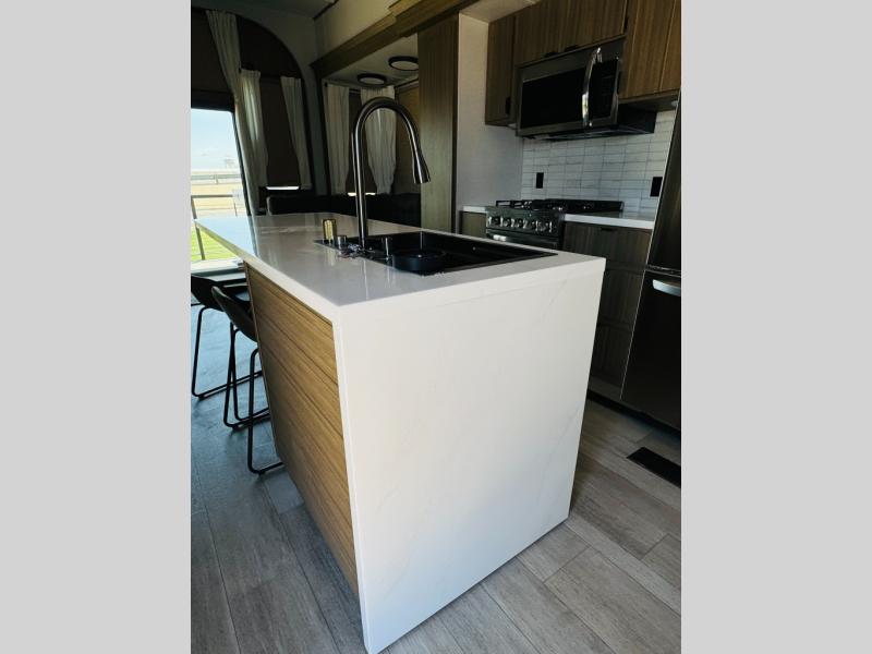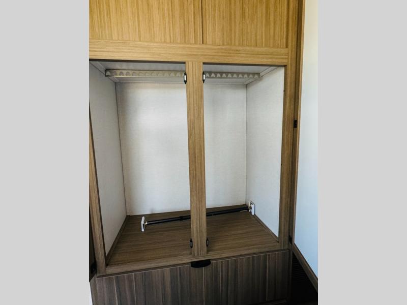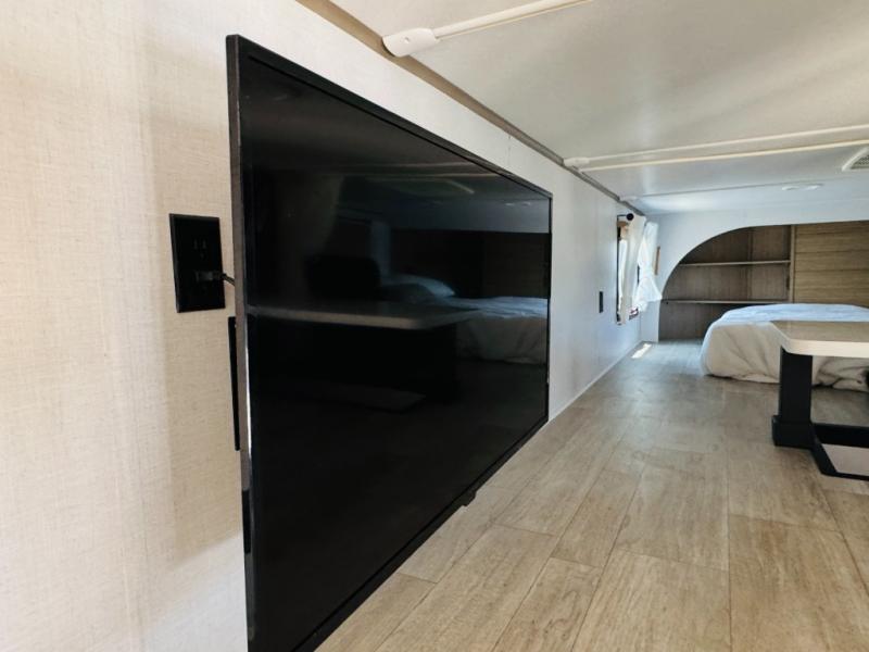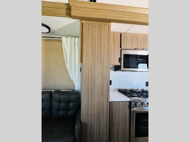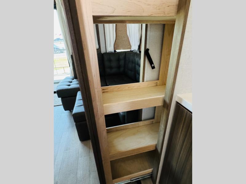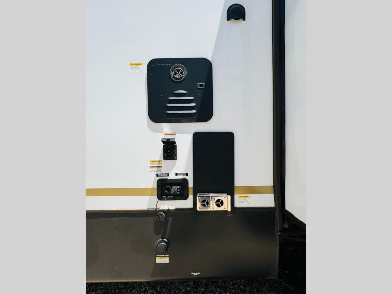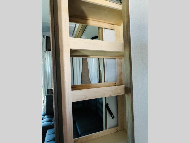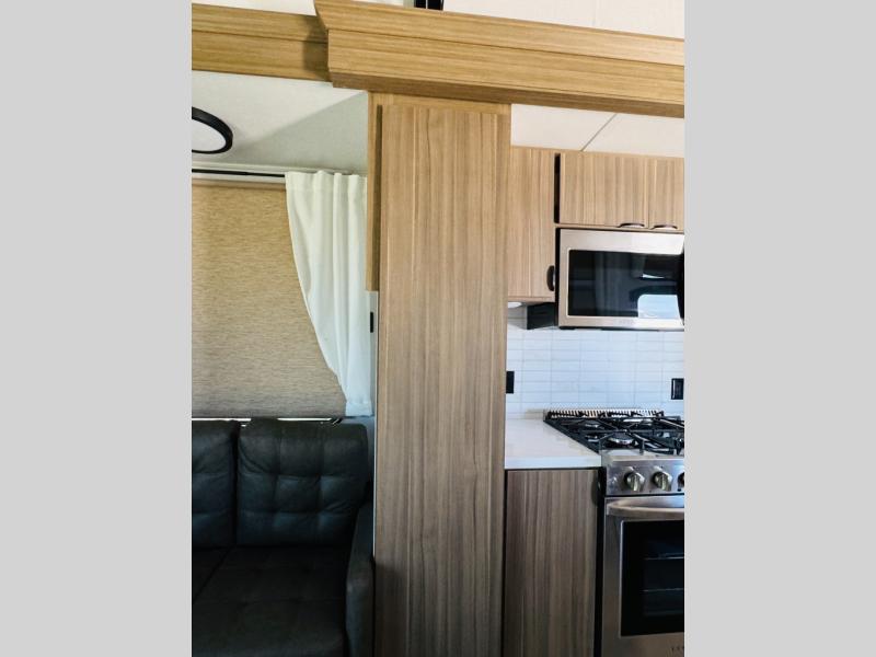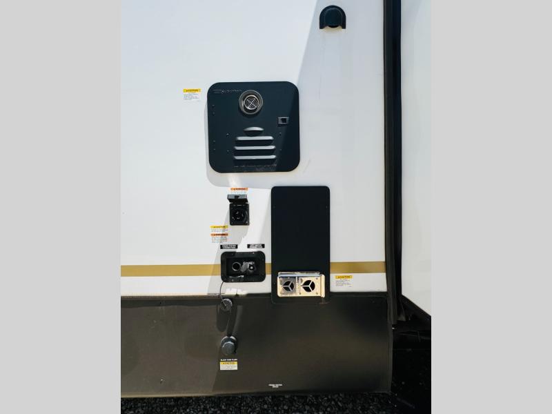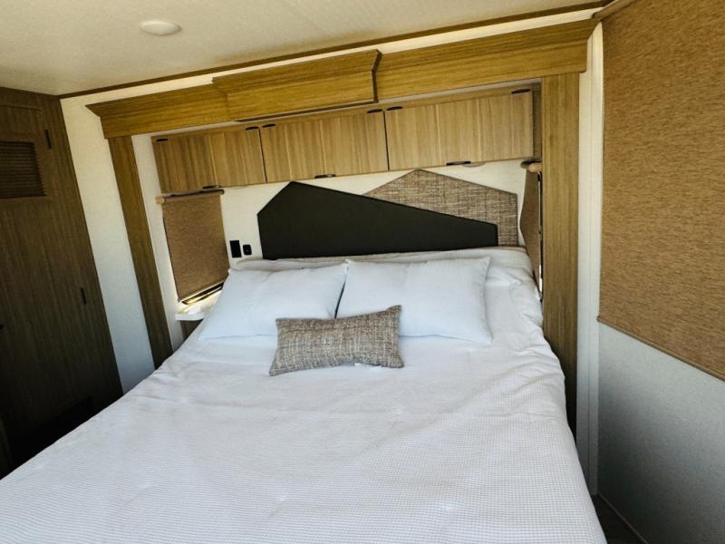 One look at this destination trailer and you'll be sold! The rear porch/veranda includes an outdoor kitchen with a cooktop and sink plus a ceiling fan so you can sit out back and visit with friends. The L-shaped sofa with an ottoman inside will provide cozy seating space, especially with the fireplace right across the room. Your crew can dine at the kitchen island with four chairs, and there is a large pantry where snacks can be kept for game night. When it's time to call it a night, the front private bedroom with a Versa-Tilt custom king bed is sure to bring comfort, and there is a dresser and wardrobe for your things. A third wardrobe includes washer and dryer prep if you choose to add those appliances. Any guests that aren't sleeping on the sofa can sleep in the loft with a queen bed, large front cabinet with shelves, and an additional cabinet for storage. You will also find a table with space below for your feet, so the kids can color, eat, and play games!