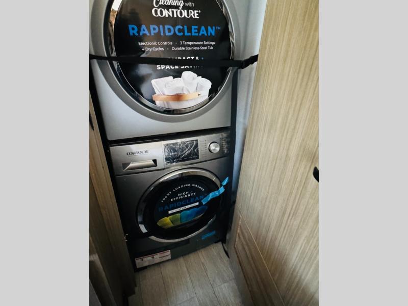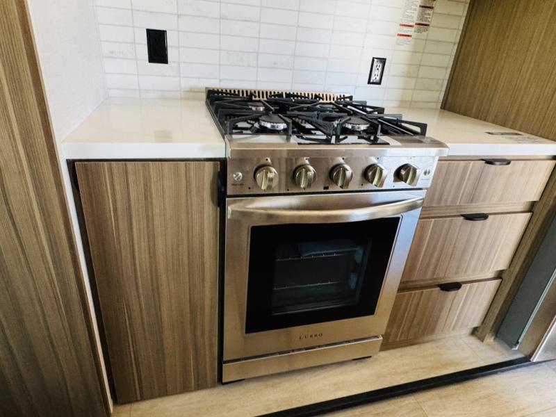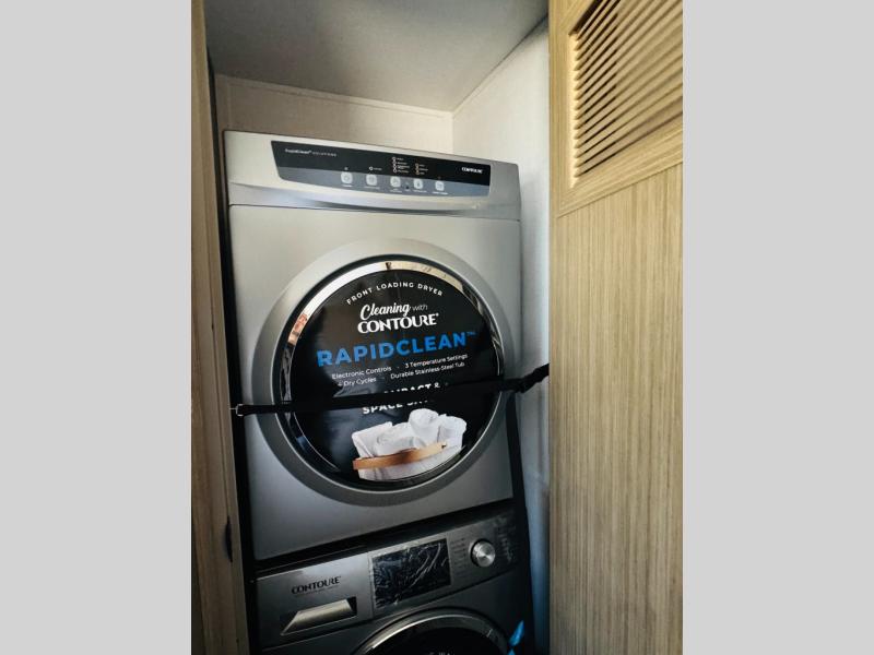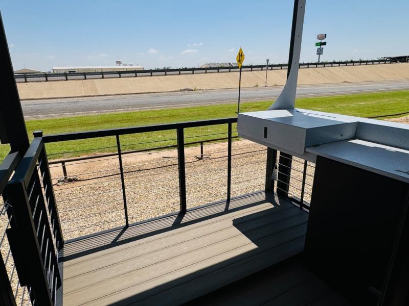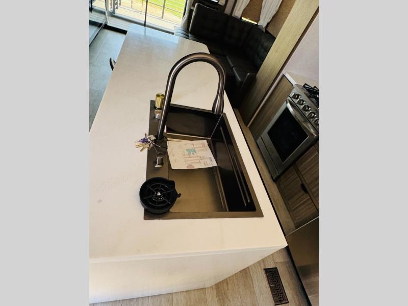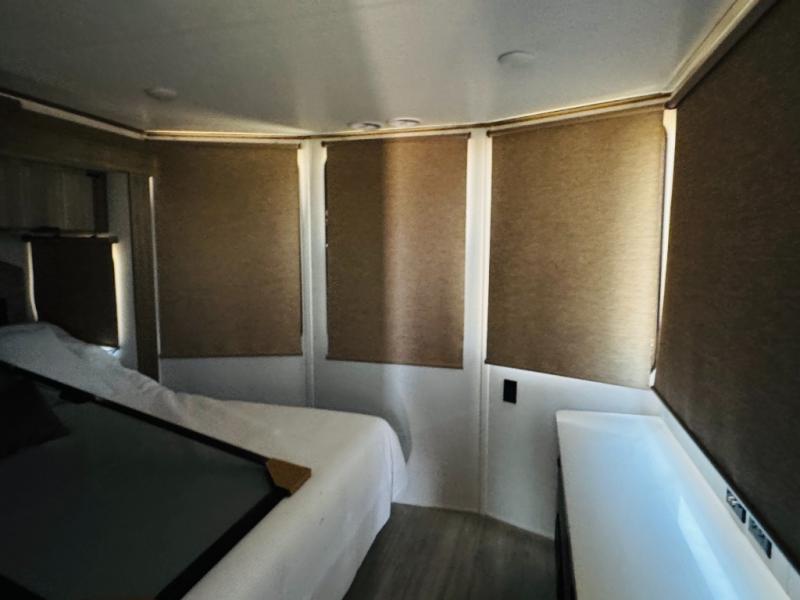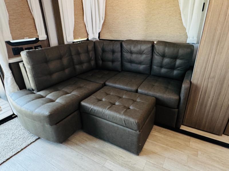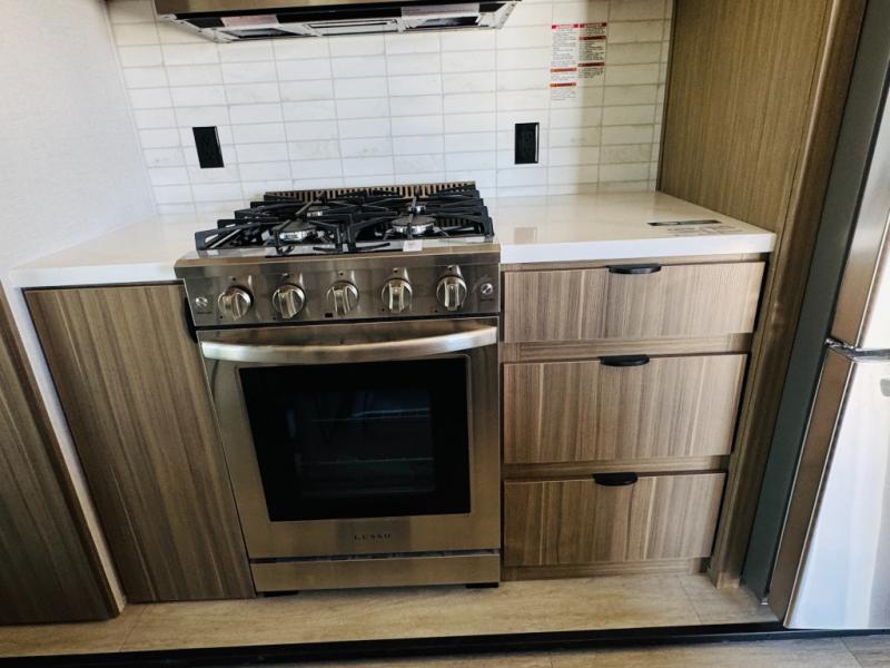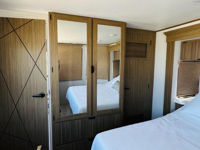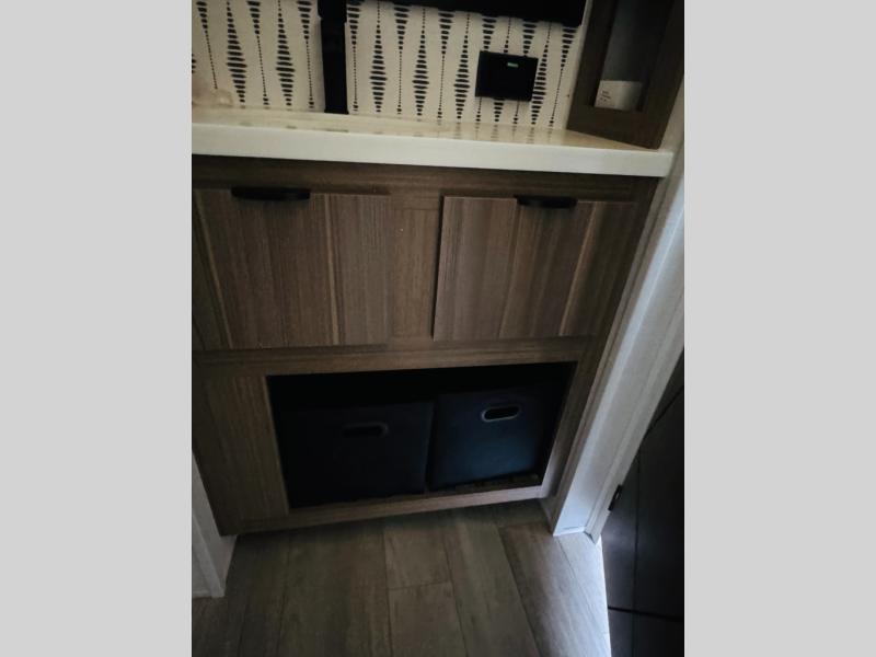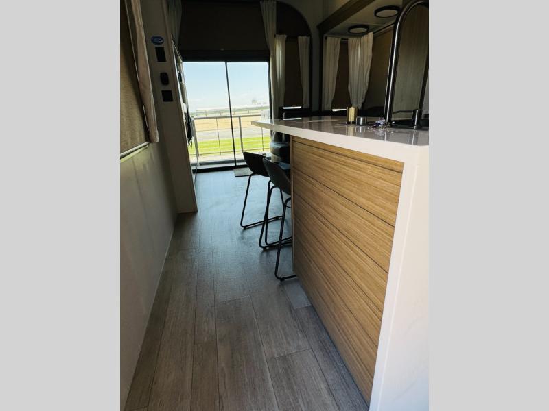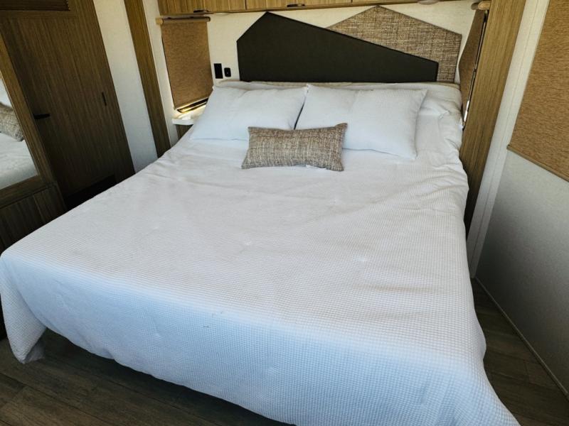 One look at this destination trailer and you'll be sold! The rear porch/veranda includes an outdoor kitchen with a cooktop and sink plus a ceiling fan so you can sit out back and visit with friends. The L-shaped sofa with an ottoman inside will provide cozy seating space, especially with the fireplace right across the room. Your crew can dine at the kitchen island with four chairs, and there is a large pantry where snacks can be kept for game night. When it's time to call it a night, the front private bedroom with a Versa-Tilt custom king bed is sure to bring comfort, and there is a dresser and wardrobe for your things. A third wardrobe includes washer and dryer prep if you choose to add those appliances. Any guests that aren't sleeping on the sofa can sleep in the loft with a queen bed, large front cabinet with shelves, and an additional cabinet for storage. You will also find a table with space below for your feet, so the kids can color, eat, and play games!