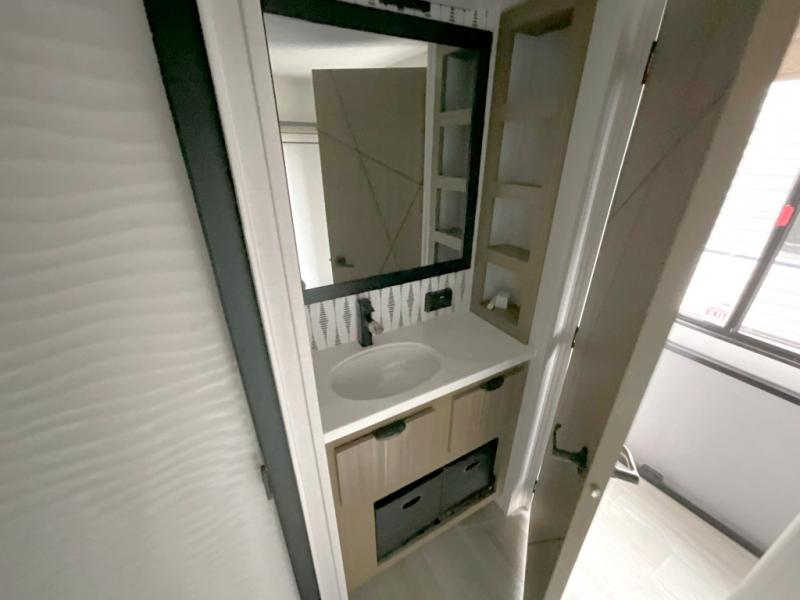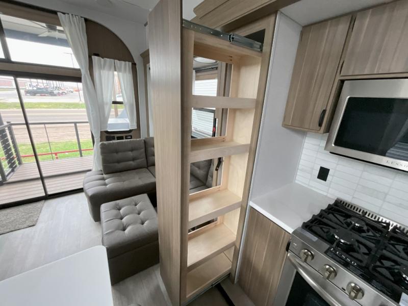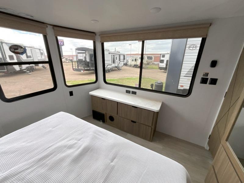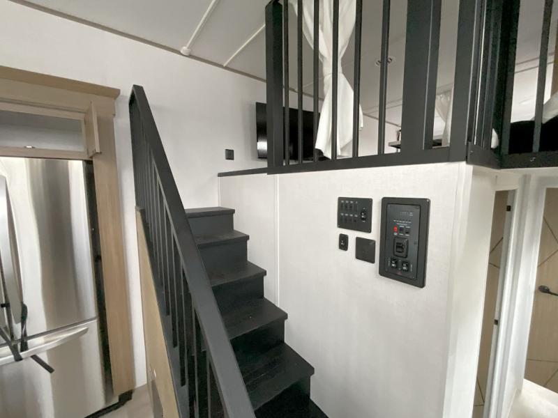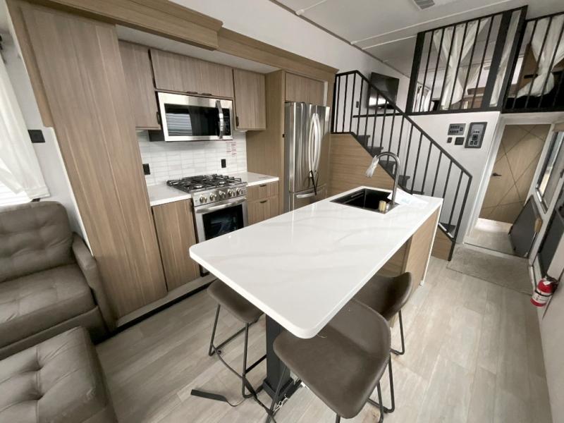 One look at this destination trailer and you'll be sold! The rear porch/veranda includes an outdoor kitchen with a cooktop and sink plus a ceiling fan so you can sit out back and visit with friends. The L-shaped sofa with an ottoman inside will provide cozy seating space, especially with the fireplace right across the room. Your crew can dine at the kitchen island with four chairs, and there is a large pantry where snacks can be kept for game night. When it's time to call it a night, the front private bedroom with a Versa-Tilt custom king bed is sure to bring comfort, and there is a dresser and wardrobe for your things. A third wardrobe includes washer and dryer prep if you choose to add those appliances. Any guests that aren't sleeping on the sofa can sleep in the loft with a queen bed, large front cabinet with shelves, and an additional cabinet for storage. You will also find a table with space below for your feet, so the kids can color, eat, and play games!