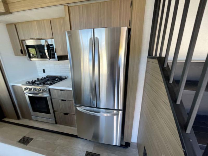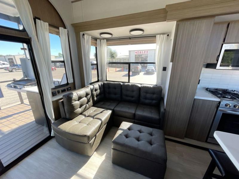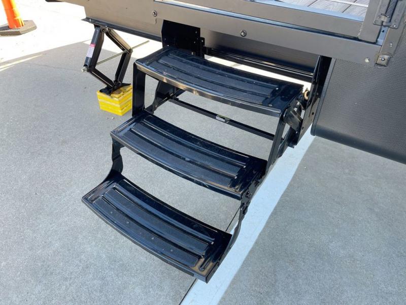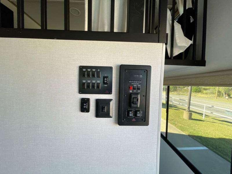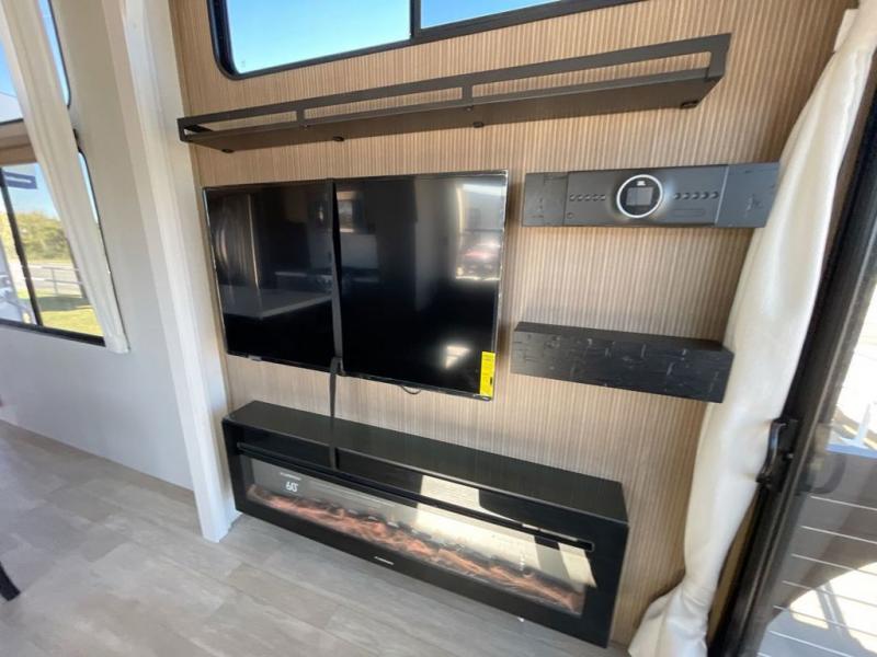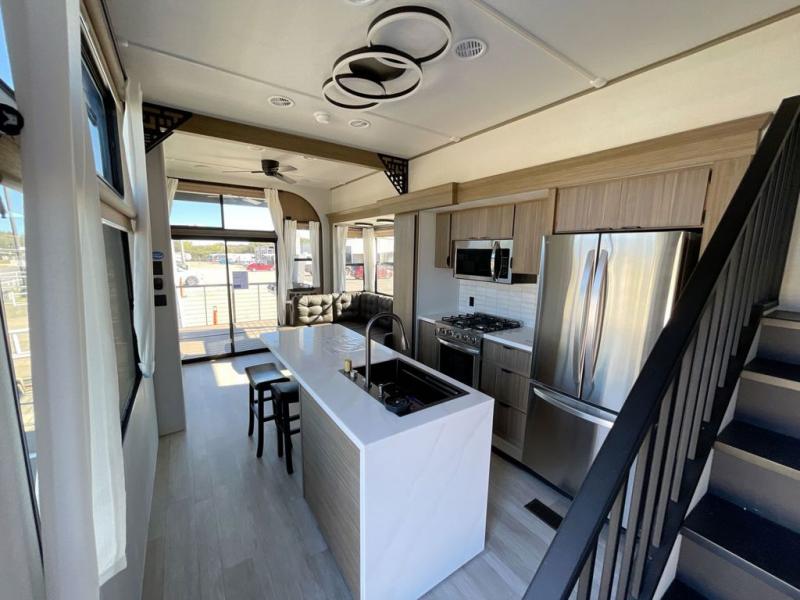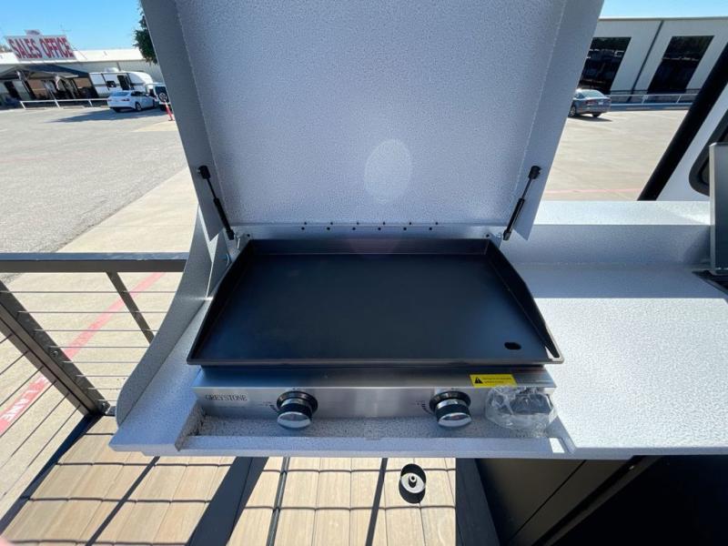 One look at this destination trailer and you'll be sold! The rear porch/veranda includes an outdoor kitchen with a cooktop and sink plus a ceiling fan so you can sit out back and visit with friends. The L-shaped sofa with an ottoman inside will provide cozy seating space, especially with the fireplace right across the room. Your crew can dine at the kitchen island with four chairs, and there is a large pantry where snacks can be kept for game night. When it's time to call it a night, the front private bedroom with a Versa-Tilt custom king bed is sure to bring comfort, and there is a dresser and wardrobe for your things. A third wardrobe includes washer and dryer prep if you choose to add those appliances. Any guests that aren't sleeping on the sofa can sleep in the loft with a queen bed, large front cabinet with shelves, and an additional cabinet for storage. You will also find a table with space below for your feet, so the kids can color, eat, and play games!