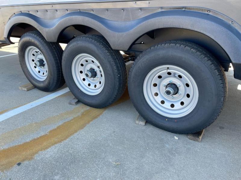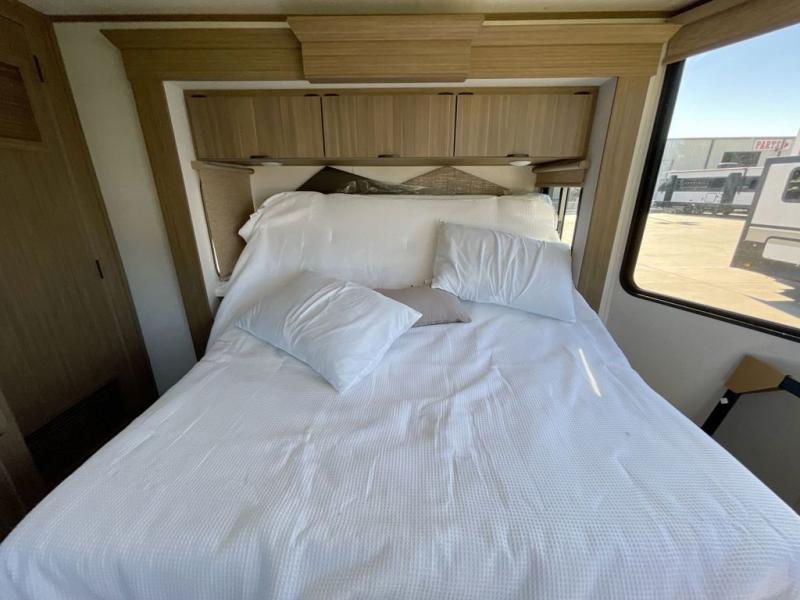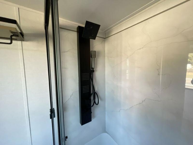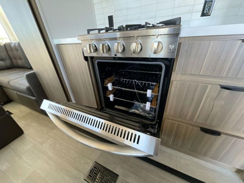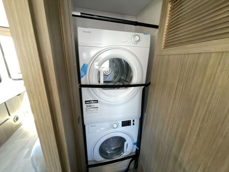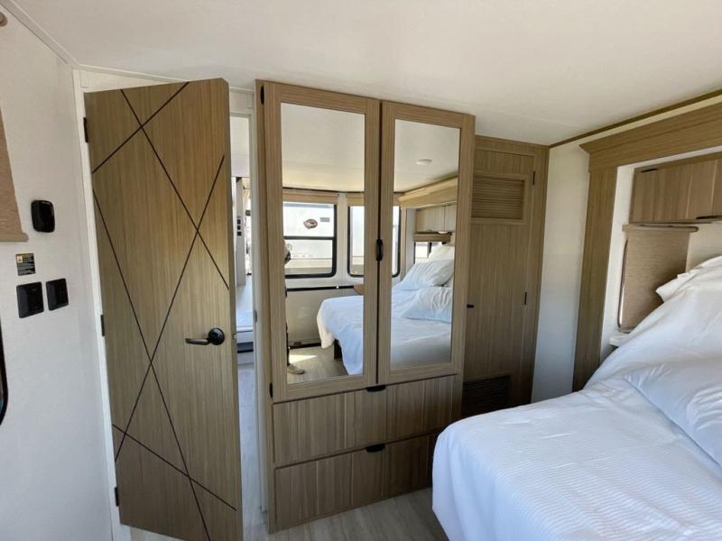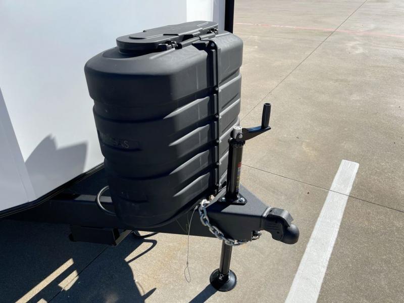 One look at this destination trailer and you'll be sold! The rear porch/veranda includes an outdoor kitchen with a cooktop and sink plus a ceiling fan so you can sit out back and visit with friends. The L-shaped sofa with an ottoman inside will provide cozy seating space, especially with the fireplace right across the room. Your crew can dine at the kitchen island with four chairs, and there is a large pantry where snacks can be kept for game night. When it's time to call it a night, the front private bedroom with a Versa-Tilt custom king bed is sure to bring comfort, and there is a dresser and wardrobe for your things. A third wardrobe includes washer and dryer prep if you choose to add those appliances. Any guests that aren't sleeping on the sofa can sleep in the loft with a queen bed, large front cabinet with shelves, and an additional cabinet for storage. You will also find a table with space below for your feet, so the kids can color, eat, and play games!
