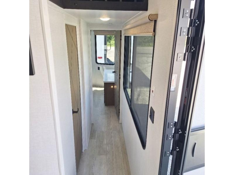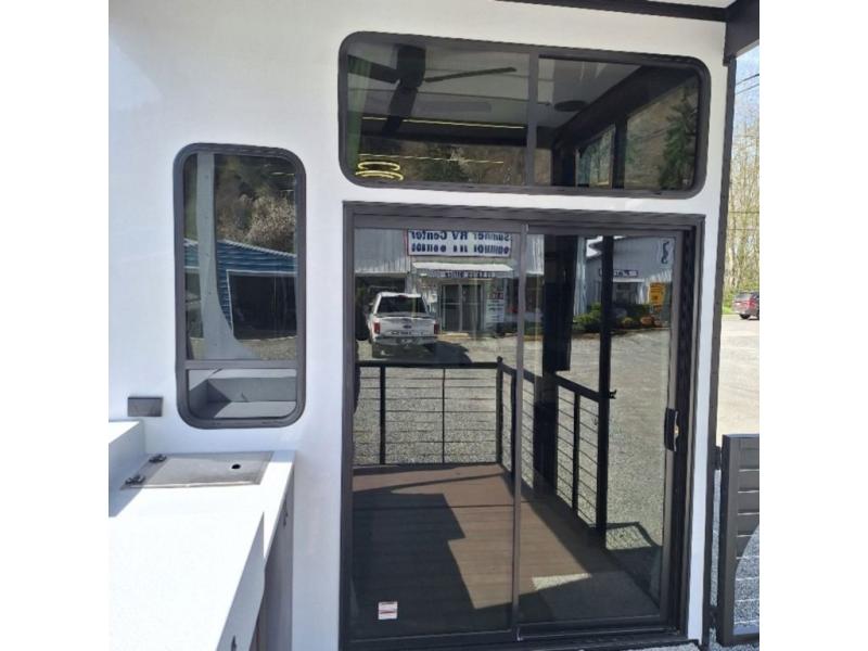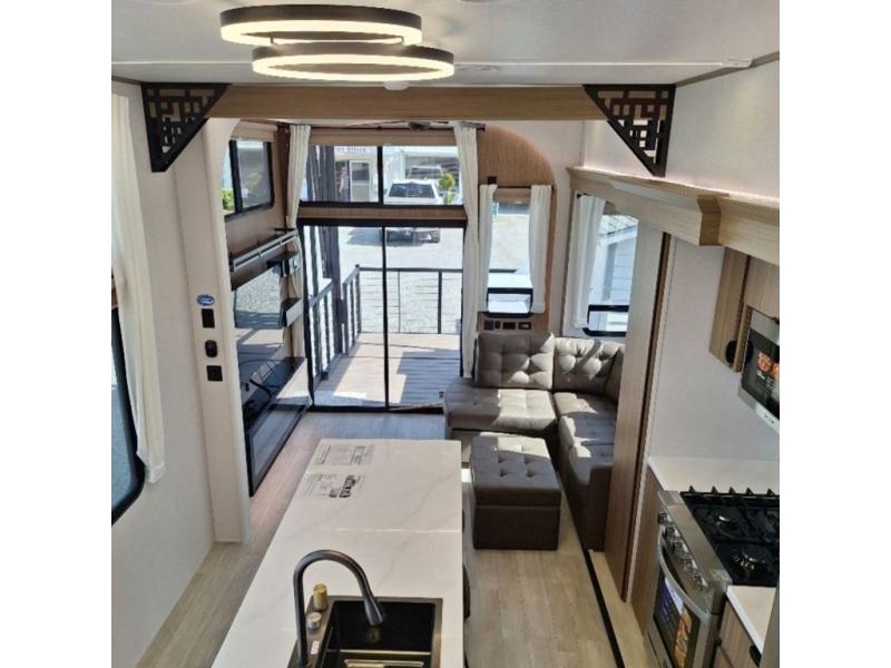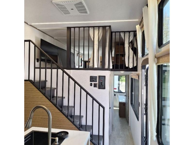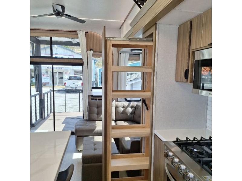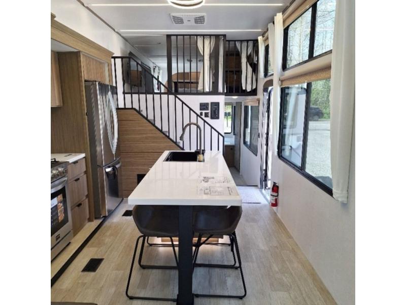 One look at this destination trailer and you'll be sold! The rear porch/veranda includes an outdoor kitchen with a cooktop and sink plus a ceiling fan so you can sit out back and visit with friends. The L-shaped sofa with an ottoman inside will provide cozy seating space, especially with the fireplace right across the room. Your crew can dine at the kitchen island with four chairs, and there is a large pantry where snacks can be kept for game night. When it's time to call it a night, the front private bedroom with a Versa-Tilt custom king bed is sure to bring comfort, and there is a dresser and wardrobe for your things. A third wardrobe includes washer and dryer prep if you choose to add those appliances. Any guests that aren't sleeping on the sofa can sleep in the loft with a queen bed, large front cabinet with shelves, and an additional cabinet for storage. You will also find a table with space below for your feet, so the kids can color, eat, and play games!