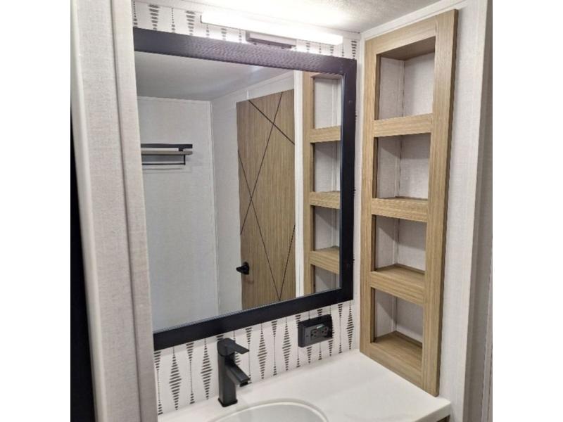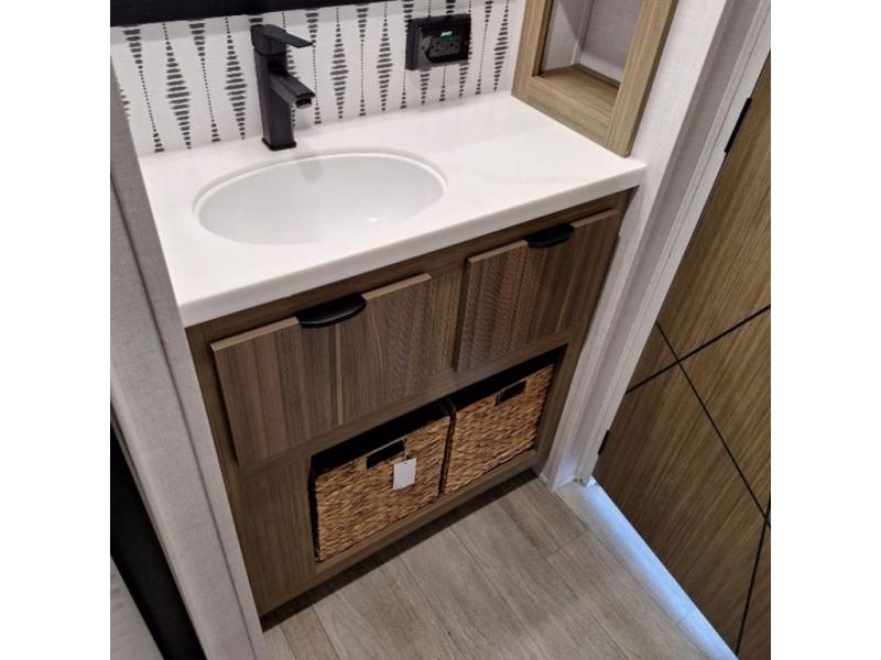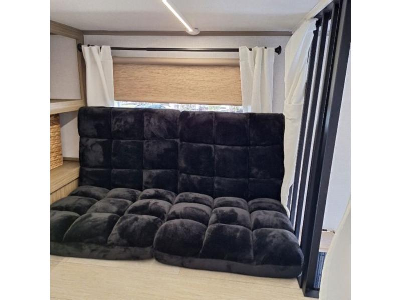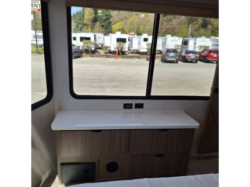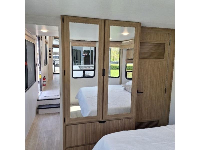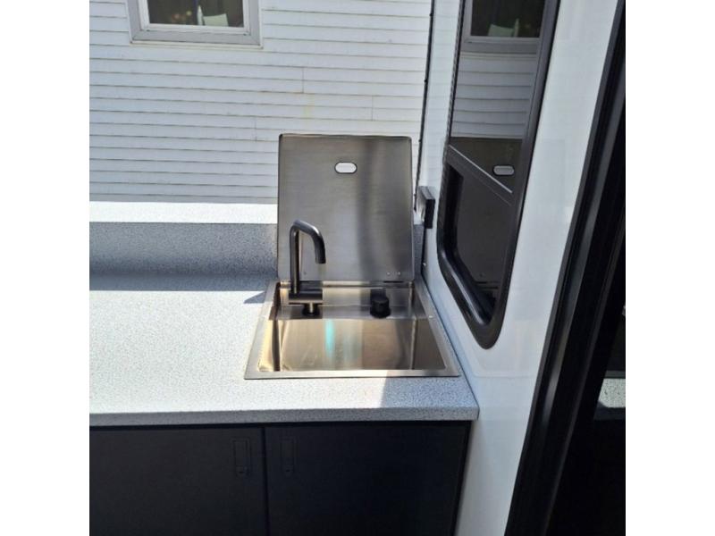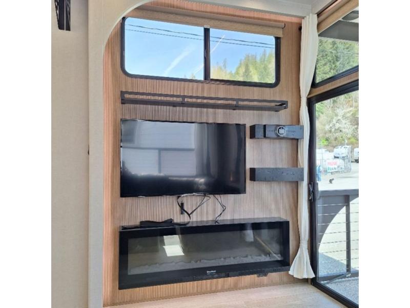 One look at this destination trailer and you'll be sold! The rear porch/veranda includes an outdoor kitchen with a cooktop and sink plus a ceiling fan so you can sit out back and visit with friends. The L-shaped sofa with an ottoman inside will provide cozy seating space, especially with the fireplace right across the room. Your crew can dine at the kitchen island with four chairs, and there is a large pantry where snacks can be kept for game night. When it's time to call it a night, the front private bedroom with a Versa-Tilt custom king bed is sure to bring comfort, and there is a dresser and wardrobe for your things. A third wardrobe includes washer and dryer prep if you choose to add those appliances. Any guests that aren't sleeping on the sofa can sleep in the loft with a queen bed, large front cabinet with shelves, and an additional cabinet for storage. You will also find a table with space below for your feet, so the kids can color, eat, and play games!
