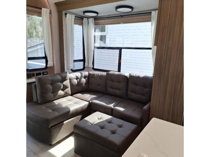 With any Wildwood Grand Lodge destination trailer by Forest River, you can enjoy extended stays wherever you go! There is 4K awning blade lighting outside, along with slide out awning toppers, plus a heated and enclosed Accessibelly for added protection. Inside, you'll love the stylish backsplash update, elegant curtain rods and curtains, TFL black walnut entertainment shelves, and stainless steel kitchen appliances. A Serta mattress in the bedroom(s) will provide comfort to each journey, and there is a tankless water heater for hot water when you need it.