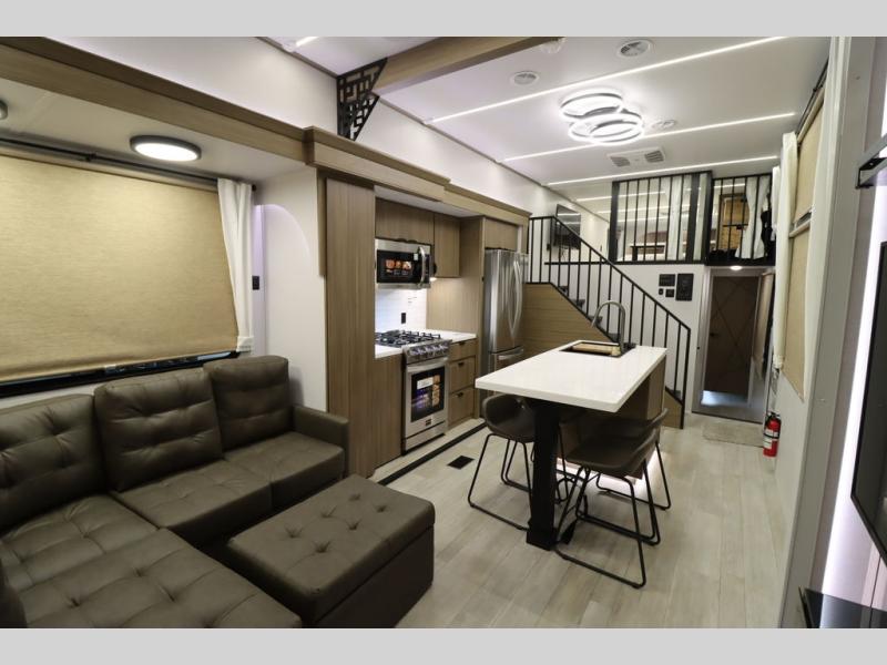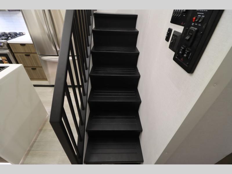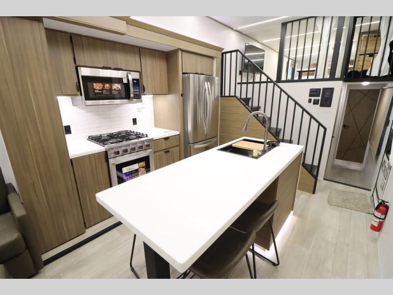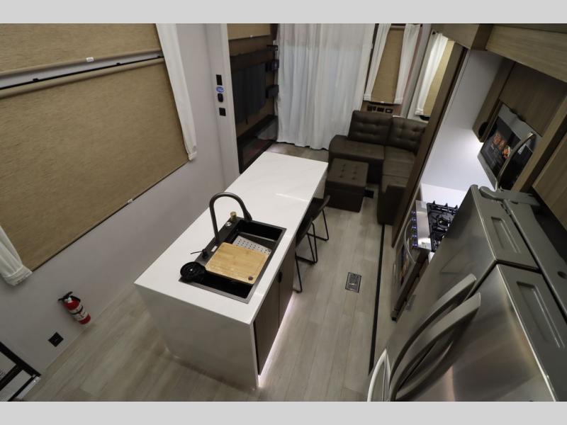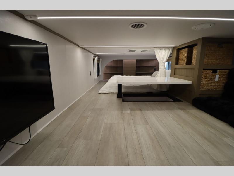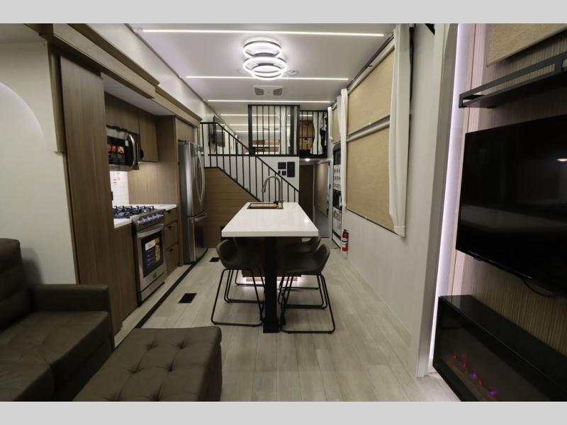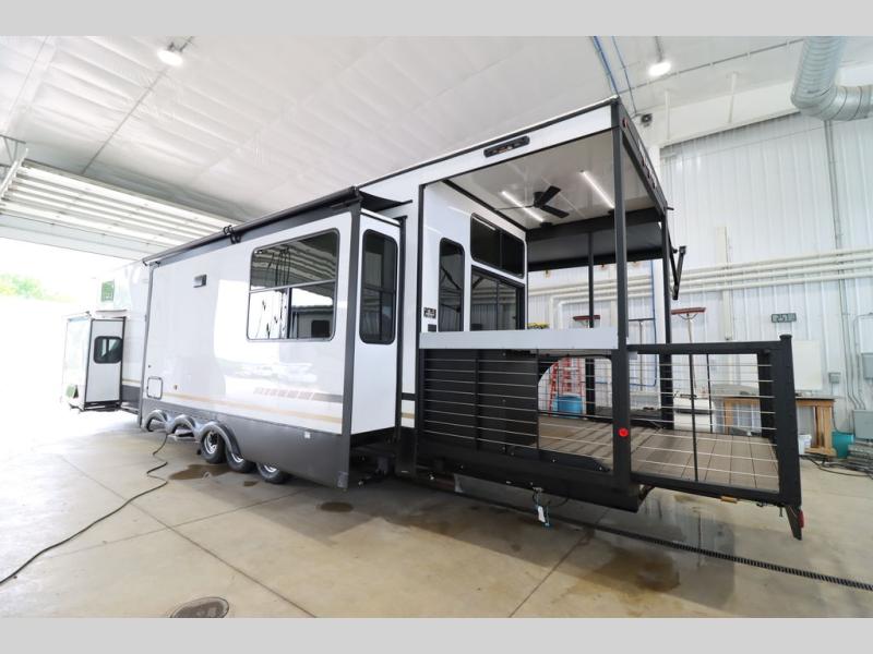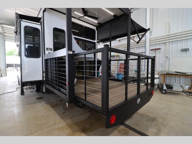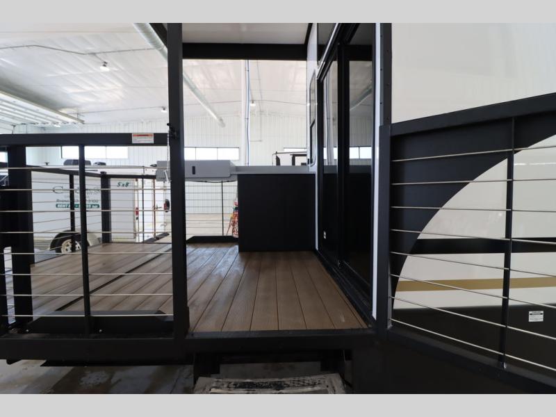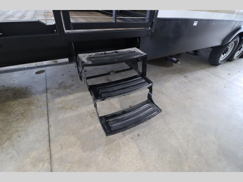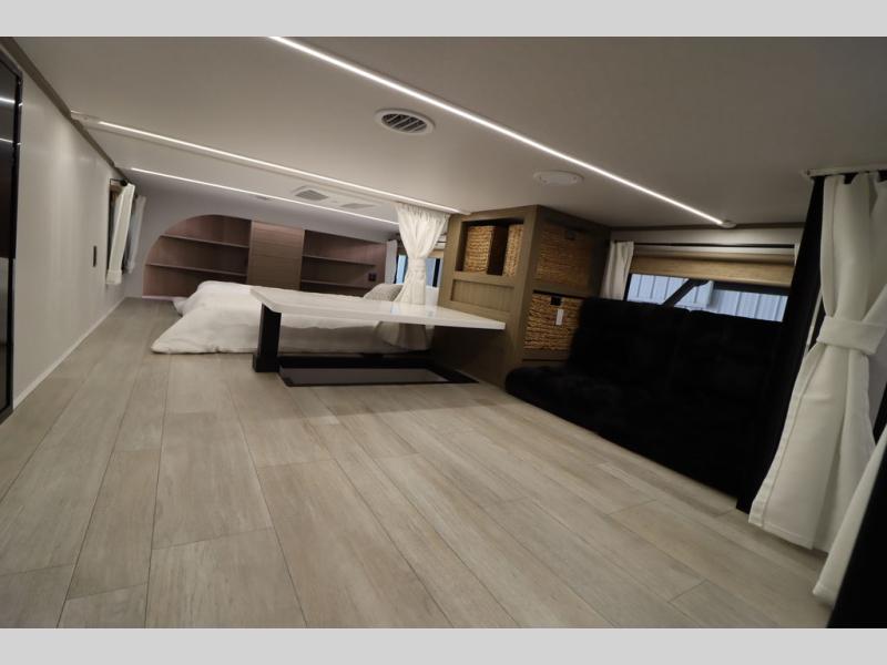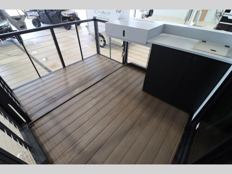 One look at this destination trailer and you'll be sold! The rear porch/veranda includes an outdoor kitchen with a cooktop and sink plus a ceiling fan so you can sit out back and visit with friends. The L-shaped sofa with an ottoman inside will provide cozy seating space, especially with the fireplace right across the room. Your crew can dine at the kitchen island with four chairs, and there is a large pantry where snacks can be kept for game night. When it's time to call it a night, the front private bedroom with a Versa-Tilt custom king bed is sure to bring comfort, and there is a dresser and wardrobe for your things. A third wardrobe includes washer and dryer prep if you choose to add those appliances. Any guests that aren't sleeping on the sofa can sleep in the loft with a queen bed, large front cabinet with shelves, and an additional cabinet for storage. You will also find a table with space below for your feet, so the kids can color, eat, and play games!