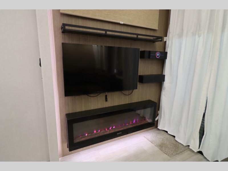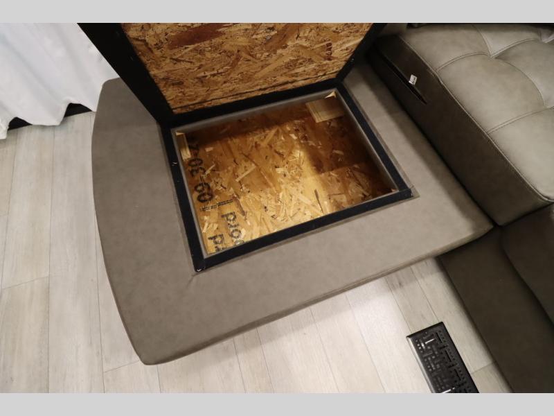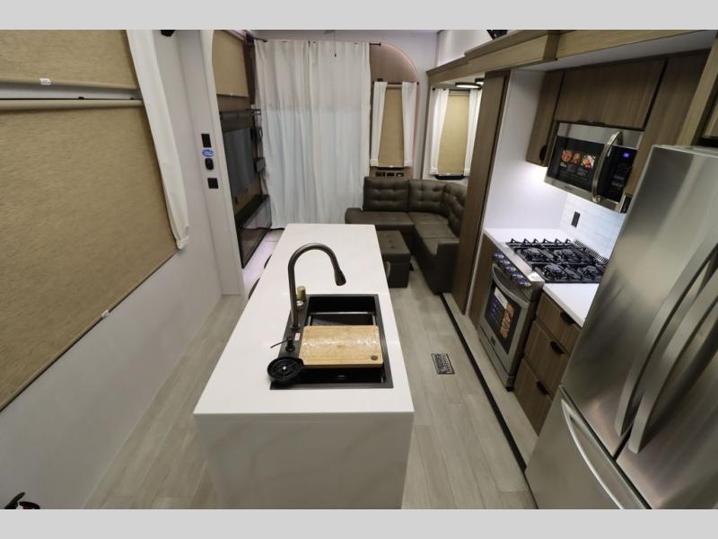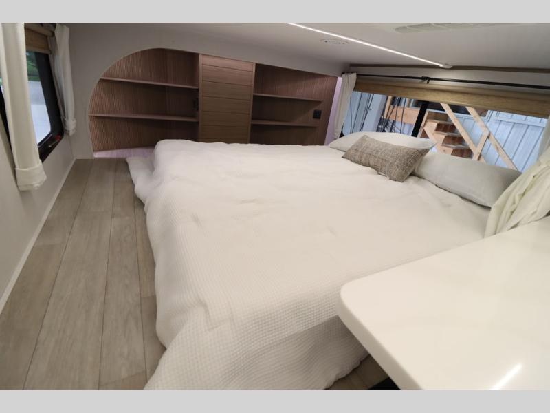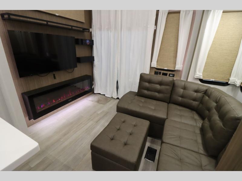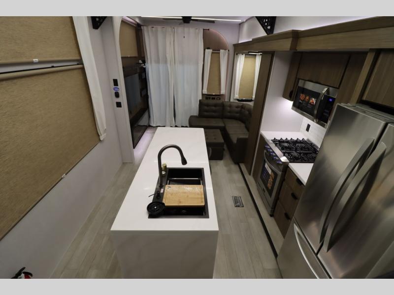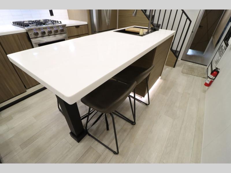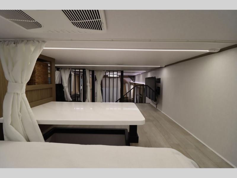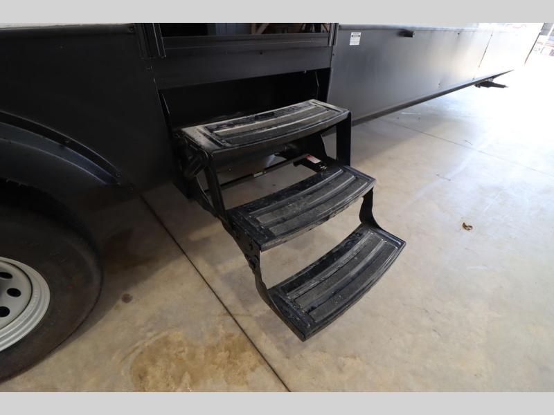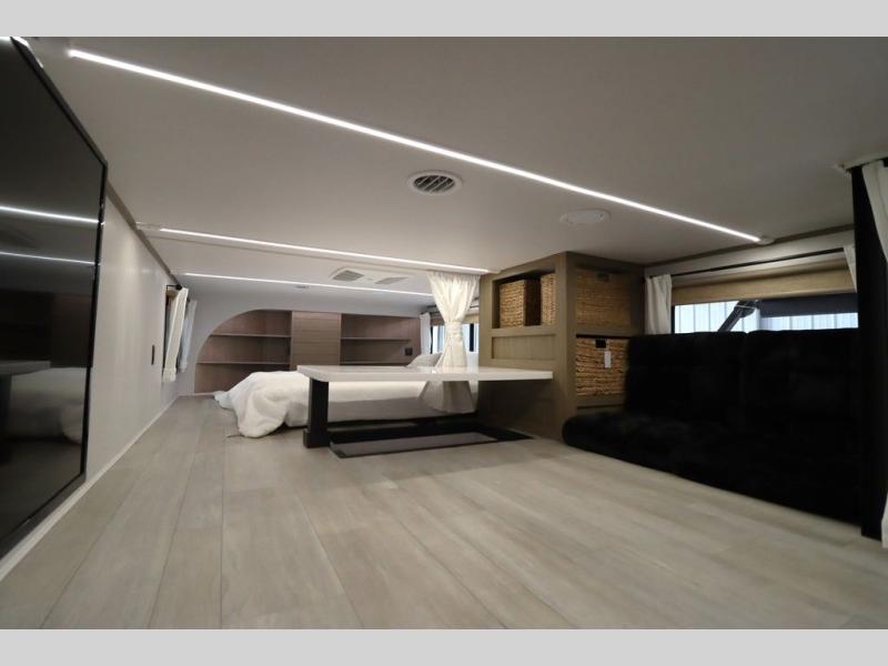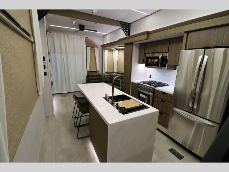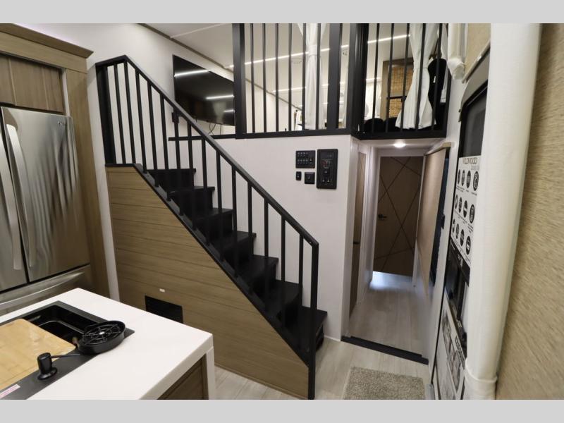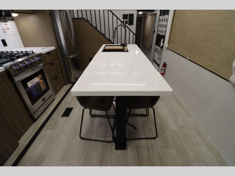 One look at this destination trailer and you'll be sold! The rear porch/veranda includes an outdoor kitchen with a cooktop and sink plus a ceiling fan so you can sit out back and visit with friends. The L-shaped sofa with an ottoman inside will provide cozy seating space, especially with the fireplace right across the room. Your crew can dine at the kitchen island with four chairs, and there is a large pantry where snacks can be kept for game night. When it's time to call it a night, the front private bedroom with a Versa-Tilt custom king bed is sure to bring comfort, and there is a dresser and wardrobe for your things. A third wardrobe includes washer and dryer prep if you choose to add those appliances. Any guests that aren't sleeping on the sofa can sleep in the loft with a queen bed, large front cabinet with shelves, and an additional cabinet for storage. You will also find a table with space below for your feet, so the kids can color, eat, and play games!