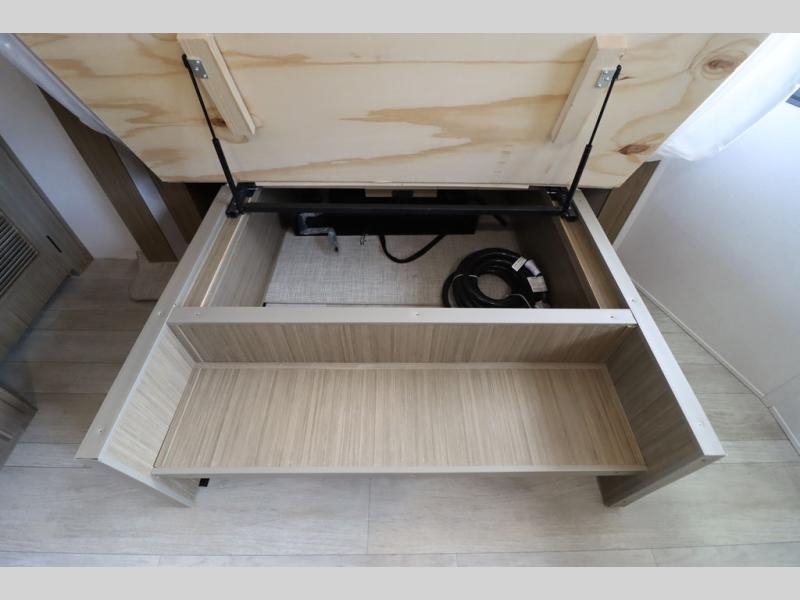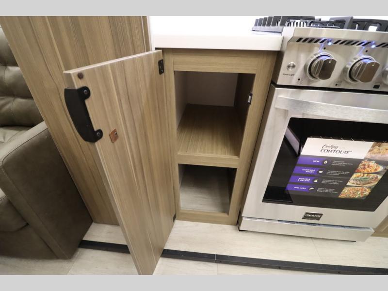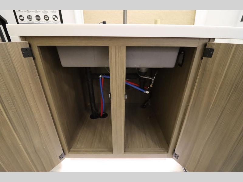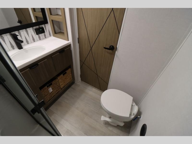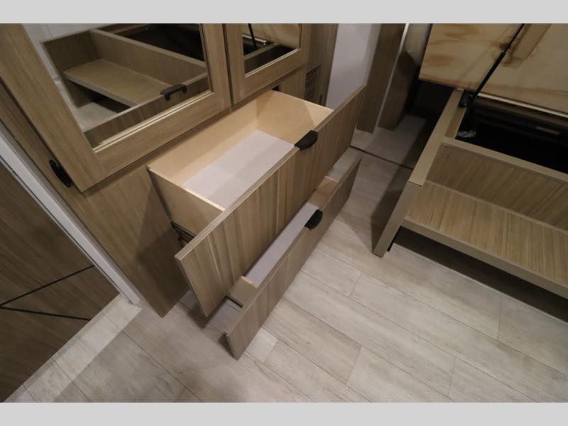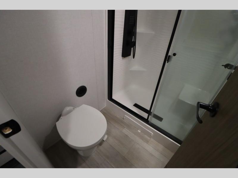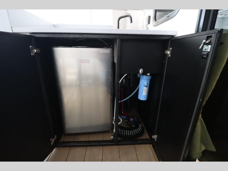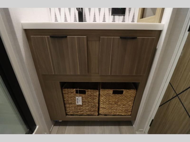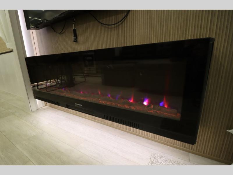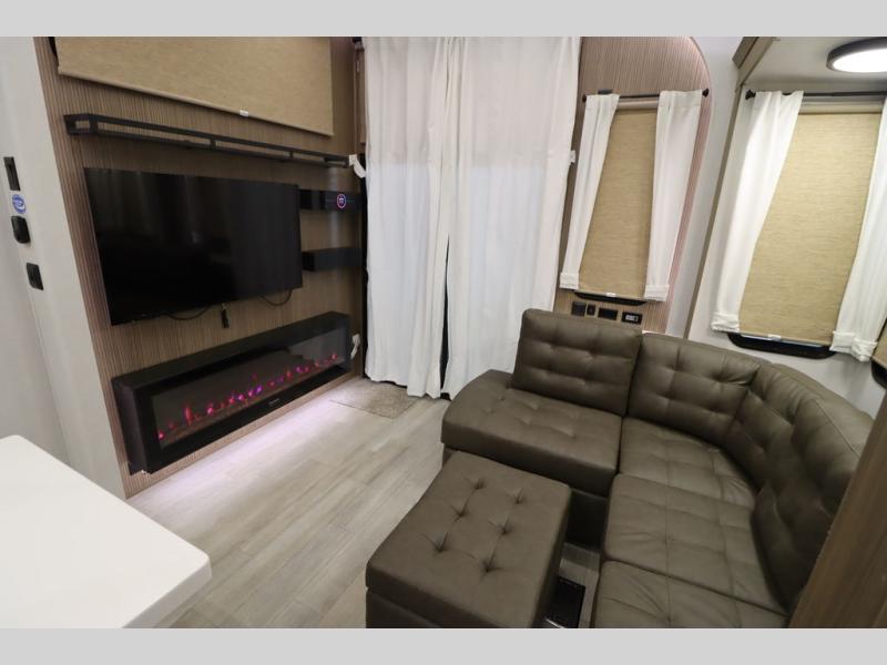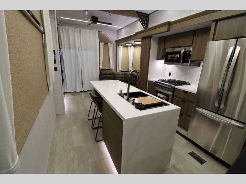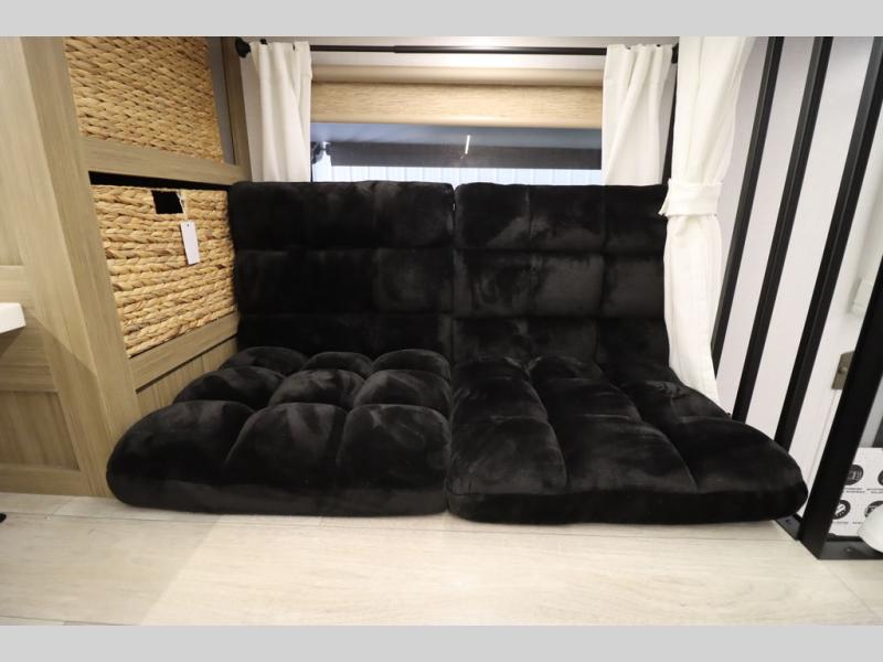 One look at this destination trailer and you'll be sold! The rear porch/veranda includes an outdoor kitchen with a cooktop and sink plus a ceiling fan so you can sit out back and visit with friends. The L-shaped sofa with an ottoman inside will provide cozy seating space, especially with the fireplace right across the room. Your crew can dine at the kitchen island with four chairs, and there is a large pantry where snacks can be kept for game night. When it's time to call it a night, the front private bedroom with a Versa-Tilt custom king bed is sure to bring comfort, and there is a dresser and wardrobe for your things. A third wardrobe includes washer and dryer prep if you choose to add those appliances. Any guests that aren't sleeping on the sofa can sleep in the loft with a queen bed, large front cabinet with shelves, and an additional cabinet for storage. You will also find a table with space below for your feet, so the kids can color, eat, and play games!