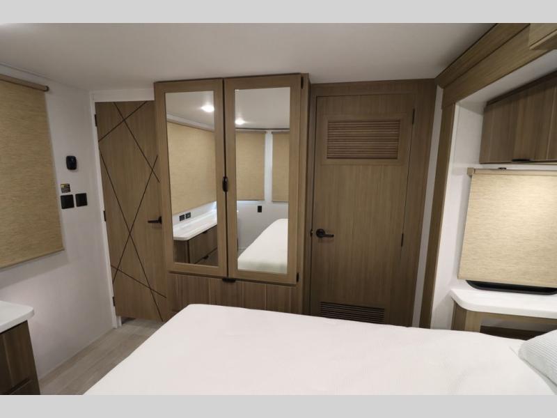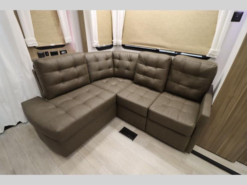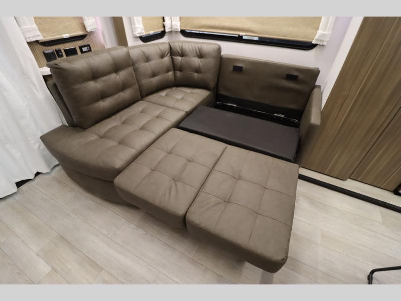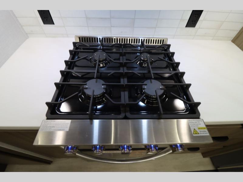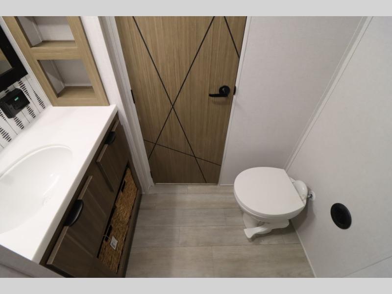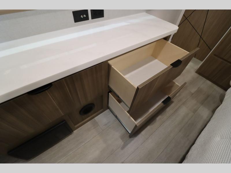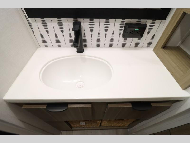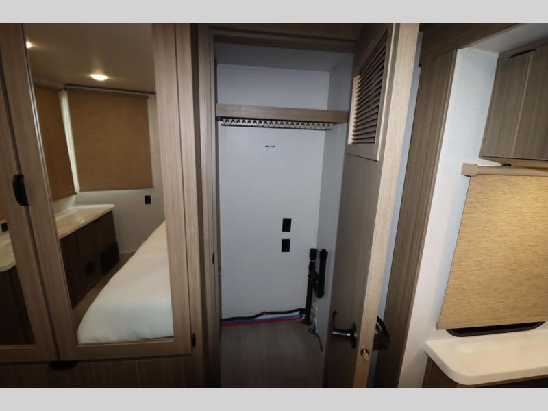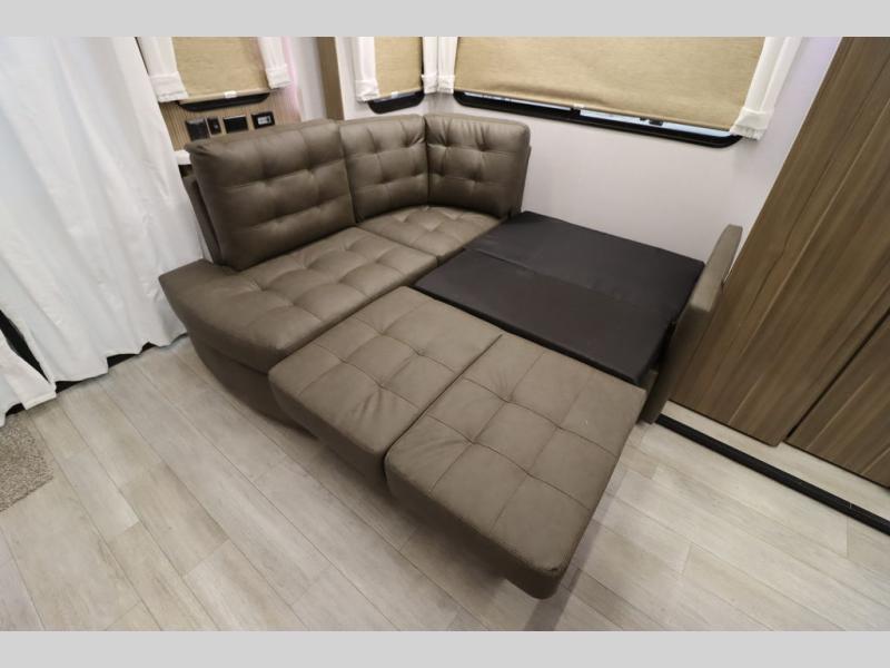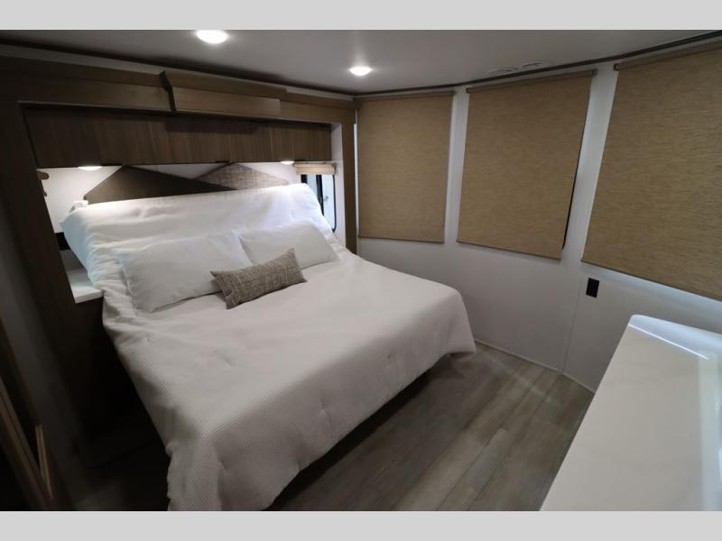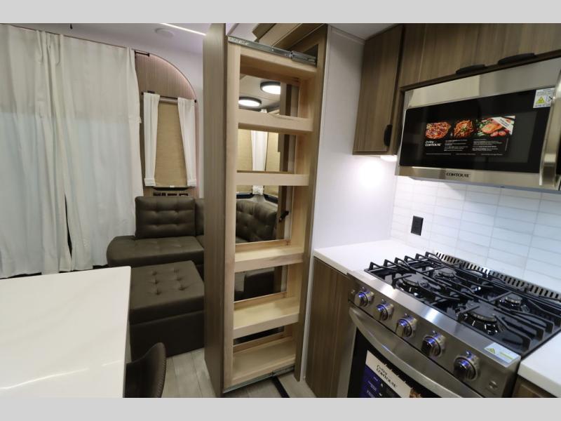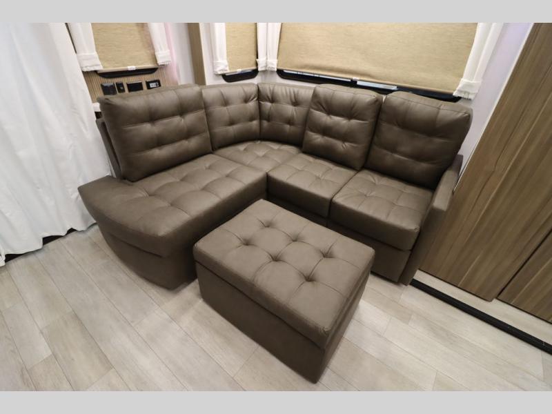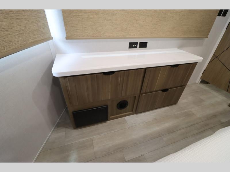 One look at this destination trailer and you'll be sold! The rear porch/veranda includes an outdoor kitchen with a cooktop and sink plus a ceiling fan so you can sit out back and visit with friends. The L-shaped sofa with an ottoman inside will provide cozy seating space, especially with the fireplace right across the room. Your crew can dine at the kitchen island with four chairs, and there is a large pantry where snacks can be kept for game night. When it's time to call it a night, the front private bedroom with a Versa-Tilt custom king bed is sure to bring comfort, and there is a dresser and wardrobe for your things. A third wardrobe includes washer and dryer prep if you choose to add those appliances. Any guests that aren't sleeping on the sofa can sleep in the loft with a queen bed, large front cabinet with shelves, and an additional cabinet for storage. You will also find a table with space below for your feet, so the kids can color, eat, and play games!