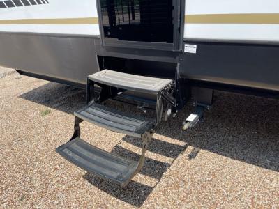 You will feel right at home in this destination trailer! It not only has one loft in the rear with two 42" x 74" bunk mats, but also a second loft in the front with spiral steps leading up to two bunk mats. The front private bedroom has a king bed slide with versa-tilt to lay your head on at night with front windows to let in lots of natural lighting and sunshine in the morning. Relax in true comfort at night on the L-shaped sectional sofa across from the entertainment center with a fireplace. The kitchen island provides extra space to prepare delicious meals and comes with four bar stools to enjoy your breakfast each morning. Everyone will stay fresh and clean with a walk-in shower in the rear private bedroom, plus there is an area prepped so you could add an optional washer and dryer. Head outside through either the patio door or the second entry/exit door each day!