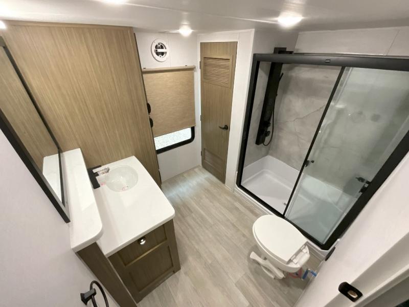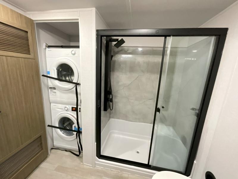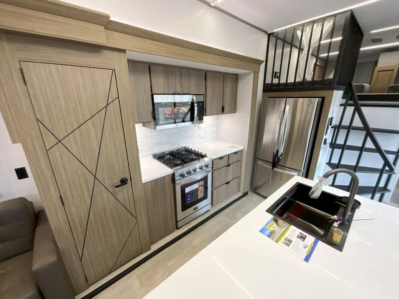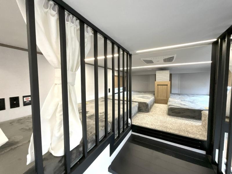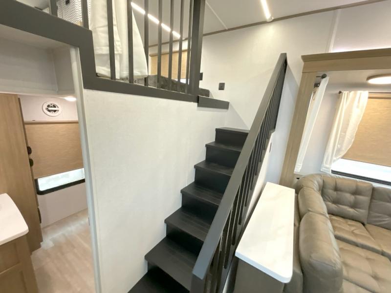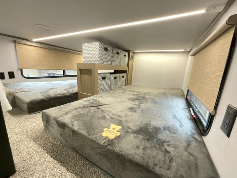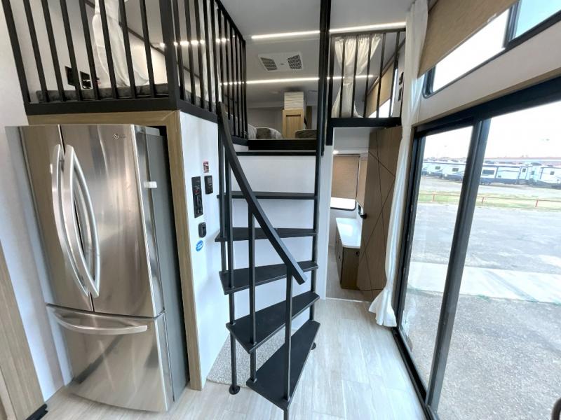 You will feel right at home in this destination trailer! It not only has one loft in the rear with two 42" x 74" bunk mats, but also a second loft in the front with spiral steps leading up to two bunk mats. The front private bedroom has a king bed slide with Versa-Tilt to lay your head on at night with front windows to let in lots of natural lighting and sunshine in the morning. Relax in true comfort at night on the L-shaped sectional sofa across from the entertainment center with a fireplace. The kitchen island provides extra space to prepare delicious meals and comes with four bar stools to enjoy your breakfast each morning. Everyone will stay fresh and clean with a walk-in shower in the rear private bedroom, plus there washer and dryer prep if you choose to add those appliances. Head outside through either the patio door or the second entry/exit door each day!
