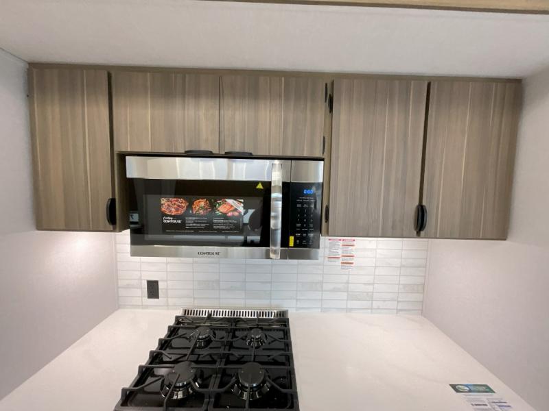 With any Wildwood Grand Lodge destination trailer by Forest River, you can enjoy extended stays wherever you go! There is 4K awning blade lighting outside, along with slide out awning toppers, plus a heated and enclosed Accessibelly for added protection. Inside, you'll love the stylish backsplash update, elegant curtain rods and curtains, TFL black walnut entertainment shelves, and stainless steel kitchen appliances. A Serta mattress in the bedroom(s) will provide comfort to each journey, and there is a tankless water heater for hot water when you need it.