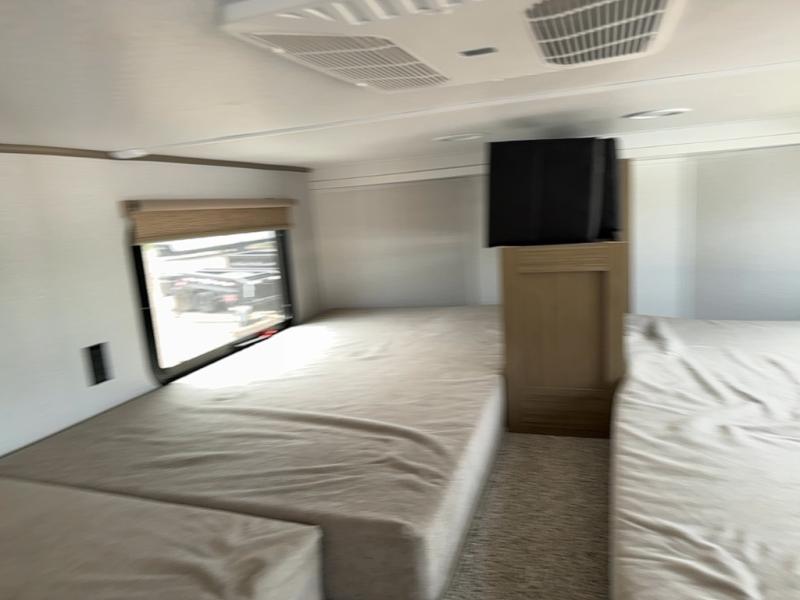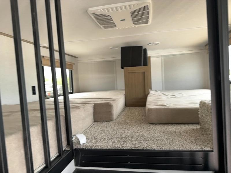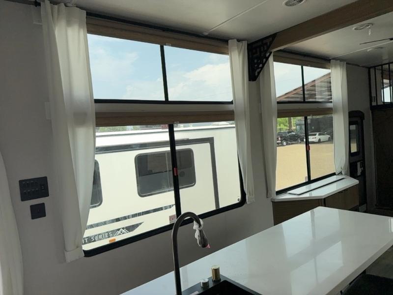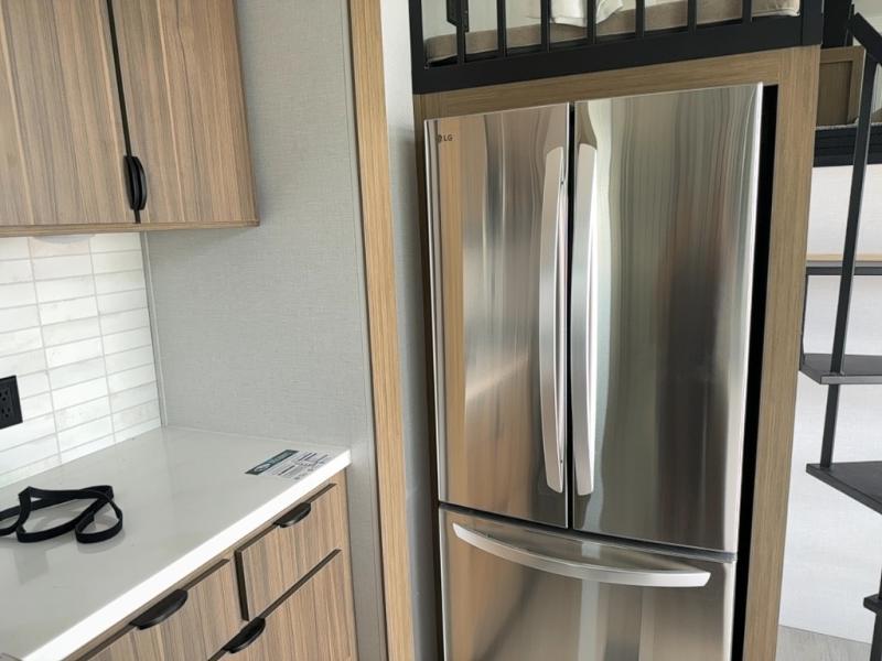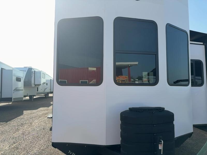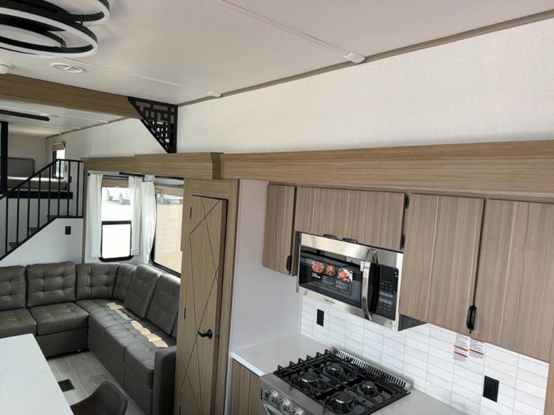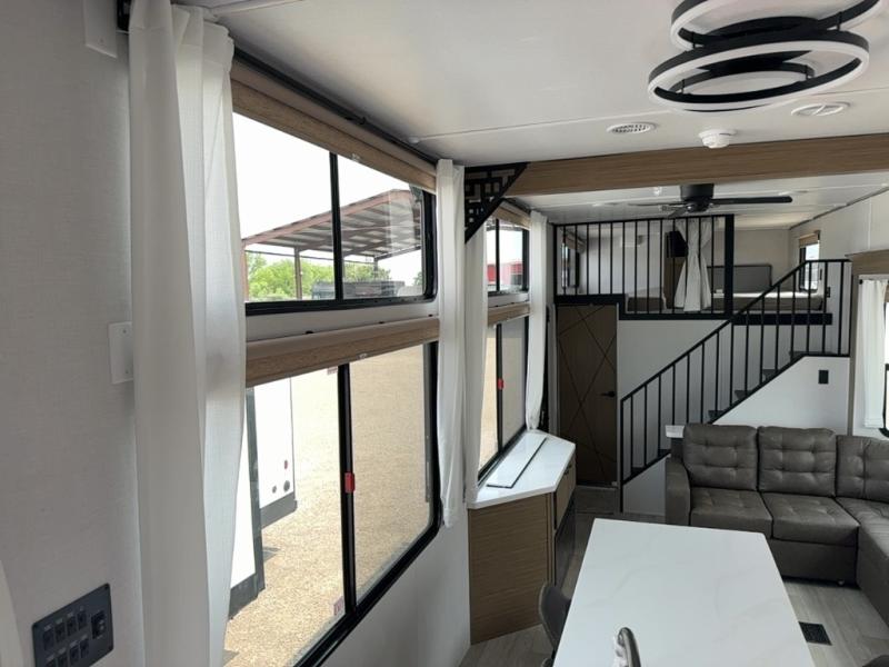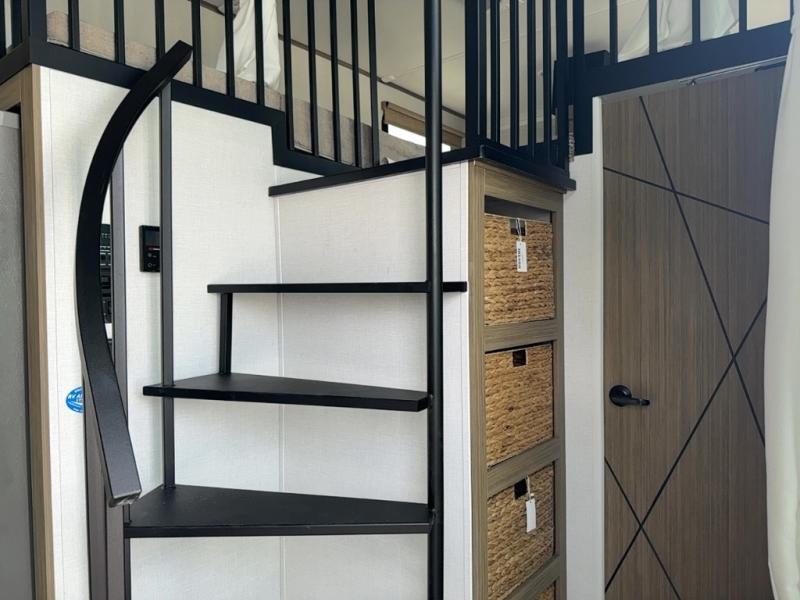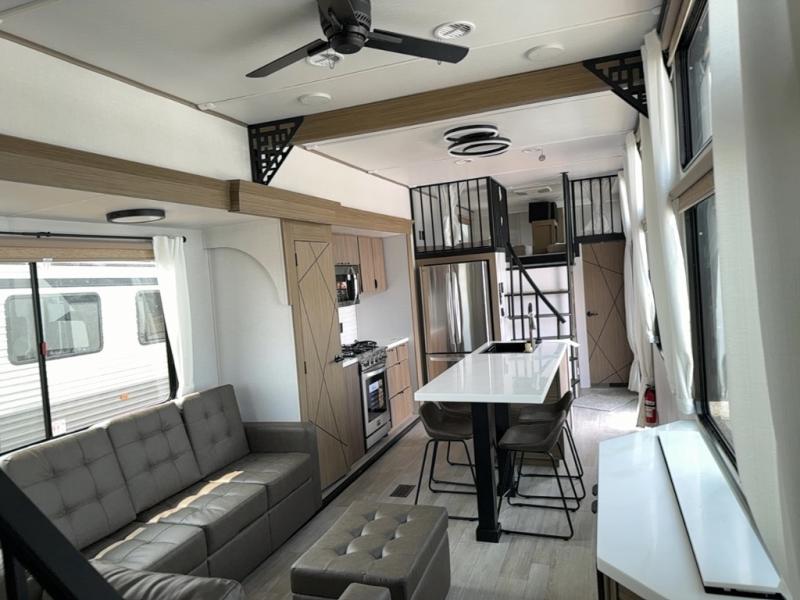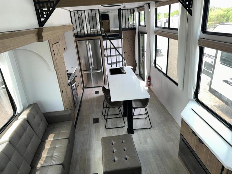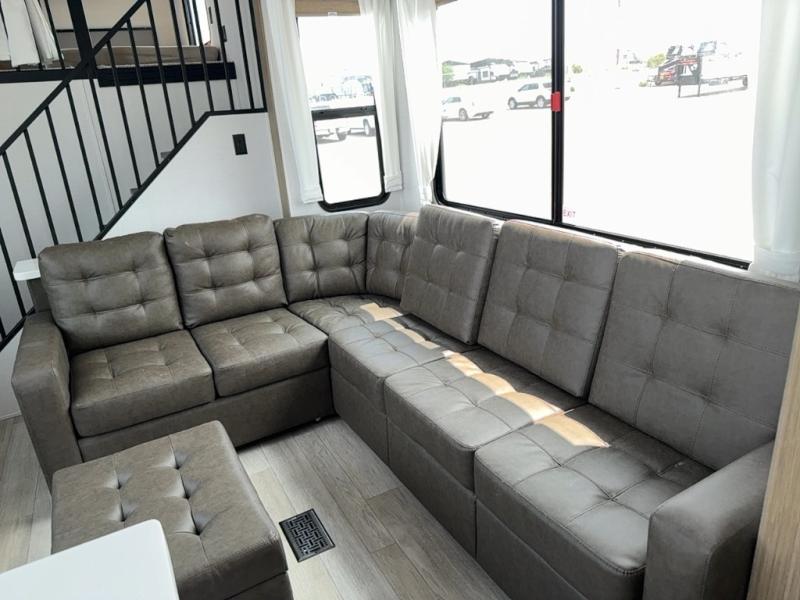 You will feel right at home in this destination trailer! It not only has one loft in the rear with two 42" x 74" bunk mats, but also a second loft in the front with spiral steps leading up to two bunk mats. The front private bedroom has a king bed slide with Versa-Tilt to lay your head on at night with front windows to let in lots of natural lighting and sunshine in the morning. Relax in true comfort at night on the L-shaped sectional sofa across from the entertainment center with a fireplace. The kitchen island provides extra space to prepare delicious meals and comes with four bar stools to enjoy your breakfast each morning. Everyone will stay fresh and clean with a walk-in shower in the rear private bedroom, plus there washer and dryer prep if you choose to add those appliances. Head outside through either the patio door or the second entry/exit door each day!