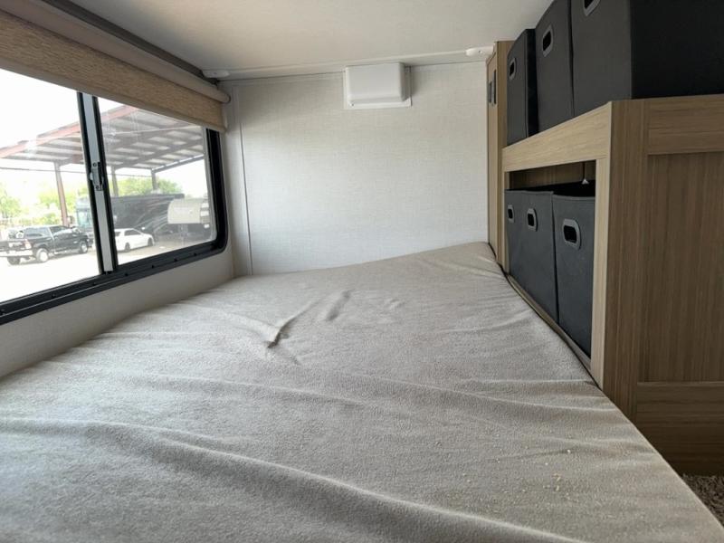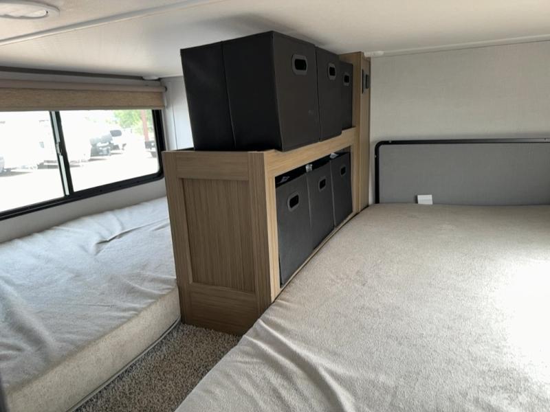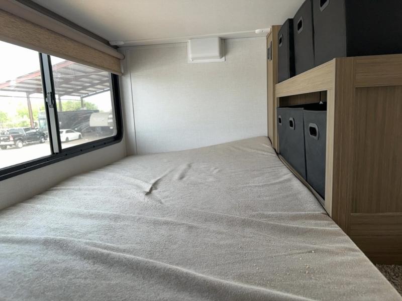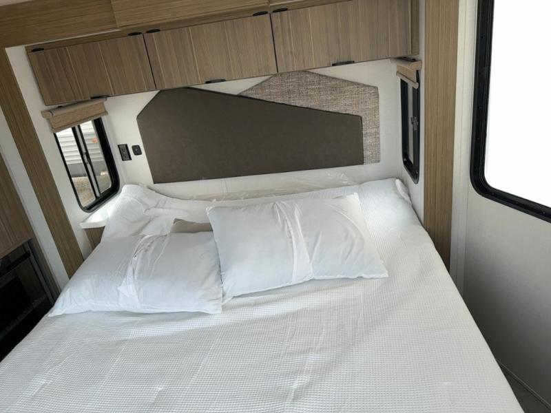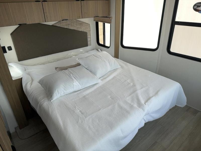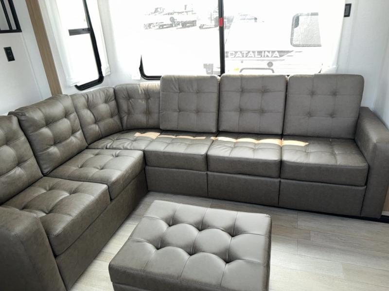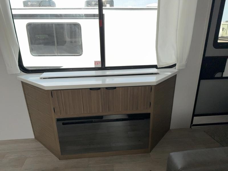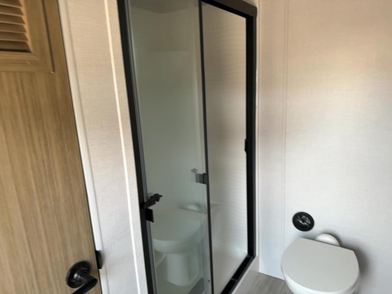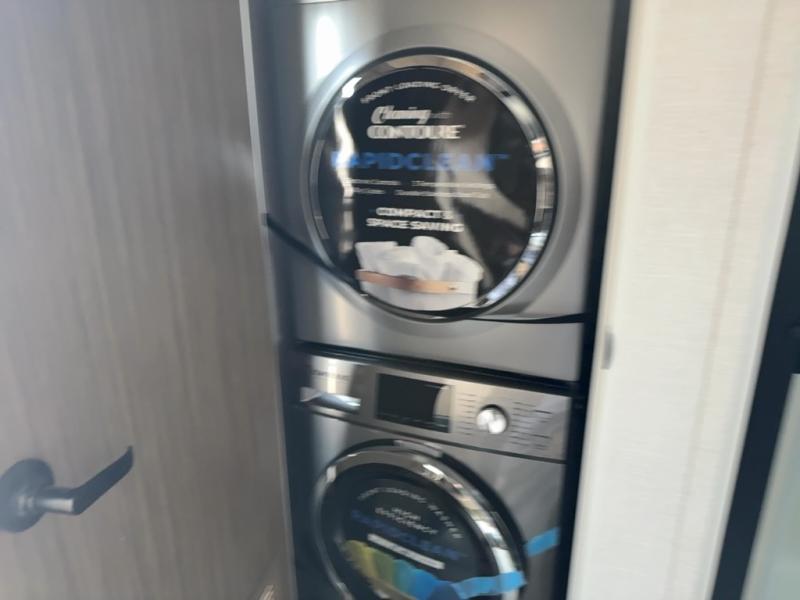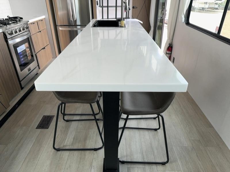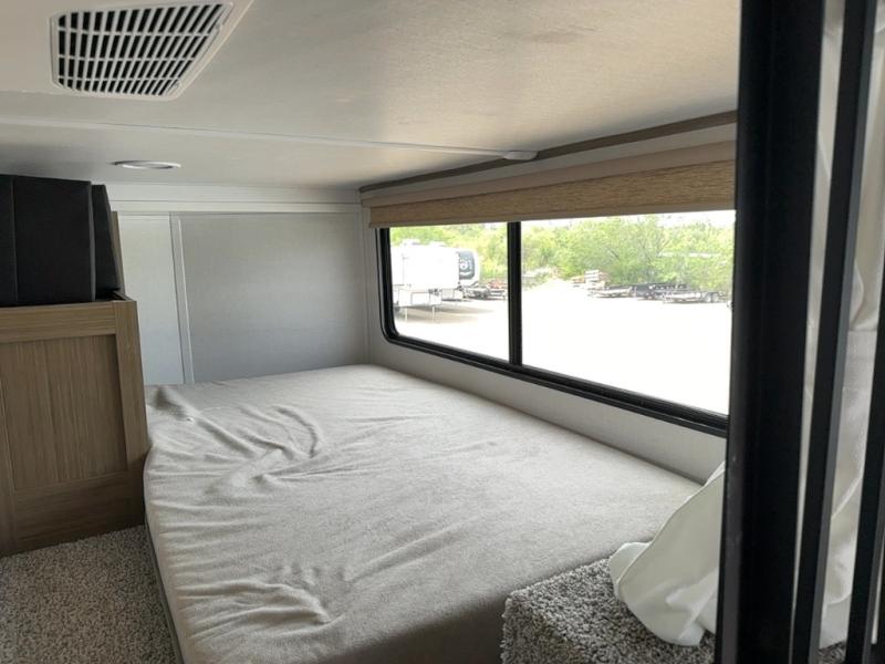 You will feel right at home in this destination trailer! It not only has one loft in the rear with two 42" x 74" bunk mats, but also a second loft in the front with spiral steps leading up to two bunk mats. The front private bedroom has a king bed slide with Versa-Tilt to lay your head on at night with front windows to let in lots of natural lighting and sunshine in the morning. Relax in true comfort at night on the L-shaped sectional sofa across from the entertainment center with a fireplace. The kitchen island provides extra space to prepare delicious meals and comes with four bar stools to enjoy your breakfast each morning. Everyone will stay fresh and clean with a walk-in shower in the rear private bedroom, plus there washer and dryer prep if you choose to add those appliances. Head outside through either the patio door or the second entry/exit door each day!