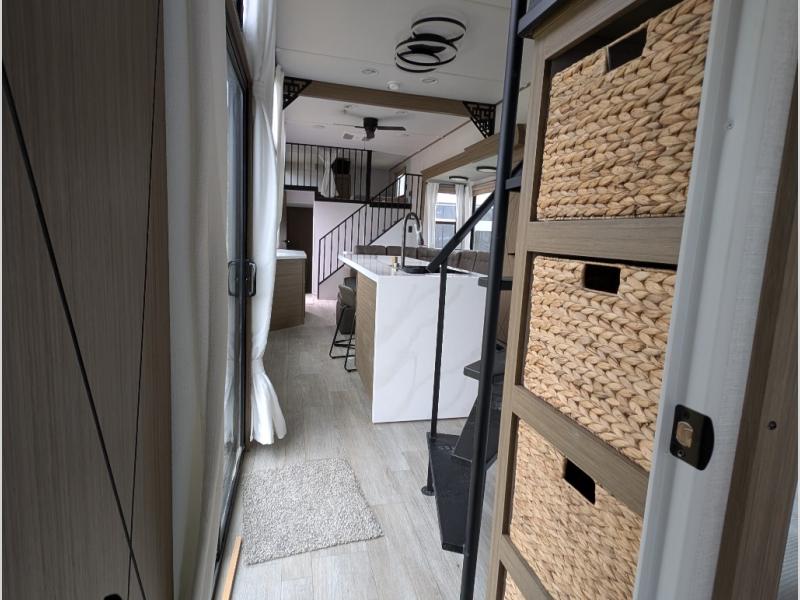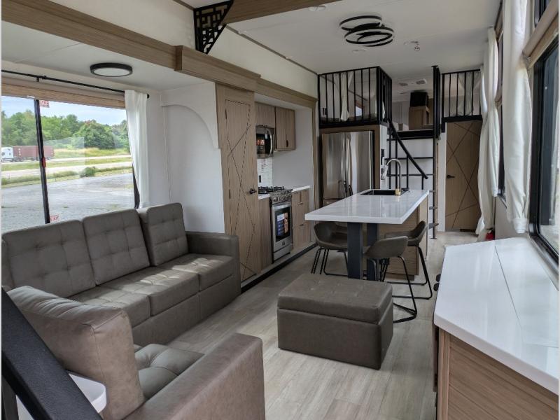 You will feel right at home in this destination trailer! It not only has one loft in the rear with two 42" x 74" bunk mats, but also a second loft in the front with spiral steps leading up to two bunk mats. The front private bedroom has a king bed slide with Versa-Tilt to lay your head on at night with front windows to let in lots of natural lighting and sunshine in the morning. Relax in true comfort at night on the L-shaped sectional sofa across from the entertainment center with a fireplace. The kitchen island provides extra space to prepare delicious meals and comes with four bar stools to enjoy your breakfast each morning. Everyone will stay fresh and clean with a walk-in shower in the rear private bedroom, plus there washer and dryer prep if you choose to add those appliances. Head outside through either the patio door or the second entry/exit door each day!
