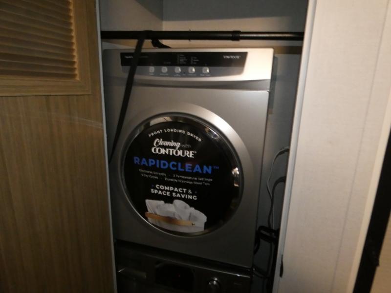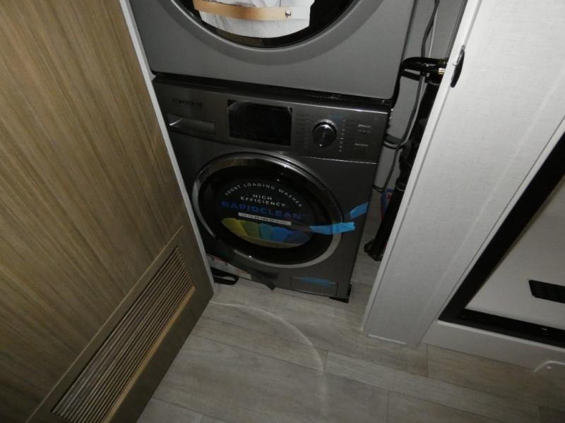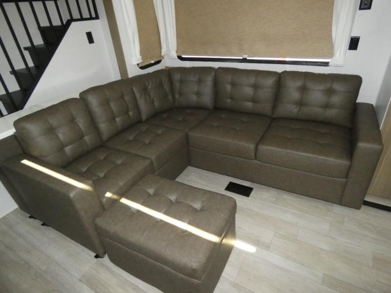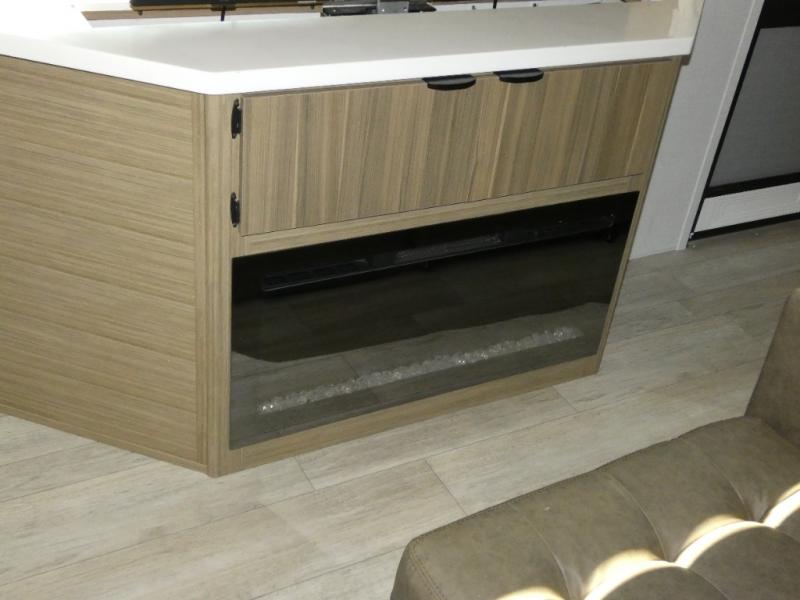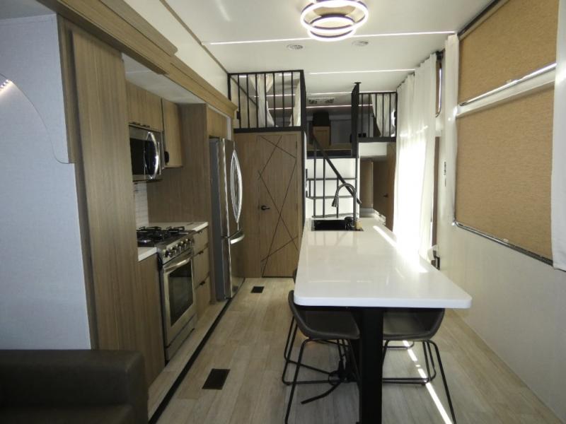 You will feel like you are home when you step inside! Not only will you be impressed with the super large slide in the main combined kitchen and living area, but check out the island with four counter height seats! The main entry closest to the front features a private bedroom with a custom king bed with Versa-Tilt within a slide, plus a fireplace and a dresser for your belongings. Just outside this door is a spiral staircase to the front loft with two 42" x 74" bunk mats above. The kitchen is fully equipped for you to provide the best home cooked meals with a pull-out pantry, range and microwave, plus side-by-side refrigerator. There is also a half bath off of the kitchen for added convenience! An L-shaped sectional sofa with an ottoman provides a cozy space to relax, and there is an entertainment center with a fireplace for a relaxing evenings indoors. A full rear bath features a spacious walk-in shower, a linen closet plus washer and dryer prep for the option to make laundry day easier. And the second loft with stairs is above the bath for even more sleeping space!