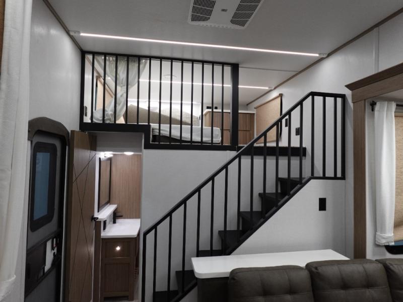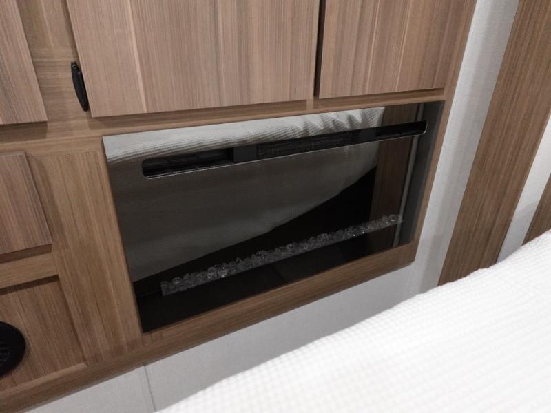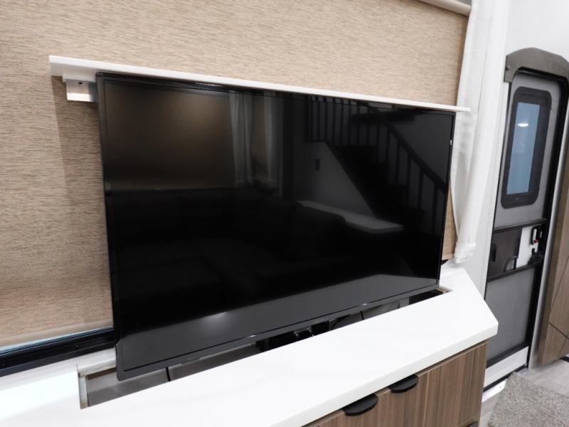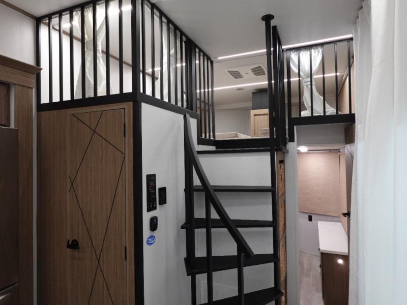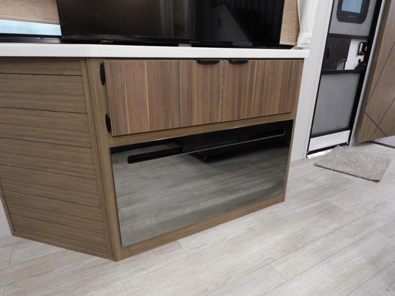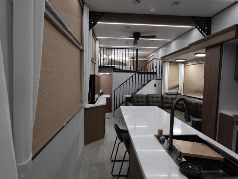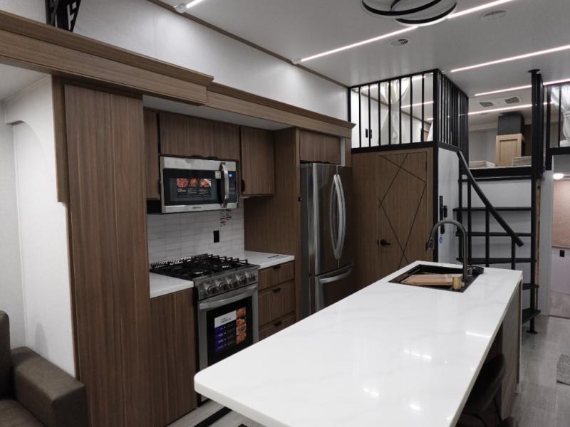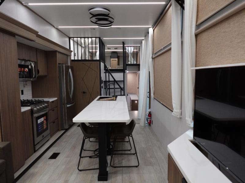You will feel like you are home when you step inside! Not only will you be impressed with the super large slide in the main combined kitchen and living area, but check out the island with four counter height seats! The main entry closest to the front features a private bedroom with a custom king bed with Versa-Tilt within a slide, plus a fireplace and a dresser for your belongings. Just outside this door is a spiral staircase to the front loft with two 42" x 74" bunk mats above. The kitchen is fully equipped for you to provide the best home cooked meals with a pull-out pantry, range and microwave, plus side-by-side refrigerator. There is also a half bath off of the kitchen for added convenience! An L-shaped sectional sofa with an ottoman provides a cozy space to relax, and there is an entertainment center with a fireplace for a relaxing evenings indoors. A full rear bath features a spacious walk-in shower, a linen closet and the second loft with stairs is above the bath for even more sleeping space!