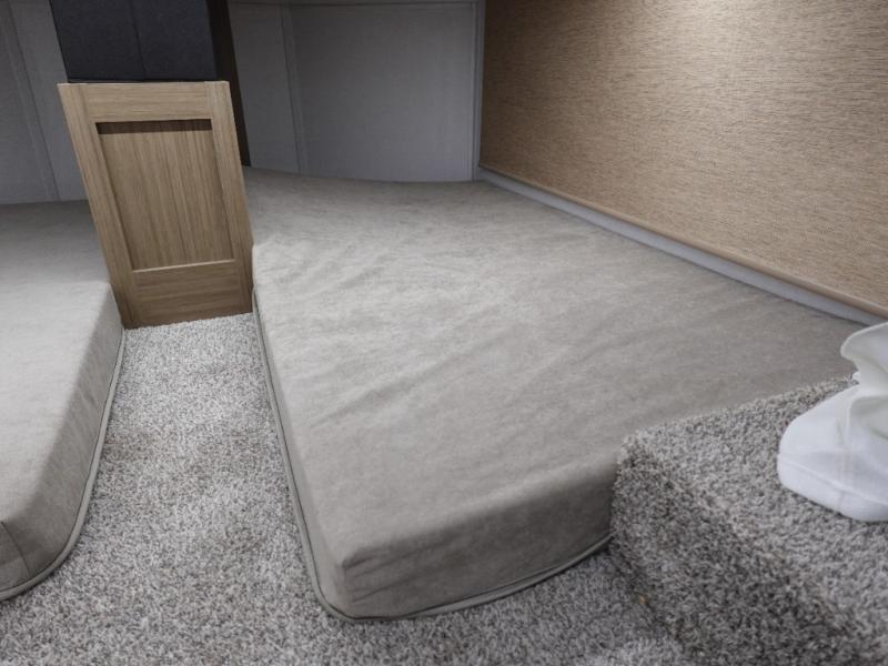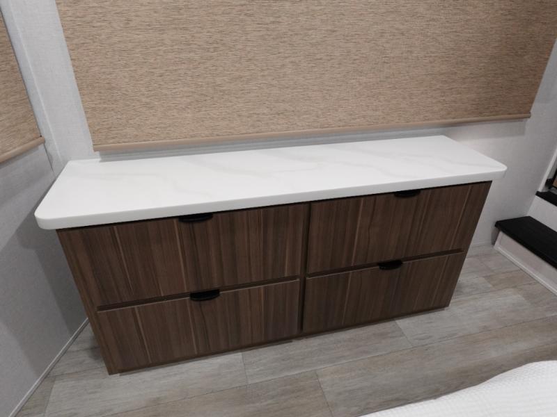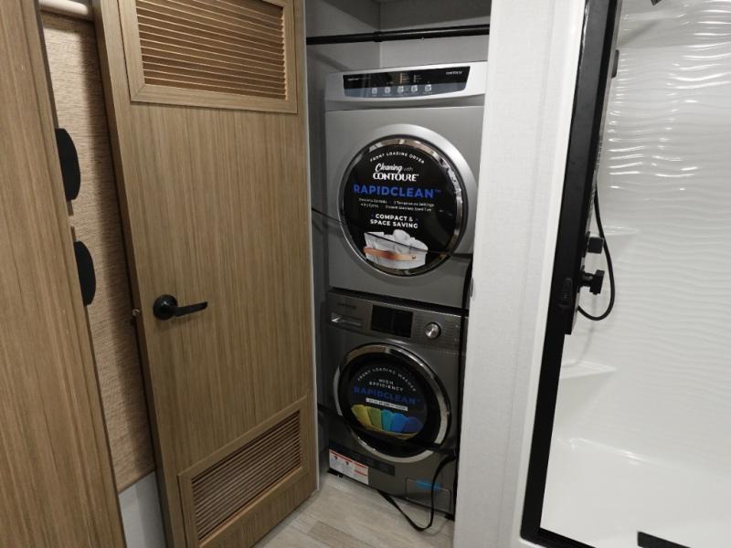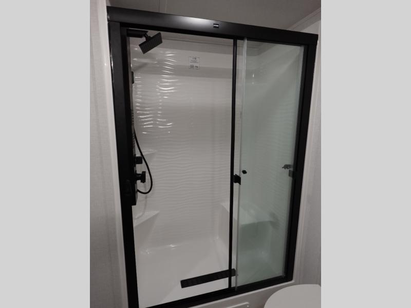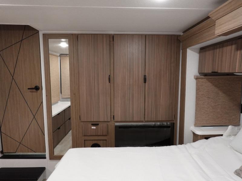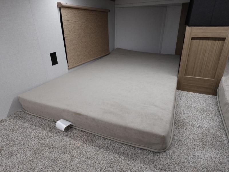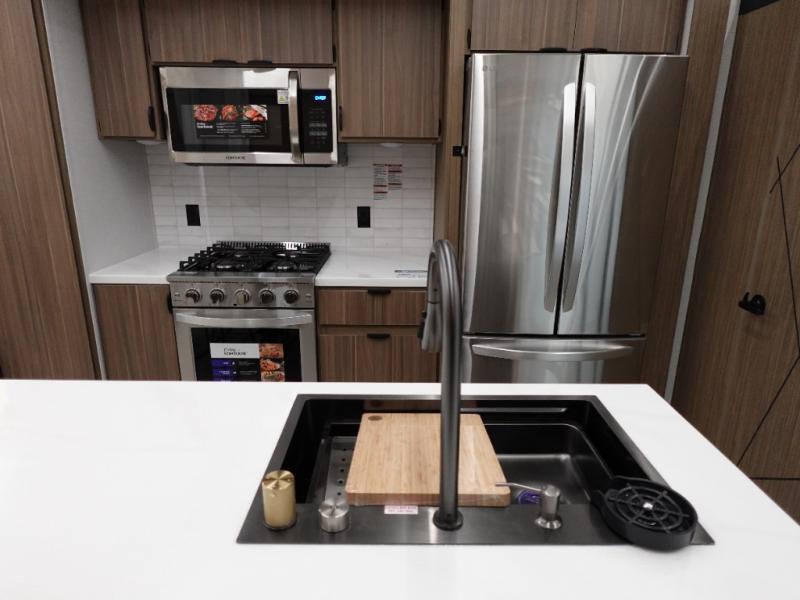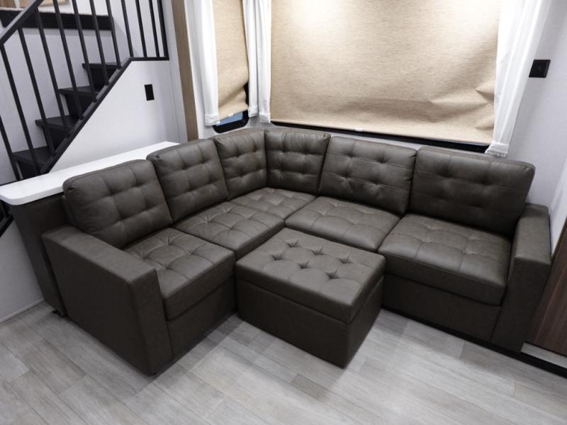 You will feel like you are home when you step inside! Not only will you be impressed with the super large slide in the main combined kitchen and living area, but check out the island with four counter height seats! The main entry closest to the front features a private bedroom with a custom king bed with Versa-Tilt within a slide, plus a fireplace and a dresser for your belongings. Just outside this door is a spiral staircase to the front loft with two 42" x 74" bunk mats above. The kitchen is fully equipped for you to provide the best home cooked meals with a pull-out pantry, range and microwave, plus side-by-side refrigerator. There is also a half bath off of the kitchen for added convenience! An L-shaped sectional sofa with an ottoman provides a cozy space to relax, and there is an entertainment center with a fireplace for a relaxing evenings indoors. A full rear bath features a spacious walk-in shower, a linen closet and the second loft with stairs is above the bath for even more sleeping space!