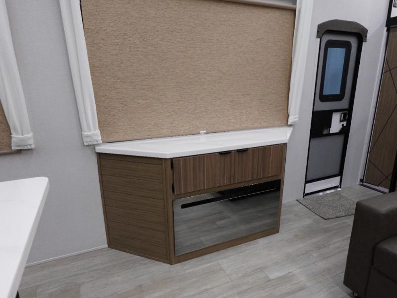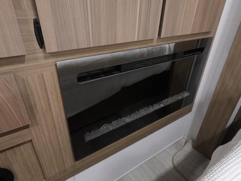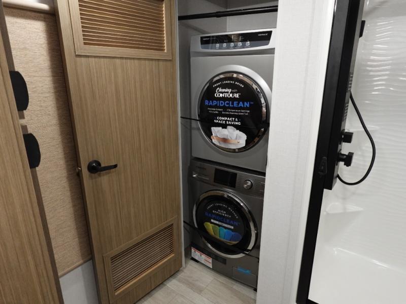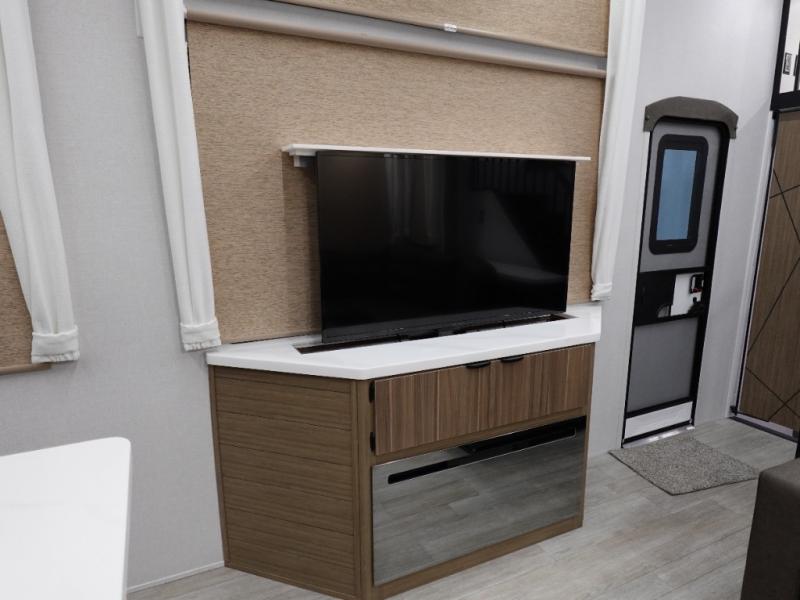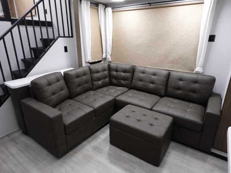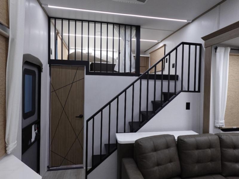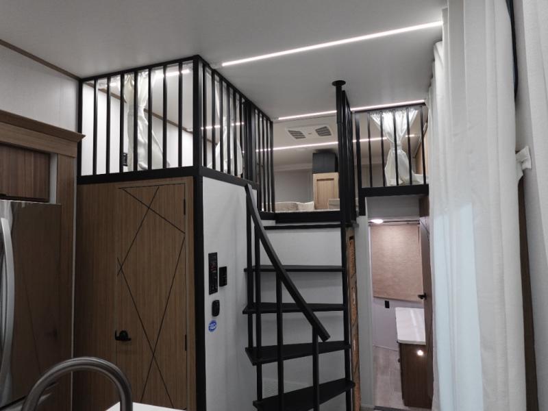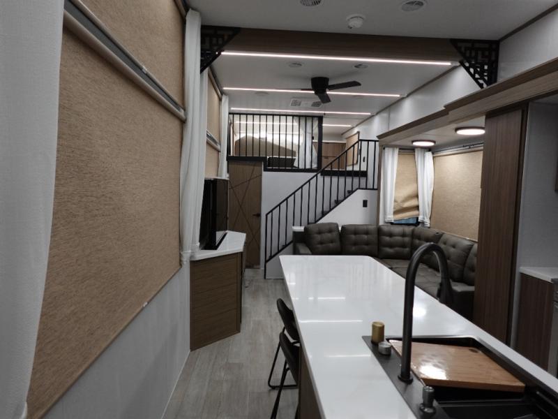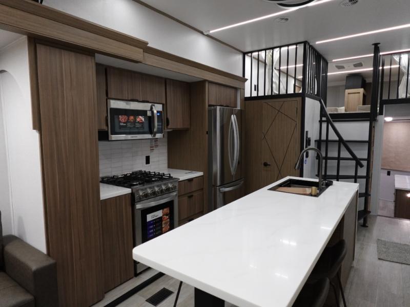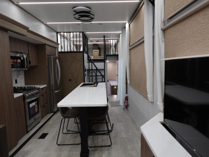 You will feel like you are home when you step inside! Not only will you be impressed with the super large slide in the main combined kitchen and living area, but check out the island with four counter height seats! The main entry closest to the front features a private bedroom with a custom king bed with Versa-Tilt within a slide, plus a fireplace and a dresser for your belongings. Just outside this door is a spiral staircase to the front loft with two 42" x 74" bunk mats above. The kitchen is fully equipped for you to provide the best home cooked meals with a pull-out pantry, range and microwave, plus side-by-side refrigerator. There is also a half bath off of the kitchen for added convenience! An L-shaped sectional sofa with an ottoman provides a cozy space to relax, and there is an entertainment center with a fireplace for a relaxing evenings indoors. A full rear bath features a spacious walk-in shower, a linen closet plus washer and dryer to make laundry day easier. And the second loft with stairs is above the bath for even more sleeping space!