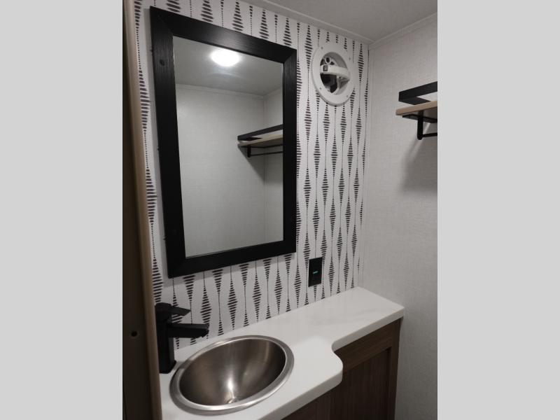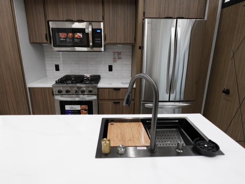 With any Wildwood Grand Lodge destination trailer by Forest River, you can enjoy extended stays wherever you go! There is 4K awning blade lighting outside, along with slide out awning toppers, plus a heated and enclosed Accessibelly for added protection. Inside, you'll love the stylish backsplash update, elegant curtain rods and curtains, TFL black walnut entertainment shelves, and stainless steel kitchen appliances. A Serta mattress in the bedroom(s) will provide comfort to each journey, and there is a tankless water heater for hot water when you need it.
