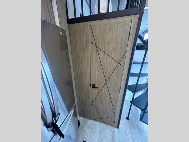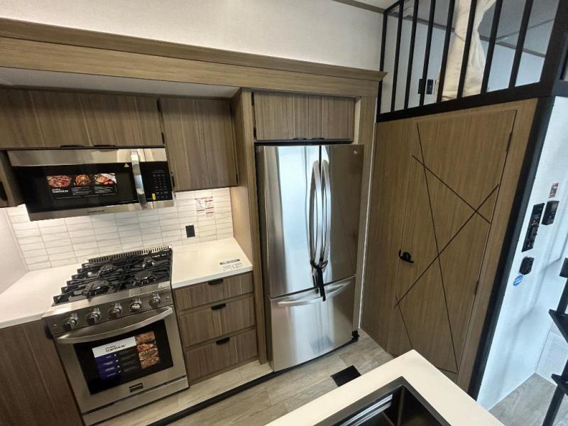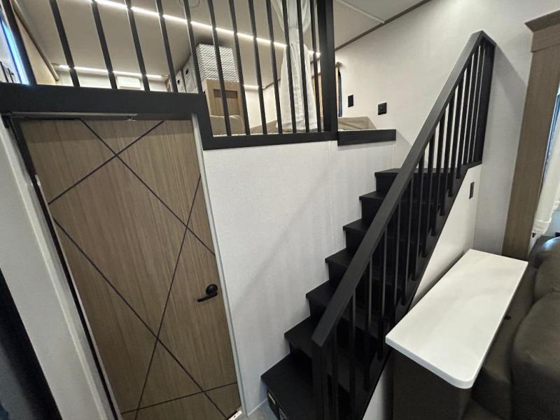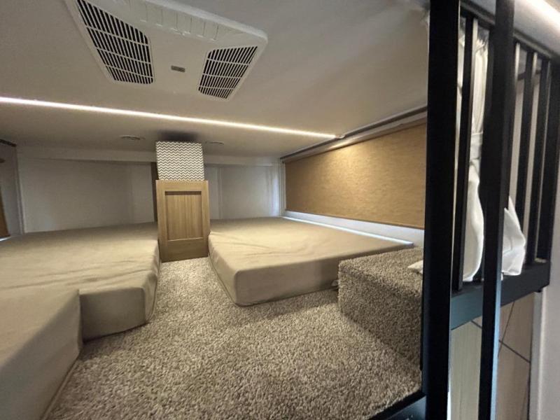 The 2025 Forest River Wildwood Grand Lodge 44VIEW is a spacious destination trailer designed for extended stays and family comfort. Measuring 45 feet 2 inches in length and 13 feet 3 inches in height, it offers ample living space. The trailer features two loft areas: a front loft with two 42" x 74" bunk mats accessible via a spiral staircase, and a rear loft with a 62" x 74" Versa Queen mattress and dresser, providing separate sleeping and storage spaces.