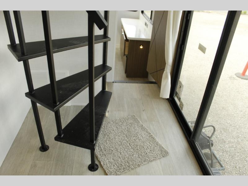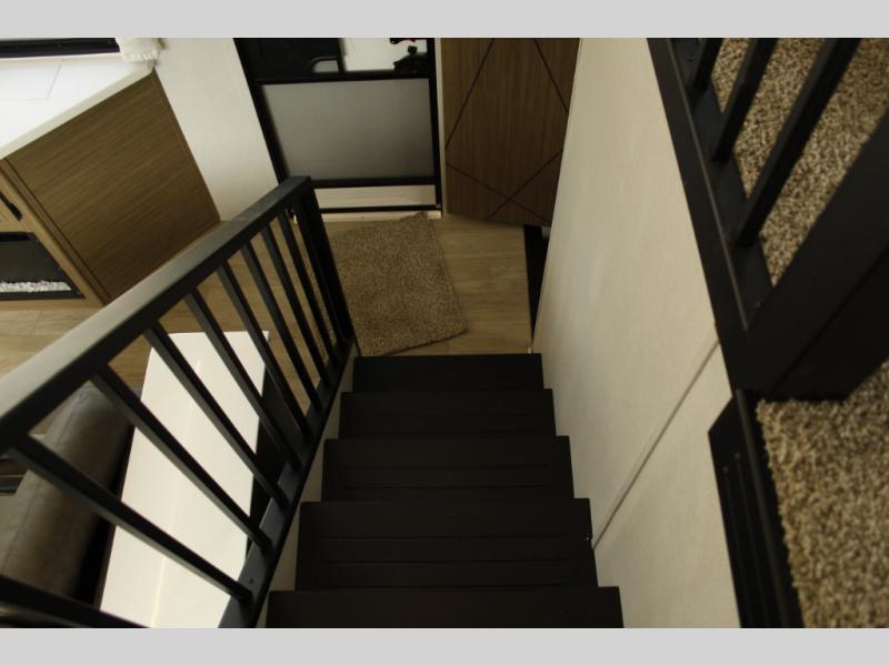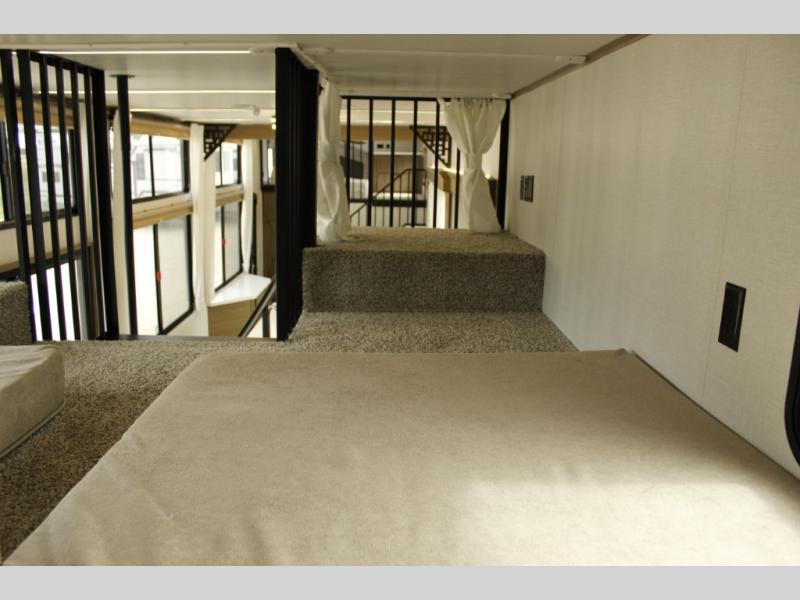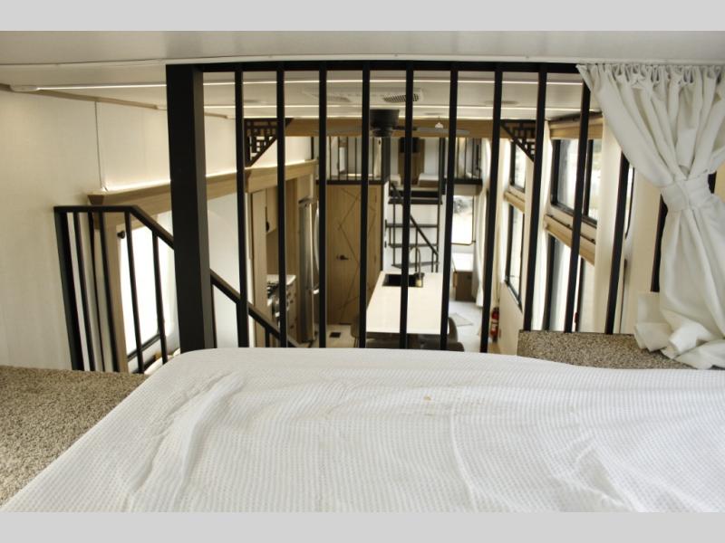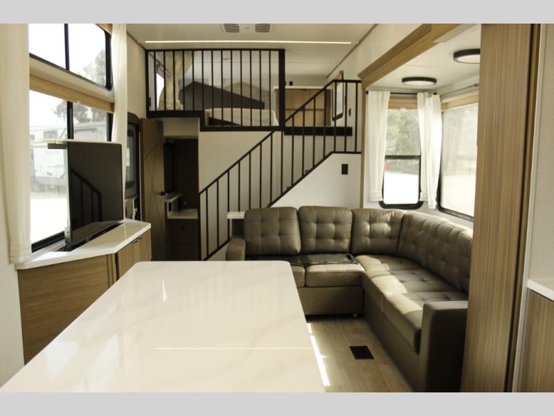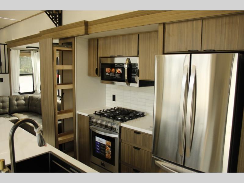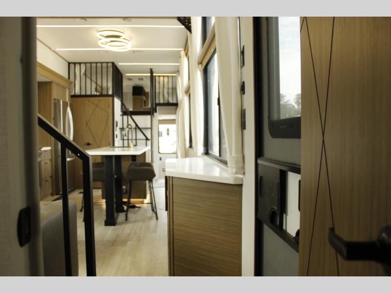 You will feel like you are home when you step inside! Not only will you be impressed with the super large slide in the main combined kitchen and living area, but check out the island with four counter height seats! The main entry closest to the front features a private bedroom with a custom king bed with Versa-Tilt within a slide, plus a fireplace and a dresser for your belongings. Just outside this door is a spiral staircase to the front loft with two 42" x 74" bunk mats above. The kitchen is fully equipped for you to provide the best home cooked meals with a pull-out pantry, range and microwave, plus side-by-side refrigerator. There is also a half bath off of the kitchen for added convenience! An L-shaped sectional sofa with an ottoman provides a cozy space to relax, and there is an entertainment center with a fireplace for a relaxing evenings indoors. A full rear bath features a spacious walk-in shower, a linen closet plus washer and dryer prep for the option to make laundry day easier. And the second loft with stairs is above the bath for even more sleeping space!