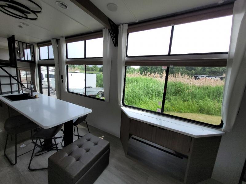 You will feel like you are home when you step inside! Not only will you be impressed with the super large slide in the main combined kitchen and living area, but check out the island with four counter height seats! The main entry closest to the front features a private bedroom with a custom king bed with Versa-Tilt within a slide, plus a fireplace and a dresser for your belongings. Just outside this door is a spiral staircase to the front loft with two 42" x 74" bunk mats above. The kitchen is fully equipped for you to provide the best home cooked meals with a pull-out pantry, range and microwave, plus side-by-side refrigerator. There is also a half bath off of the kitchen for added convenience! An L-shaped sectional sofa with an ottoman provides a cozy space to relax, and there is an entertainment center with a fireplace for a relaxing evenings indoors. A full rear bath features a spacious walk-in shower, a linen closet plus washer and dryer prep for the option to make laundry day easier. And the second loft with stairs is above the bath for even more sleeping space!