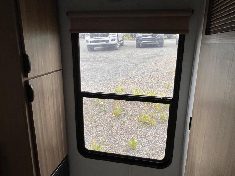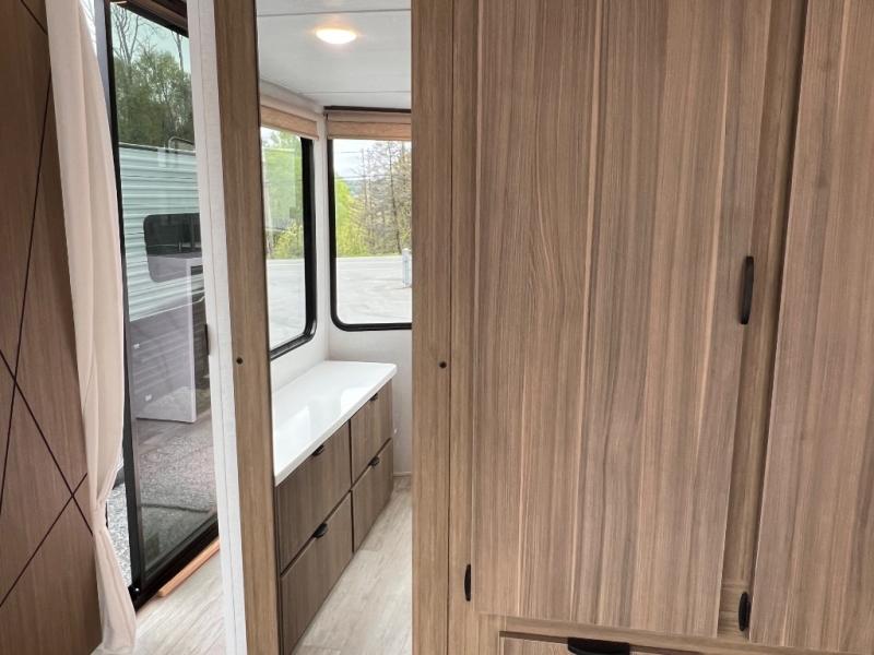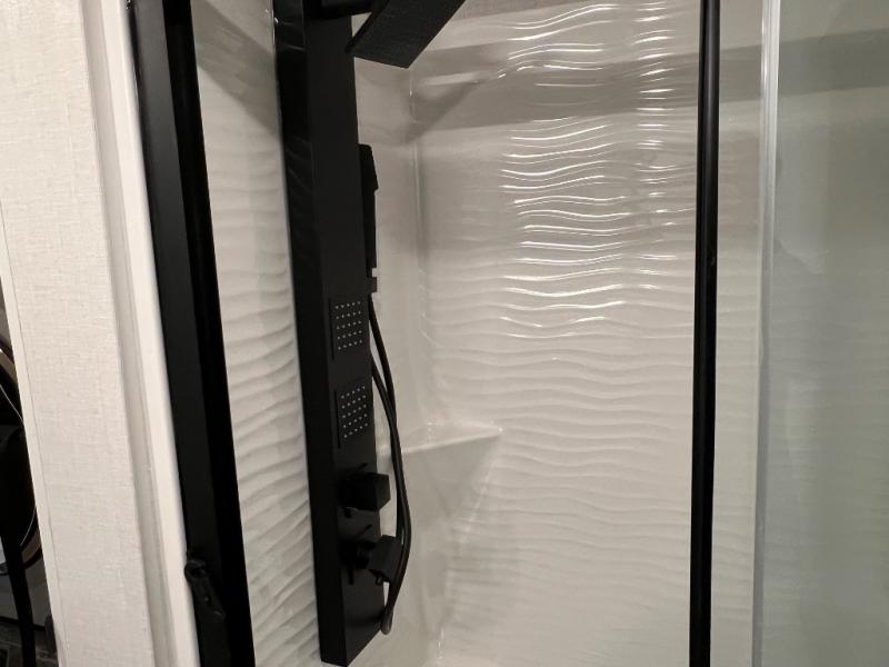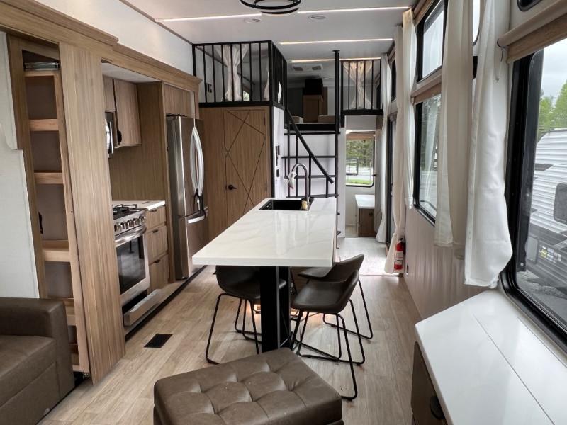 You will feel like you are home when you step inside! Not only will you be impressed with the super large slide in the main combined kitchen and living area, but check out the island with four counter height seats! The main entry closest to the front features a private bedroom with a custom king bed with Versa-Tilt within a slide, plus a fireplace and a dresser for your belongings. Just outside this door is a spiral staircase to the front loft with two 42" x 74" bunk mats above. The kitchen is fully equipped for you to provide the best home cooked meals with a pull-out pantry, range and microwave, plus side-by-side refrigerator. There is also a half bath off of the kitchen for added convenience! An L-shaped sectional sofa with an ottoman provides a cozy space to relax, and there is an entertainment center with a fireplace for a relaxing evenings indoors. A full rear bath features a spacious walk-in shower, a linen closet plus washer and dryer prep for the option to make laundry day easier. And the second loft with stairs is above the bath for even more sleeping space!