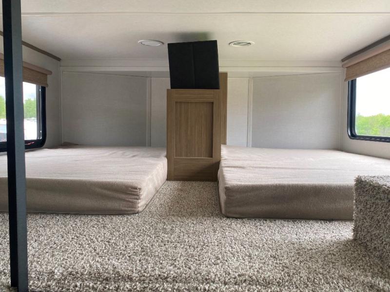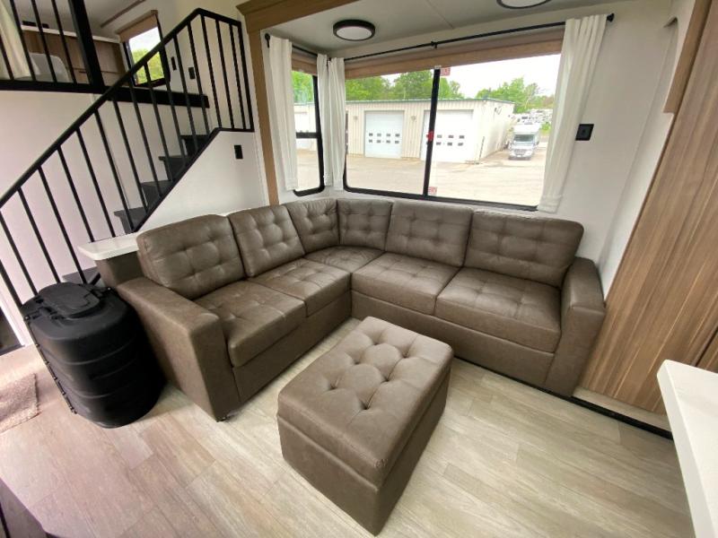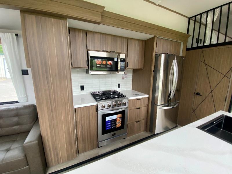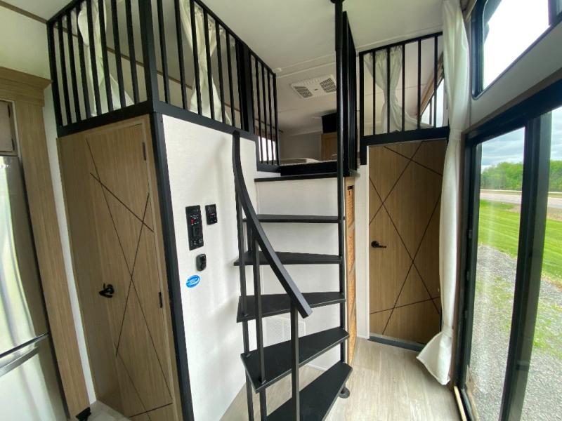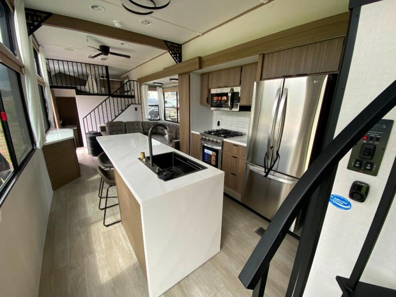 You will feel like you are home when you step inside! Not only will you be impressed with the super large slide in the main combined kitchen and living area, but check out the island with four counter height seats! The main entry closest to the front features a private bedroom with a custom king bed with Versa-Tilt within a slide, plus a fireplace and a dresser for your belongings. Just outside this door is a spiral staircase to the front loft with two 42" x 74" bunk mats above. The kitchen is fully equipped for you to provide the best home cooked meals with a pull-out pantry, range and microwave, plus side-by-side refrigerator. There is also a half bath off of the kitchen for added convenience! An L-shaped sectional sofa with an ottoman provides a cozy space to relax, and there is an entertainment center with a fireplace for a relaxing evenings indoors. A full rear bath features a spacious walk-in shower, a linen closet plus washer and dryer prep for the option to make laundry day easier. And the second loft with stairs is above the bath for even more sleeping space!