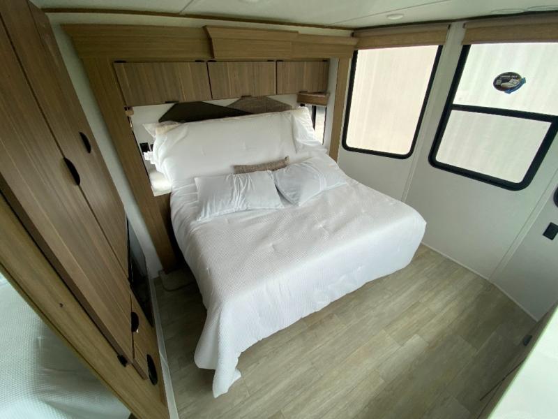 With any Wildwood Grand Lodge destination trailer by Forest River, you can enjoy extended stays wherever you go! There is 4K awning blade lighting outside, along with slide out awning toppers, plus a heated and enclosed Accessibelly for added protection. Inside, you'll love the stylish backsplash update, elegant curtain rods and curtains, TFL black walnut entertainment shelves, and stainless steel kitchen appliances. A Serta mattress in the bedroom(s) will provide comfort to each journey, and there is a tankless water heater for hot water when you need it.