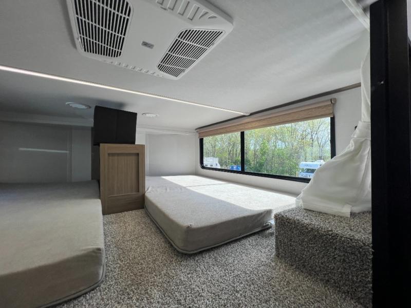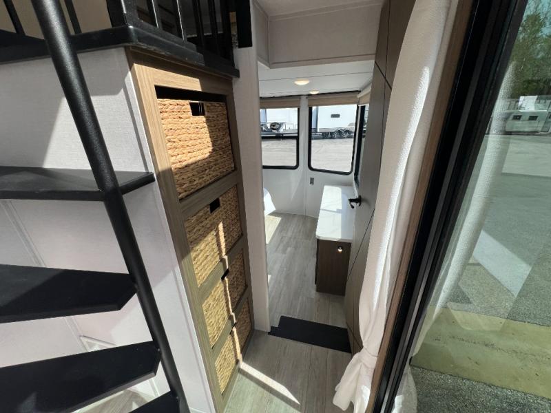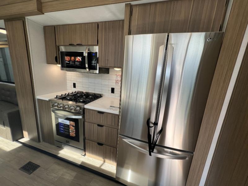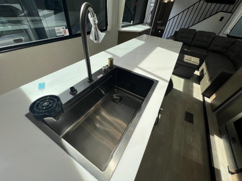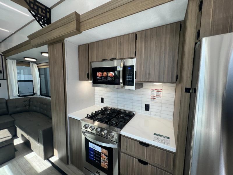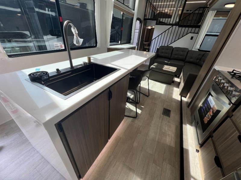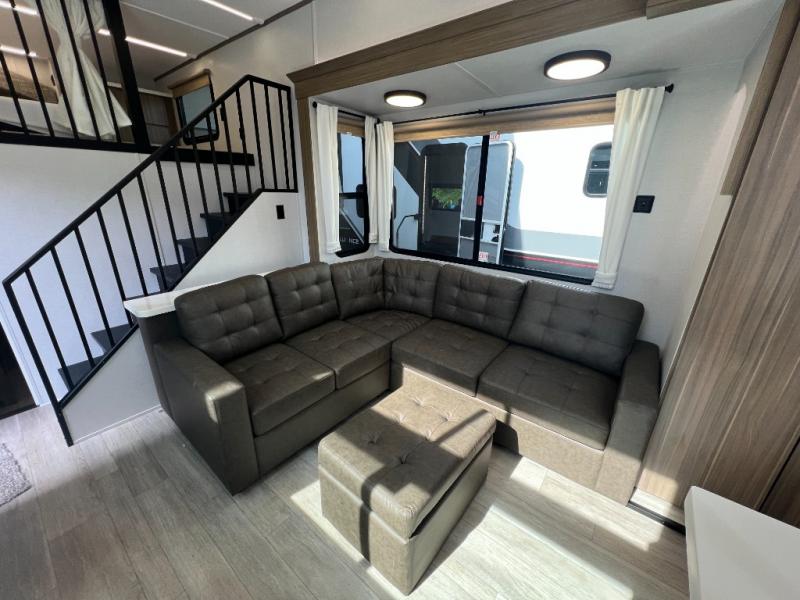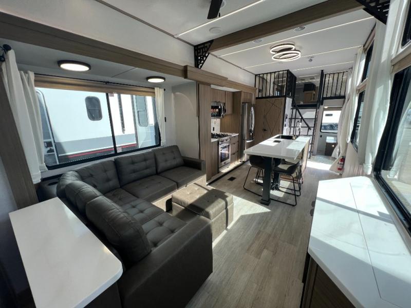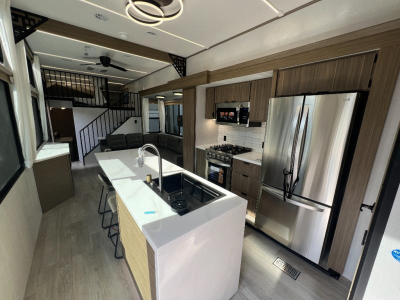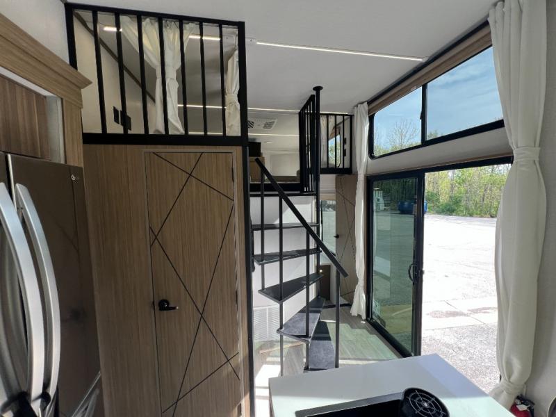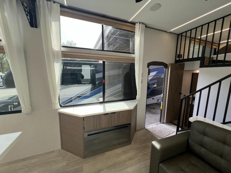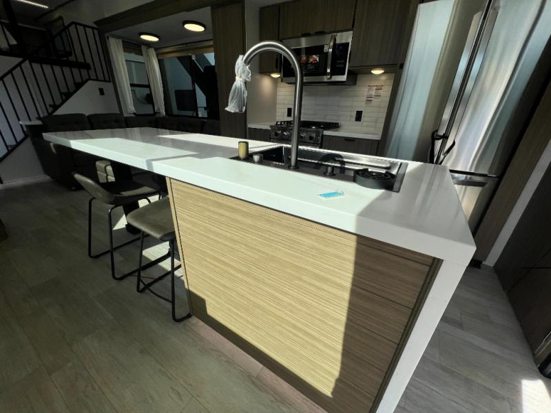 You will feel like you are home when you step inside! Not only will you be impressed with the super large slide in the main combined kitchen and living area, but check out the island with four counter height seats! The main entry closest to the front features a private bedroom with a custom king bed with Versa-Tilt within a slide, plus a fireplace and a dresser for your belongings. Just outside this door is a spiral staircase to the front loft with two 42" x 74" bunk mats above. The kitchen is fully equipped for you to provide the best home cooked meals with a pull-out pantry, range and microwave, plus side-by-side refrigerator. There is also a half bath off of the kitchen for added convenience! An L-shaped sectional sofa with an ottoman provides a cozy space to relax, and there is an entertainment center with a fireplace for a relaxing evenings indoors. A full rear bath features a spacious walk-in shower, a linen closet plus washer and dryer prep for the option to make laundry day easier. And the second loft with stairs is above the bath for even more sleeping space!